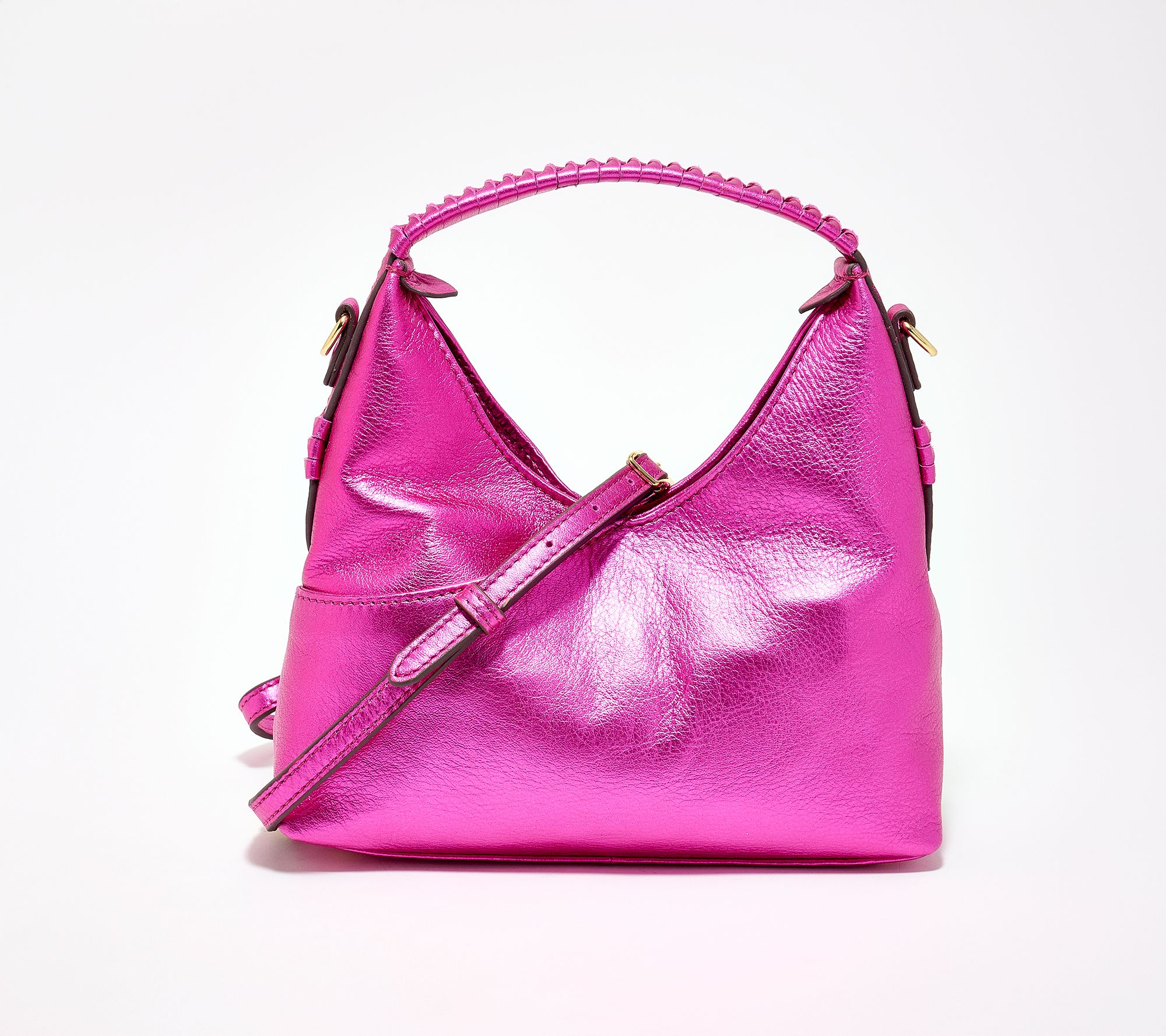 • Braided top handle, adjustable and removable crossbody strap, dome stud feet, front slip pocket, back slip pocket
