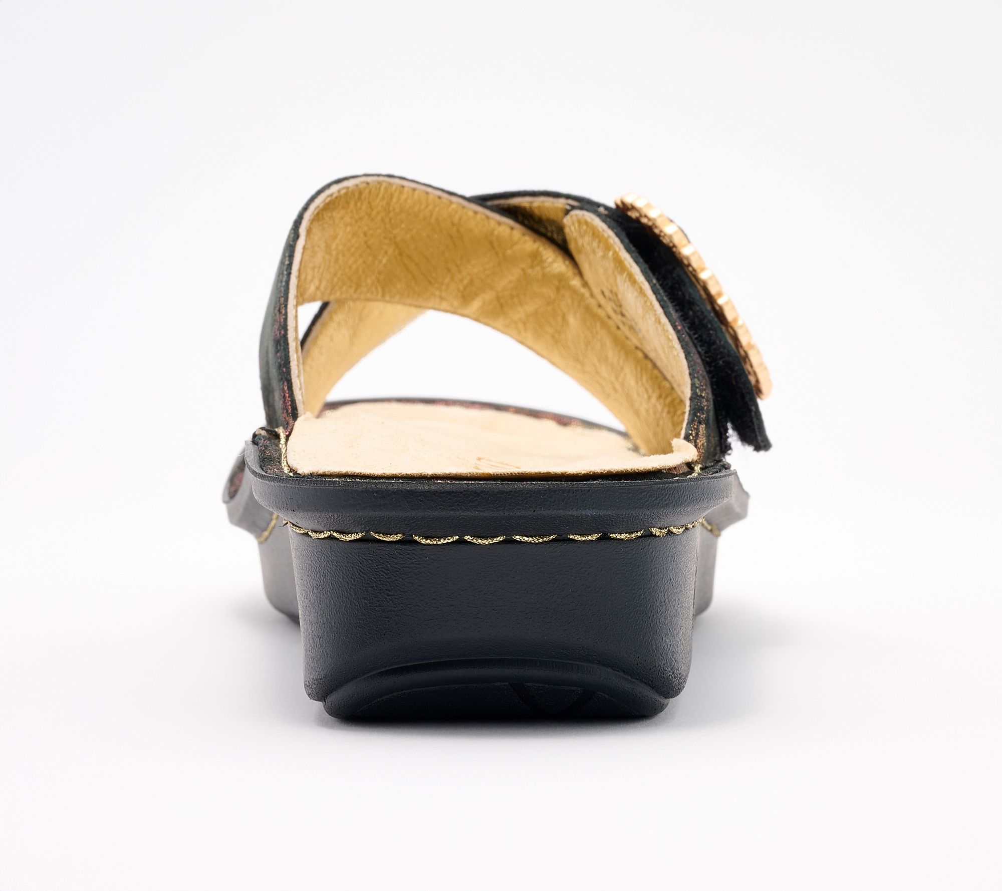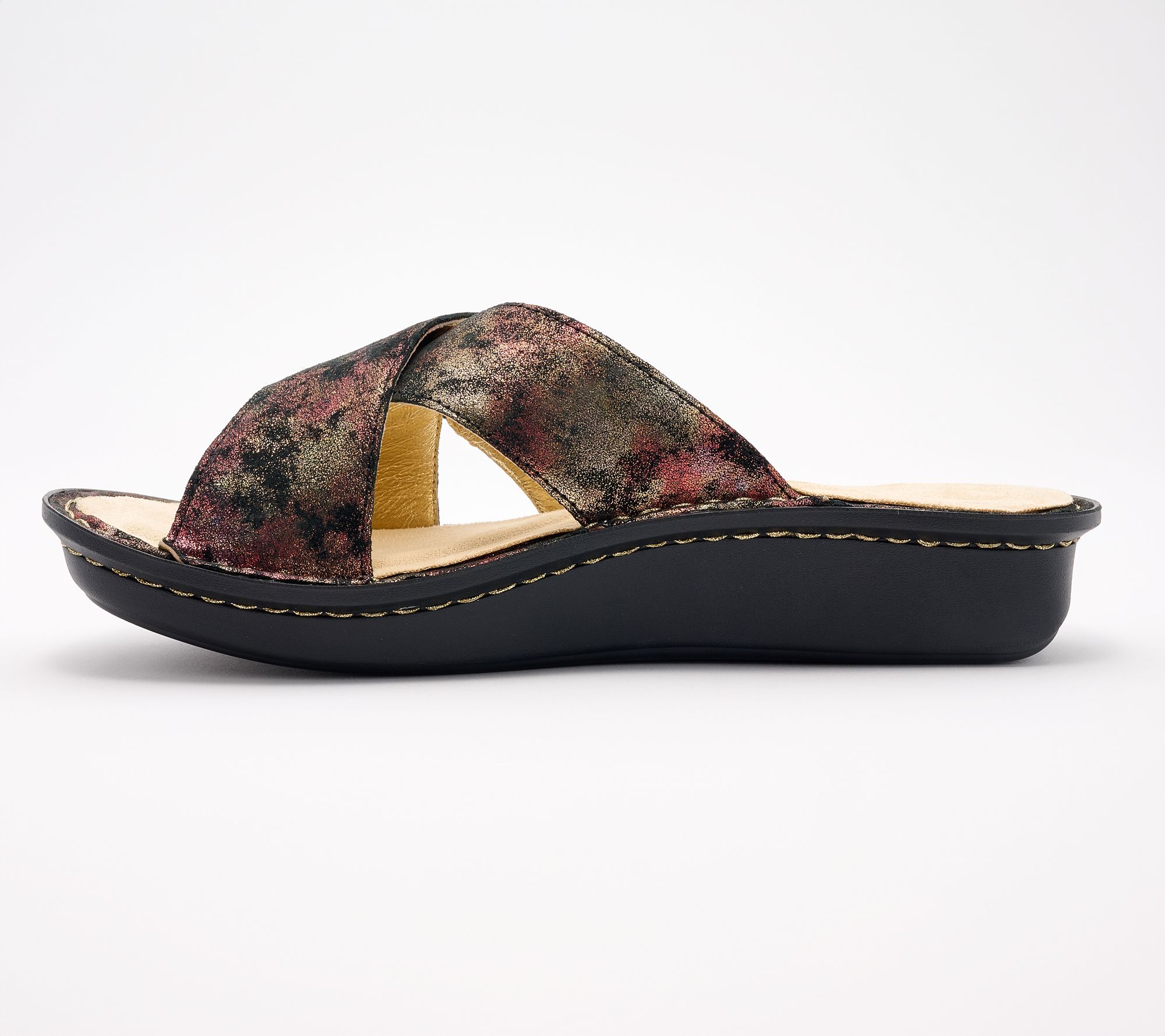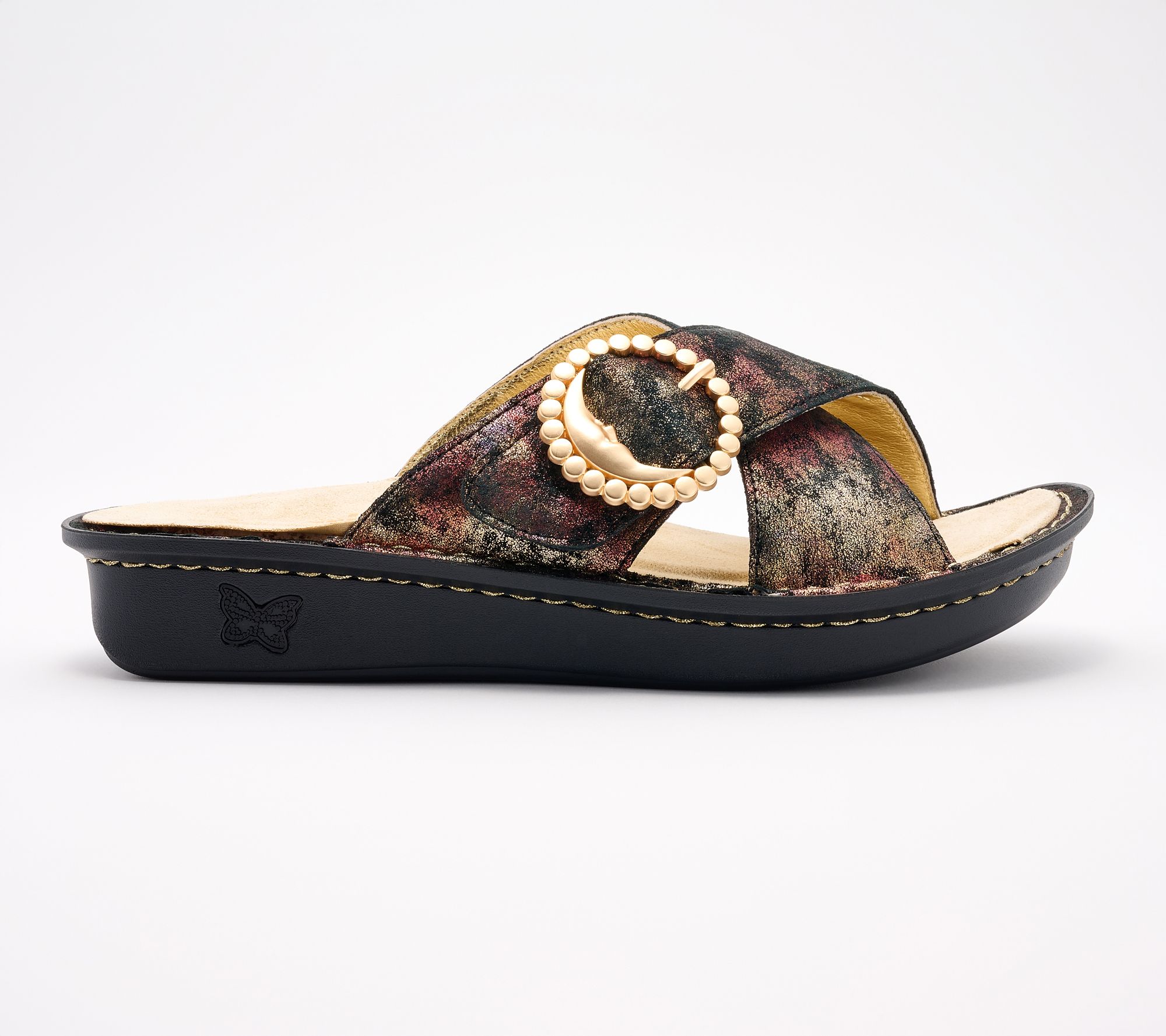 Enjoy easygoing comfort and a touch of charm with these adjustable slide sandals, featuring a leather cross-strap upper and decorative buckle detail. A soft microsuede footbed provides a gentle feel underfoot, making these sandals ideal for transitioning from weekend markets to cozy afternoon walks. From Alegria.