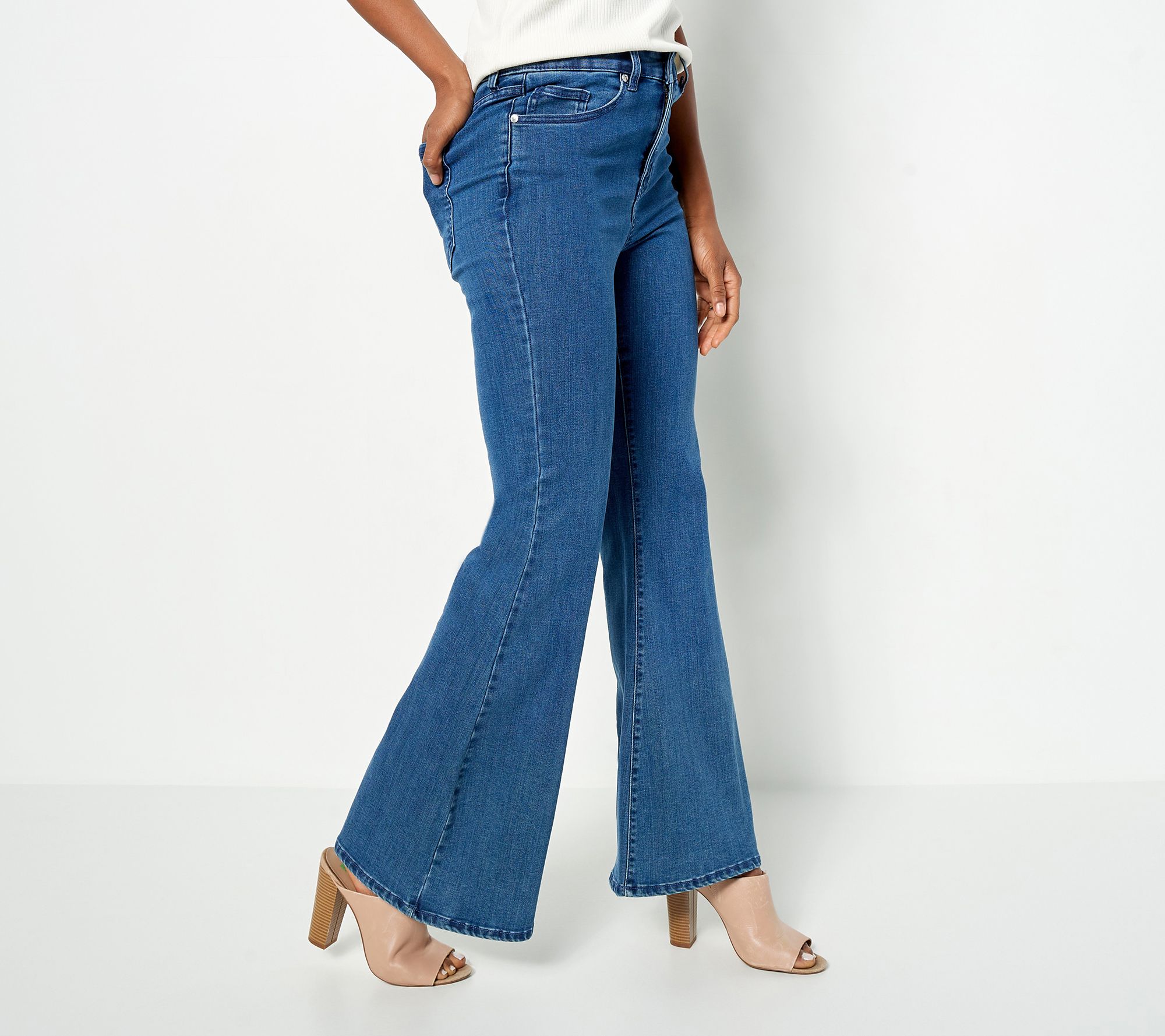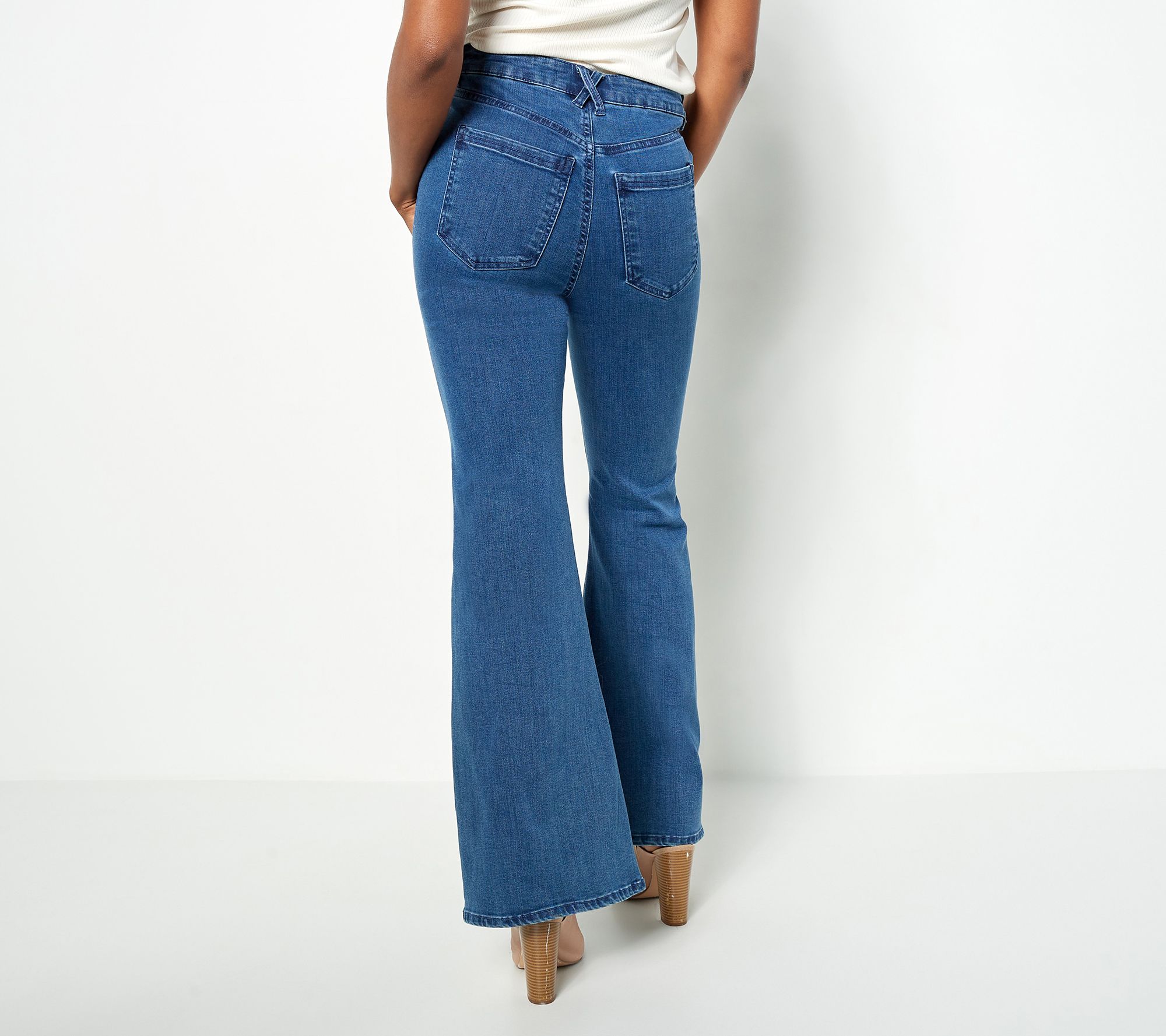 There's no limit to what you can wear with these flare jeans. May we suggest a graphic print tee and chunky heels for a modern twist on a throwback style? From All Worthy Hunter McGrady.