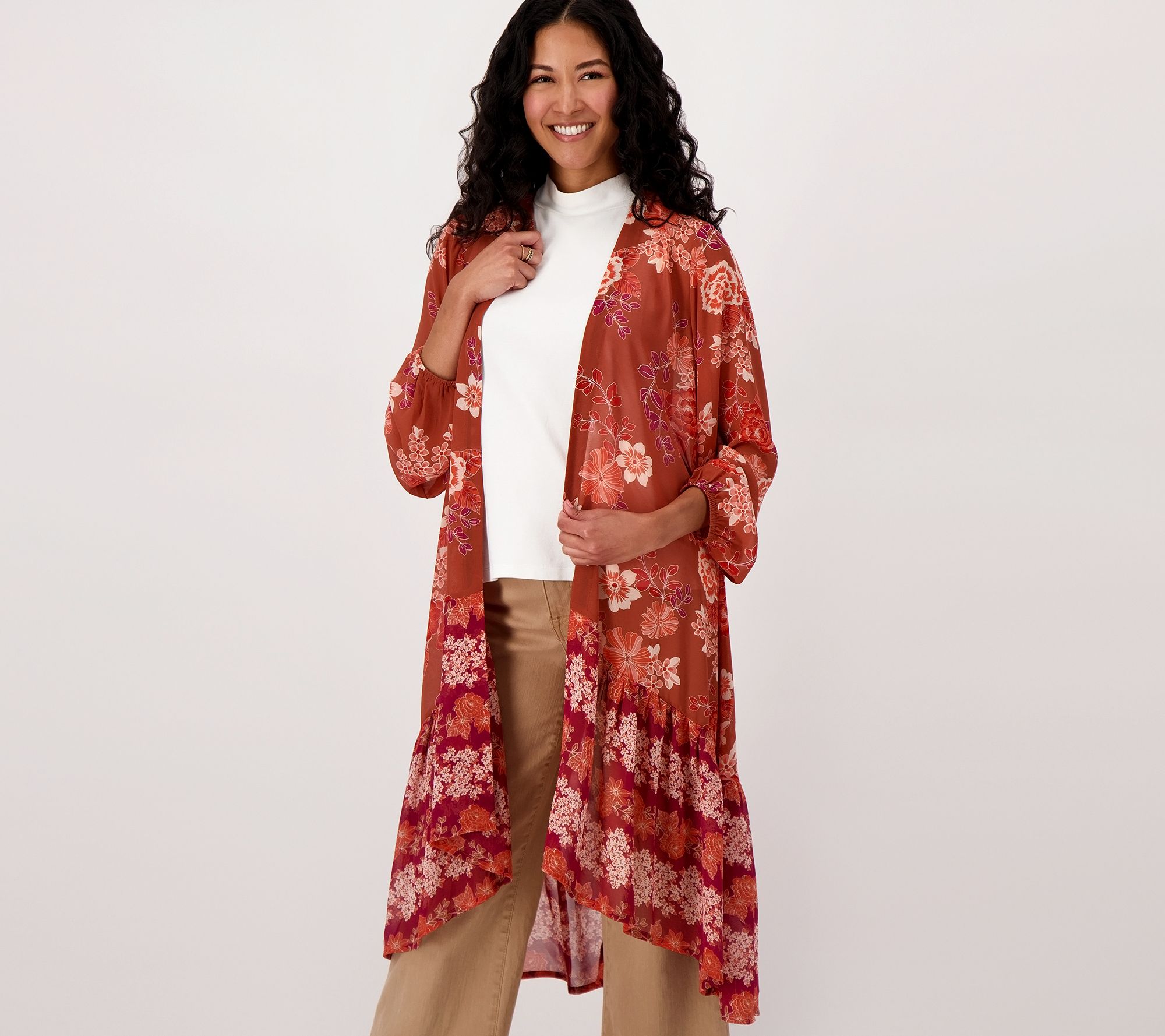 Bring on the blooms with this lovely floral duster. Its petaled print adds a pop of color to any basic 'fit, while being a chic companion (it's basically your new best friend). From All Worthy Hunter McGrady.
