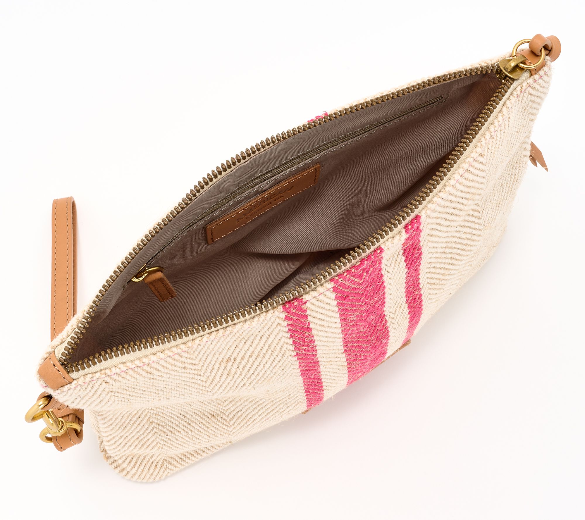 • Pouch: main zip entry, detachable wristlet strap, interior zip pocket, two card slots
