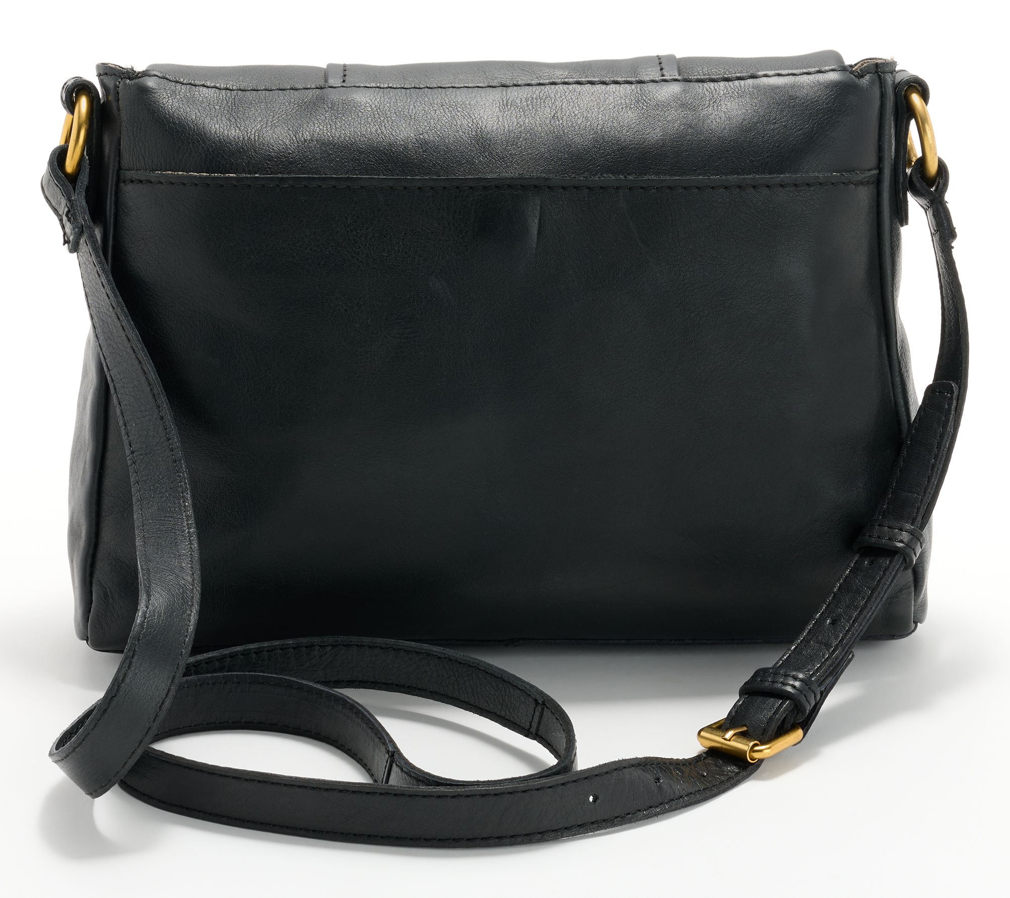 • Washed leather, antiqued hardware, back slip pocket with magnetic snap, front flap with zip pocket, adjustable crossbody strap, magnetic snap at main entry