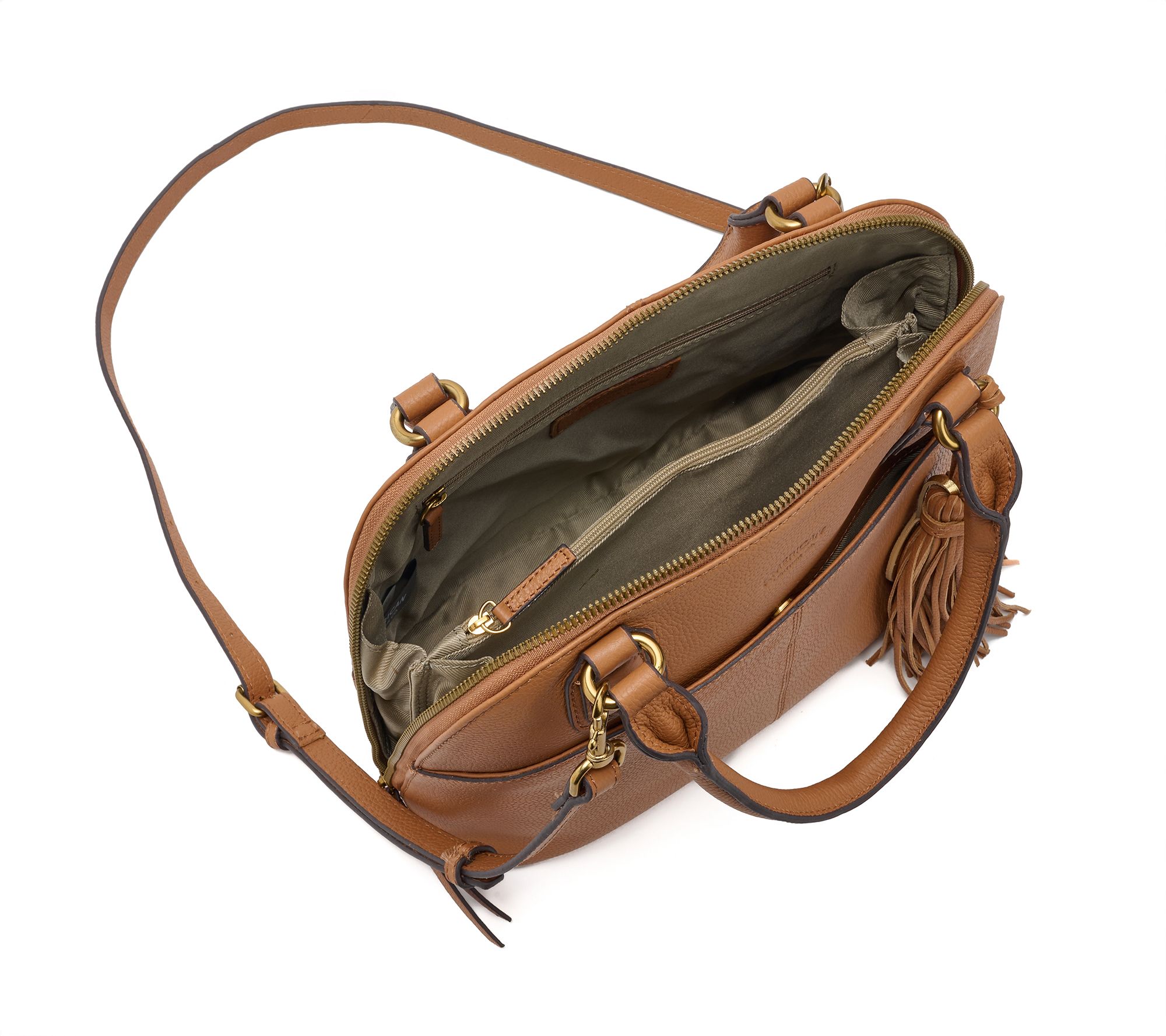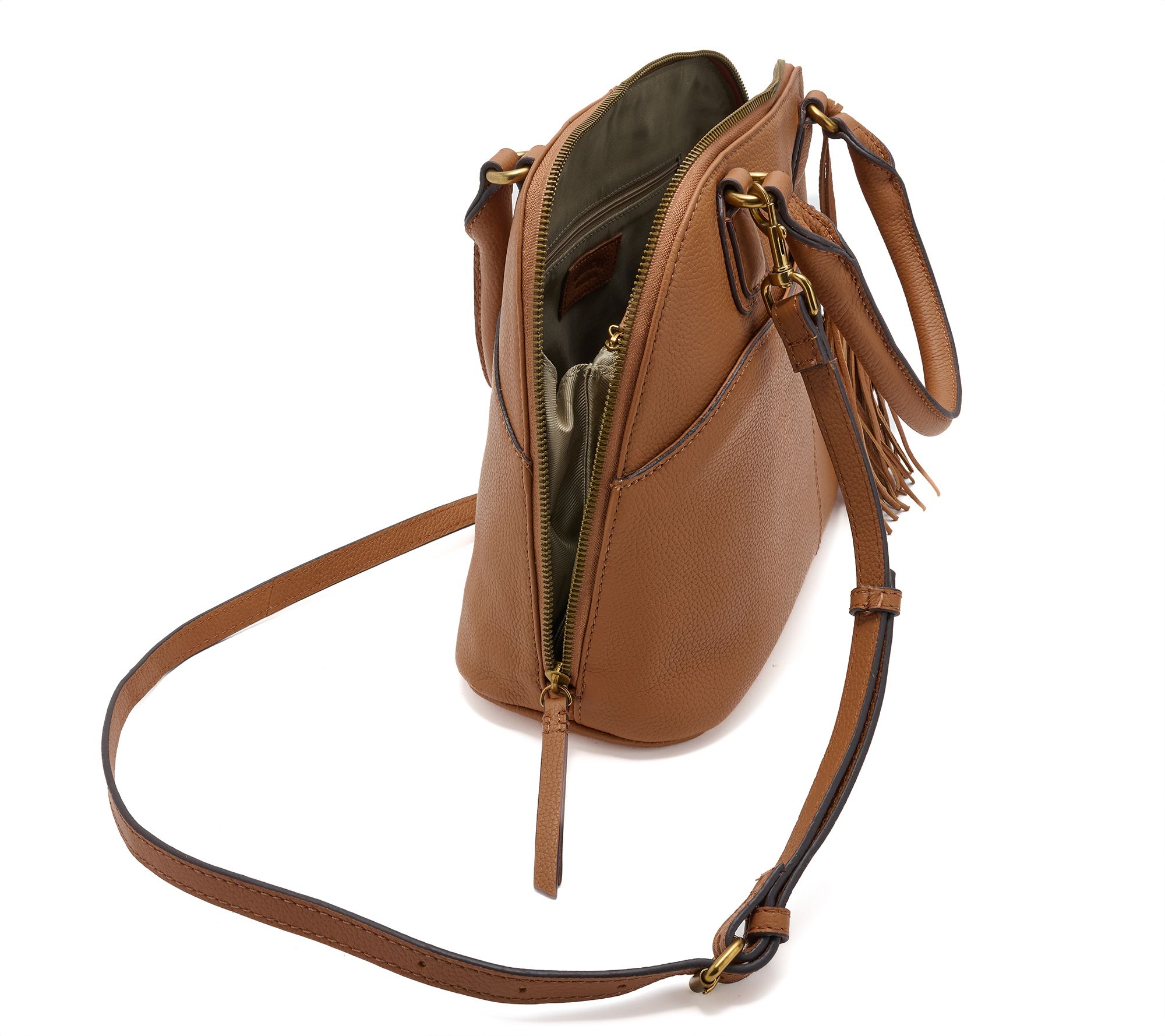 • Pebble leather body, top handle, adjustable/removable crossbody strap, dome stud feet, decorative tassel, front slip pocket with magnetic snap closure