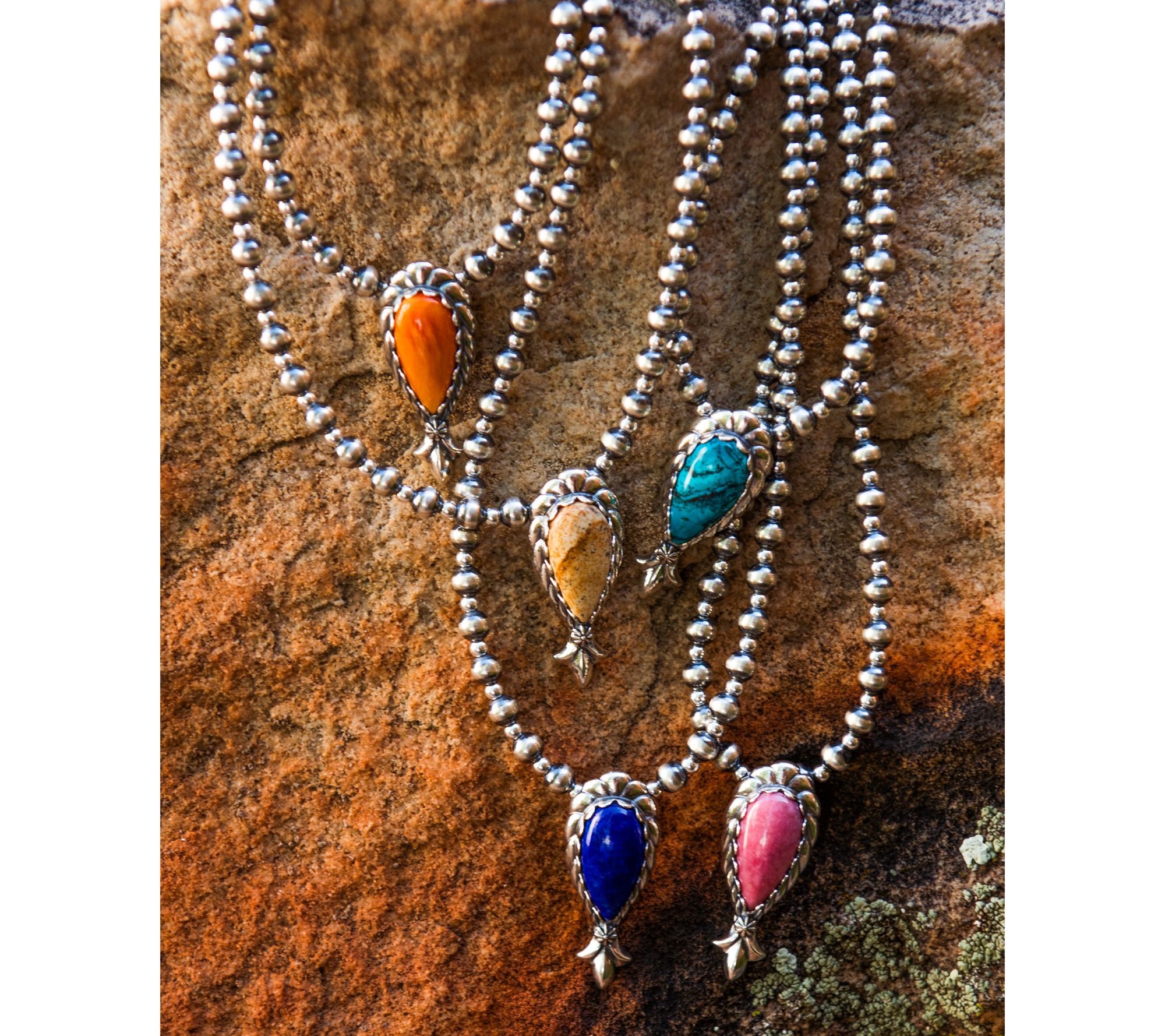 • Serrated bezel-set gemstone pendant with rope and squash blossom; striped and polished beads; pendant is not removable
