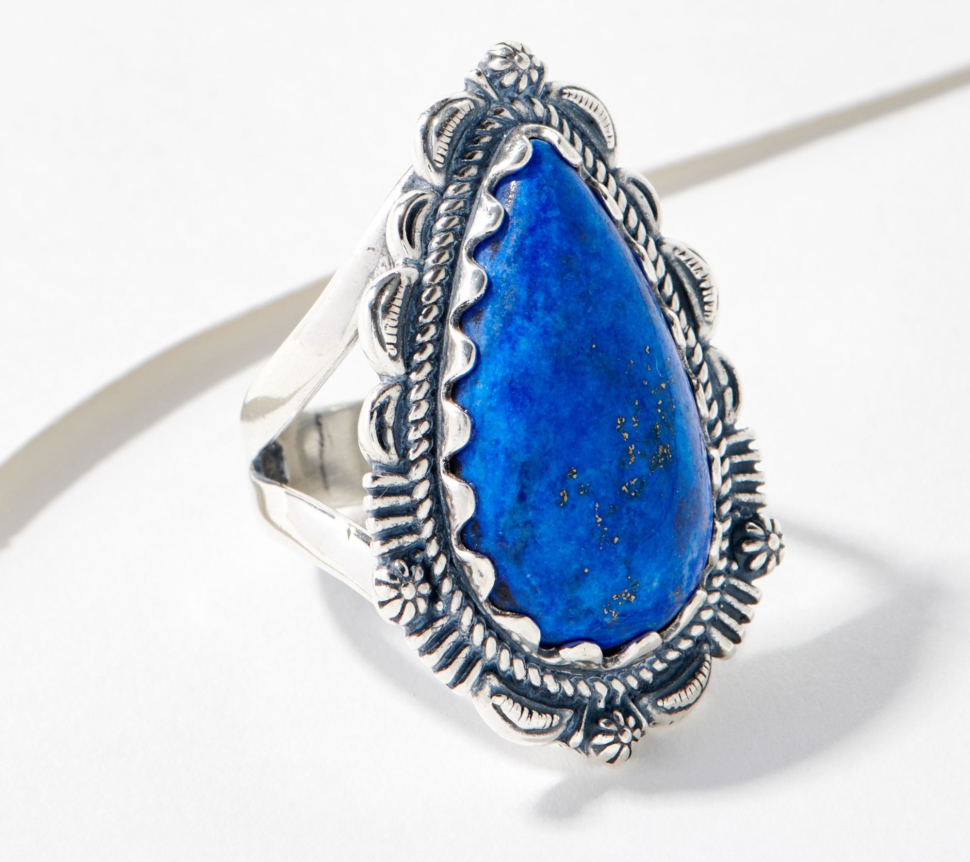 • Split-shank; pear-shaped gemstone; rope texture and flower accents; oxidized finish