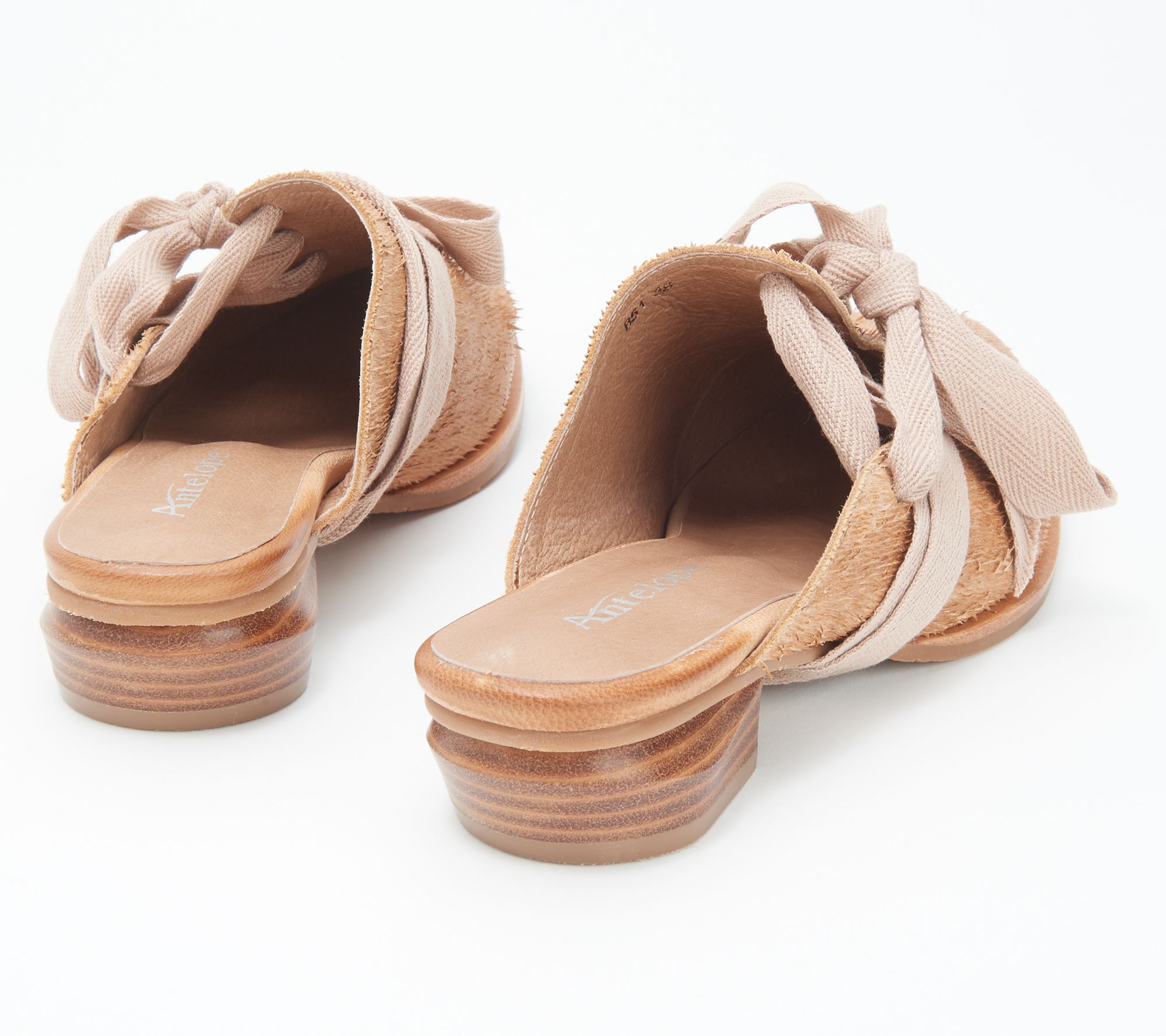A cotton bow embellishment adds ladylike charm to these lovely leather mules. From Antelope.