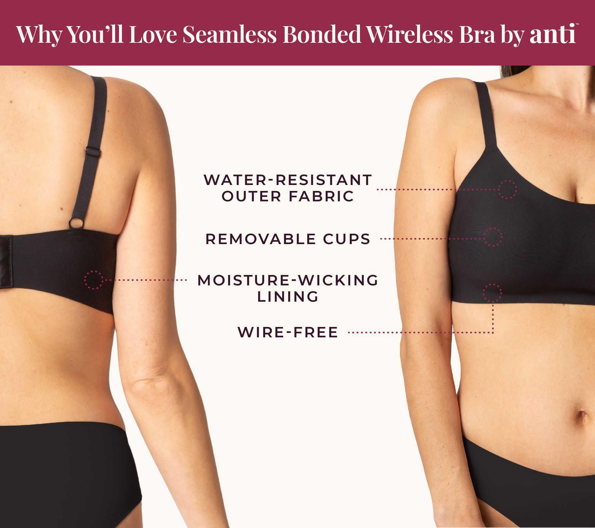 Your new go-to for workouts and more, this wireless bonded bra provides seamless support in a wicking (and water-repellant) fabric to help you stay comfortably cool. From Anti x Proof.