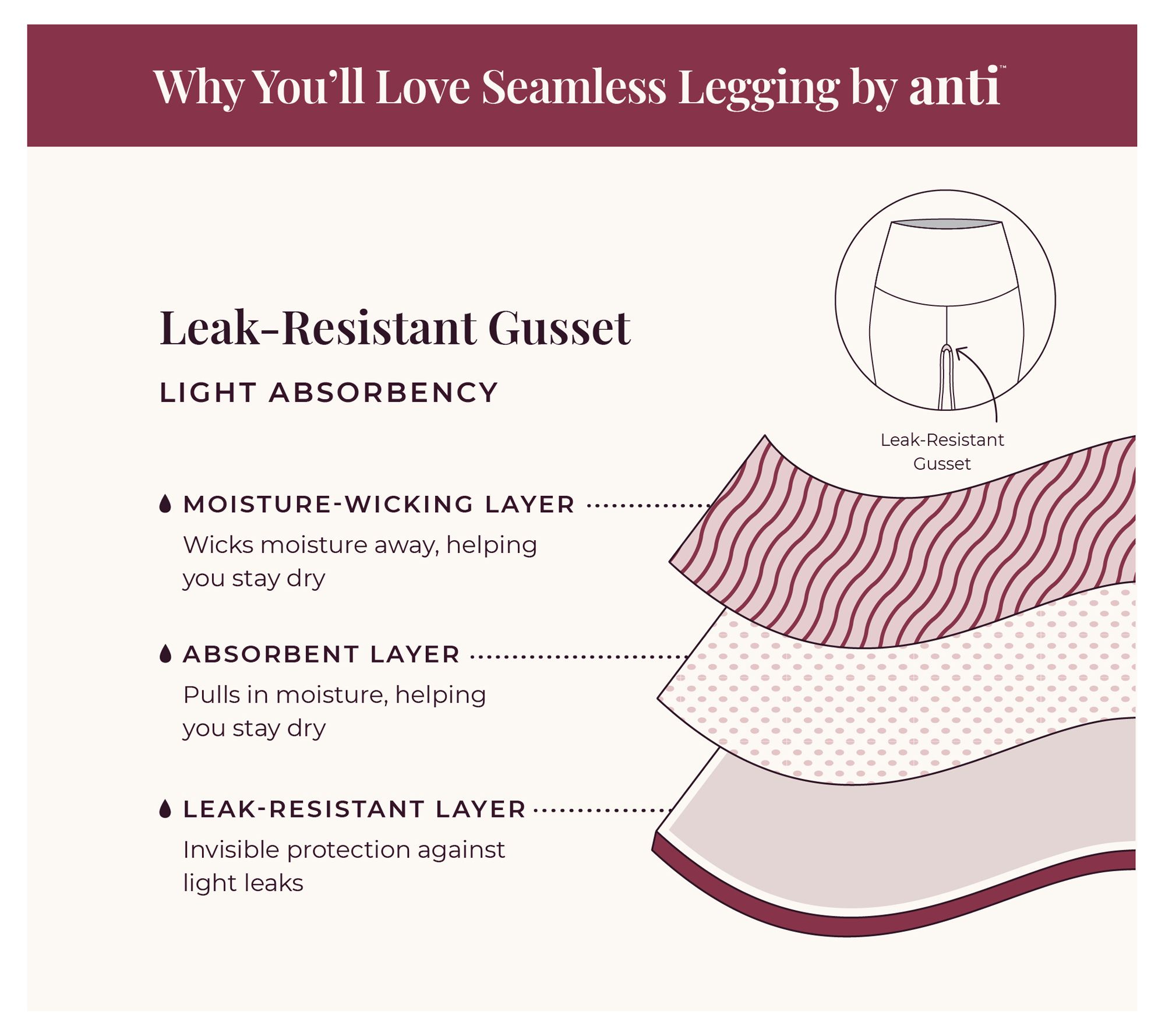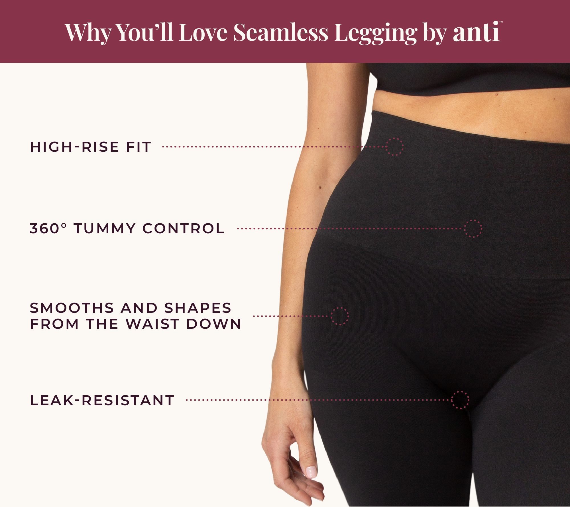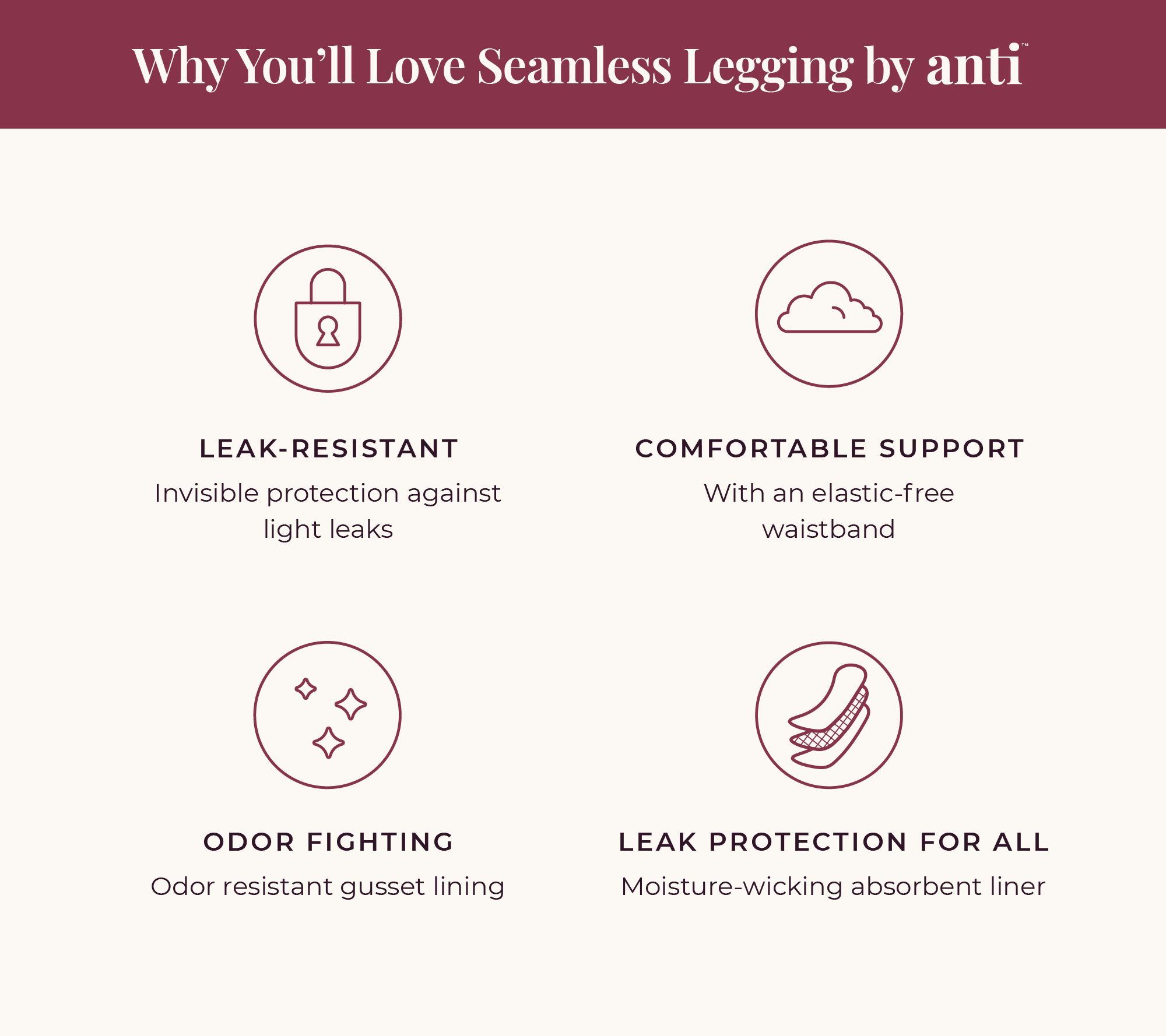 • Features: pull-on style, targeted compression in the leg, smoothing effect in tummy panel, leak-resistant gusset, seamless fabrication, moisture-wicking, built-in waterproof liner, absorbent, odor-resistant
