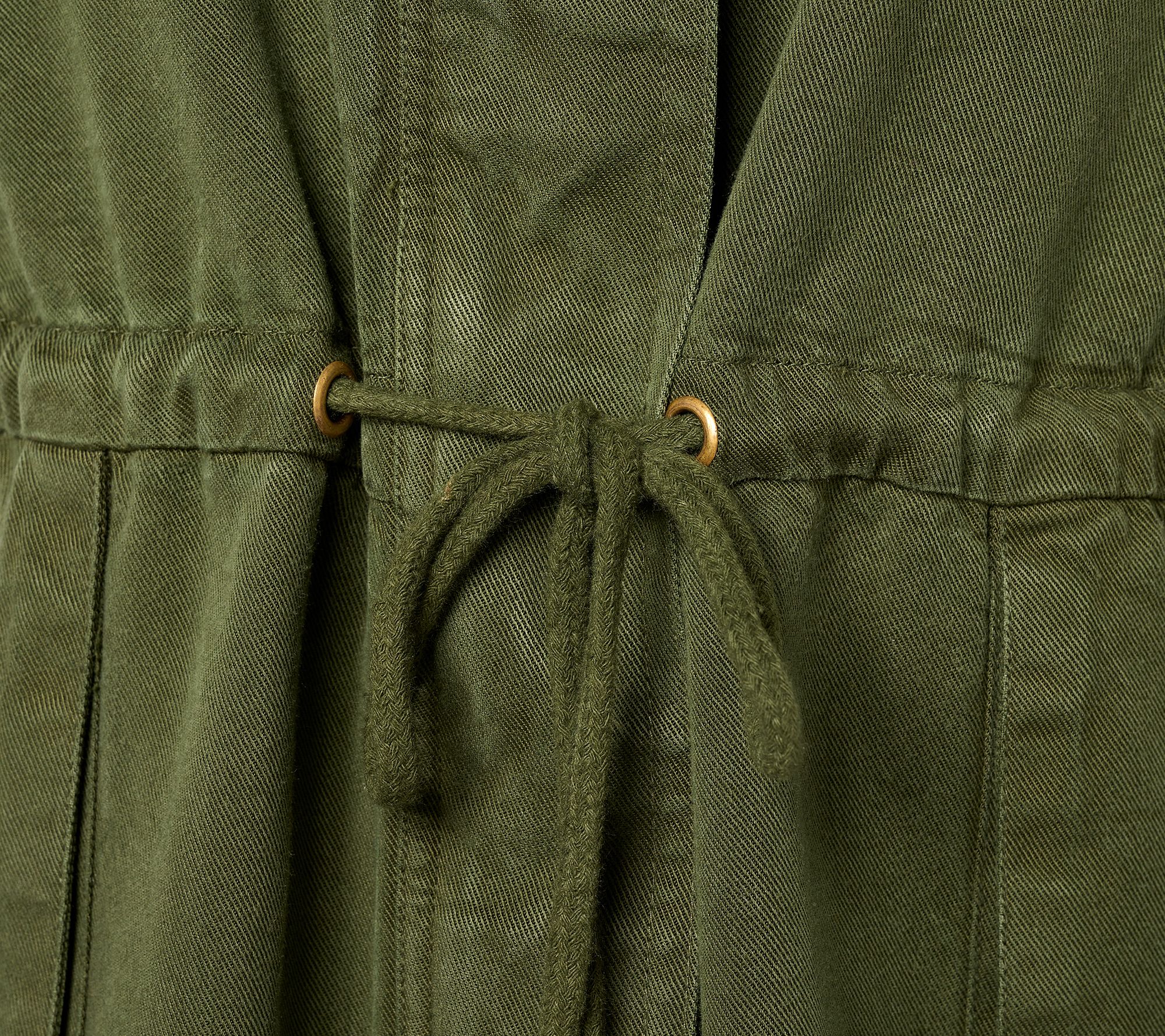 • Features: self collar with collar extension and functional snaps, pockets, front and back yoke, waist with drawcord, side slit