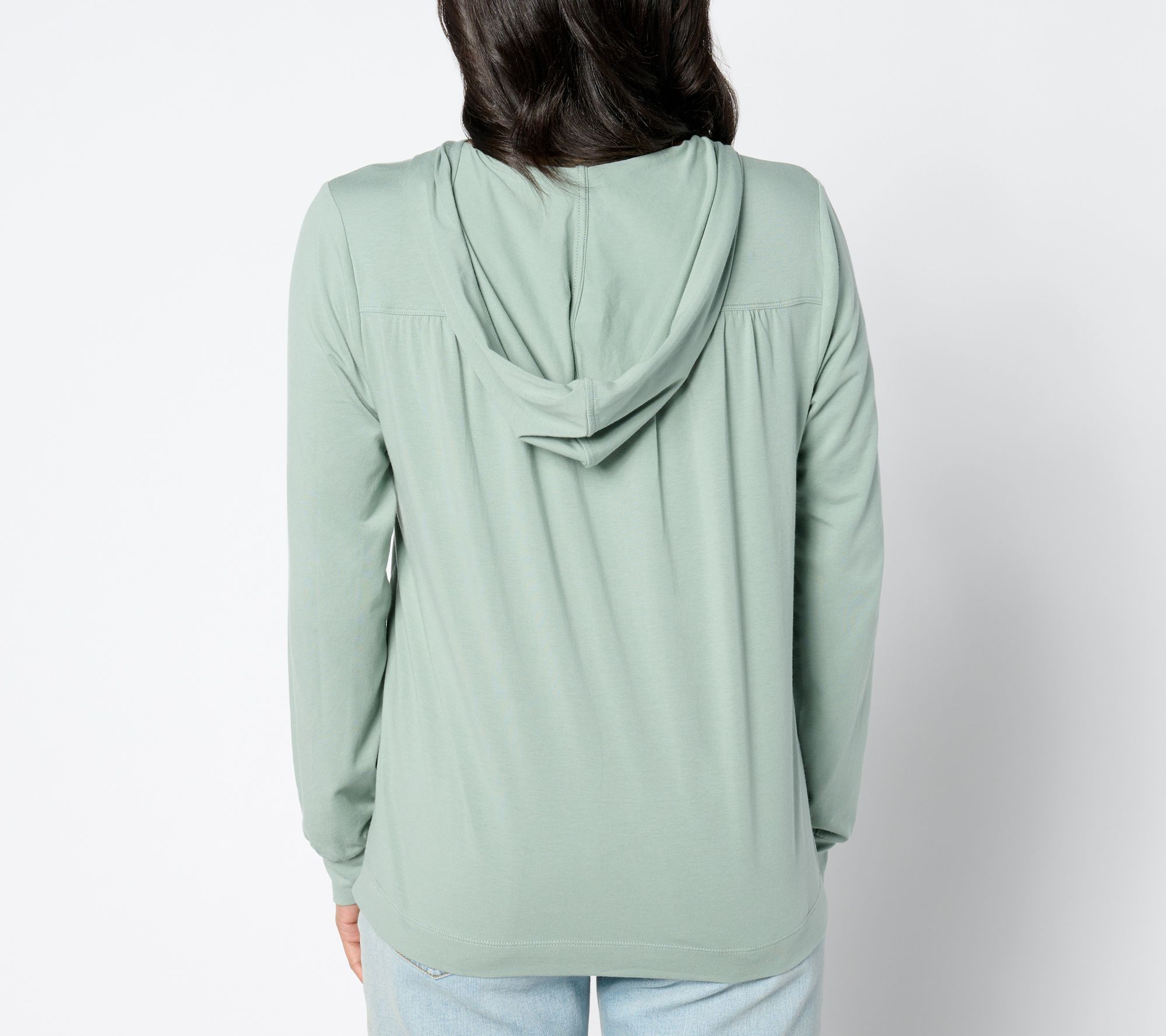 Cozy, comfy, and oh-so cute, this knit top is fashioned with a hood, V-neckline, and long sleeves. The relaxed fit makes it ideal for weekend lounging. From AnyBody®.
