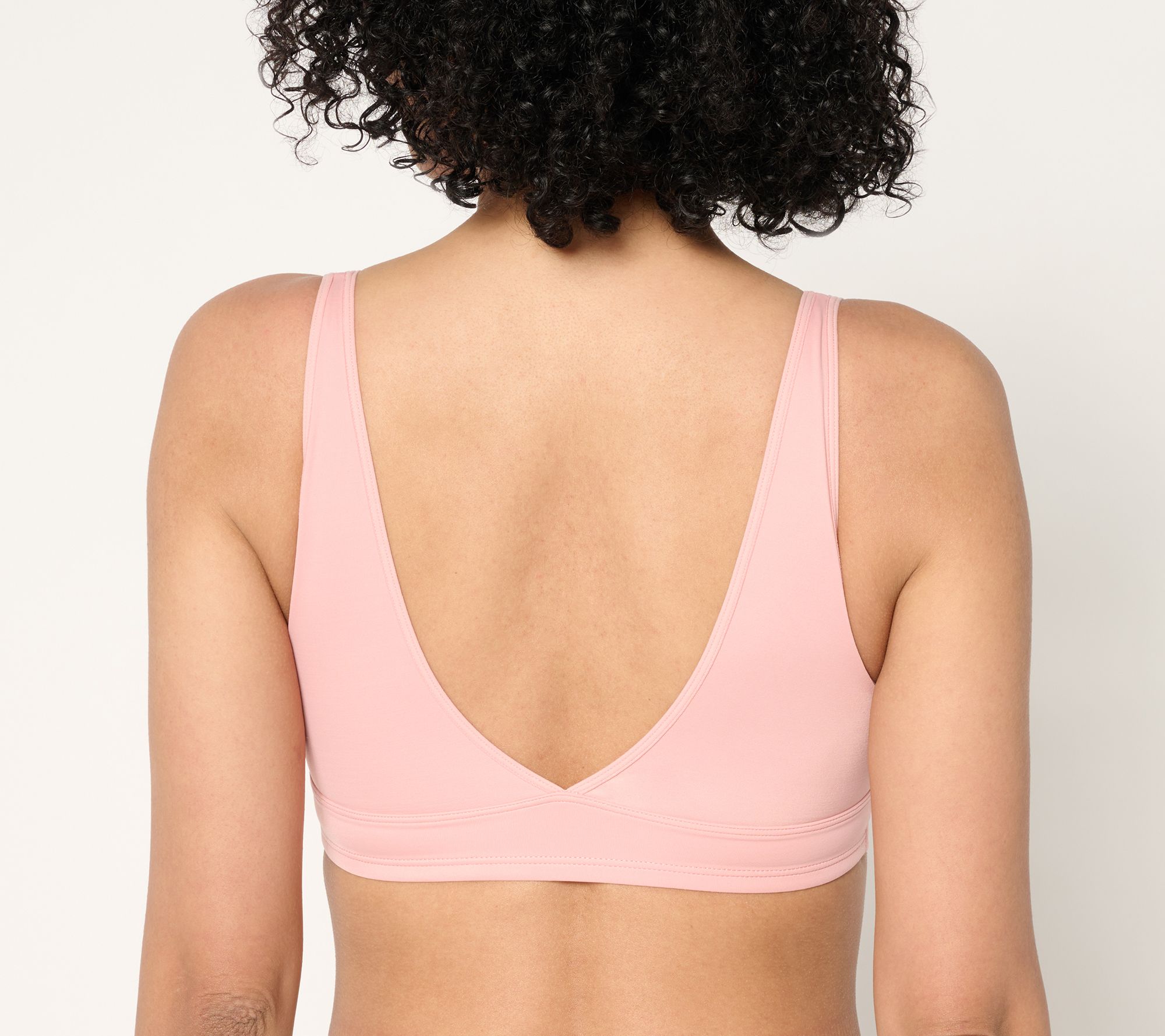 • Features: easy-on/easy-off pullover style, removable fully molded cups with padding, deep neckline, V-shaped back bodice, elastic bottom band, two-ply back panels for smoothing effect