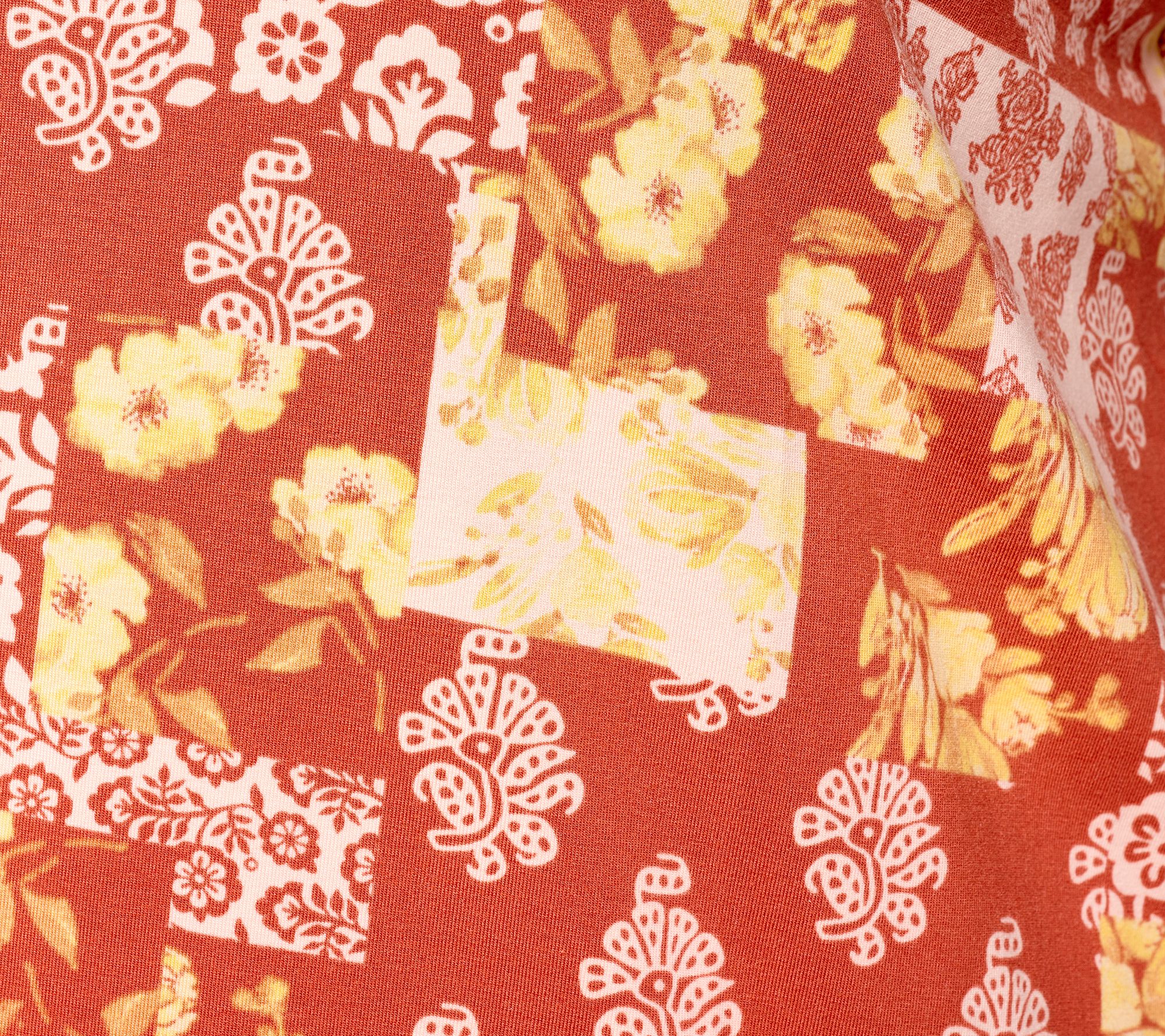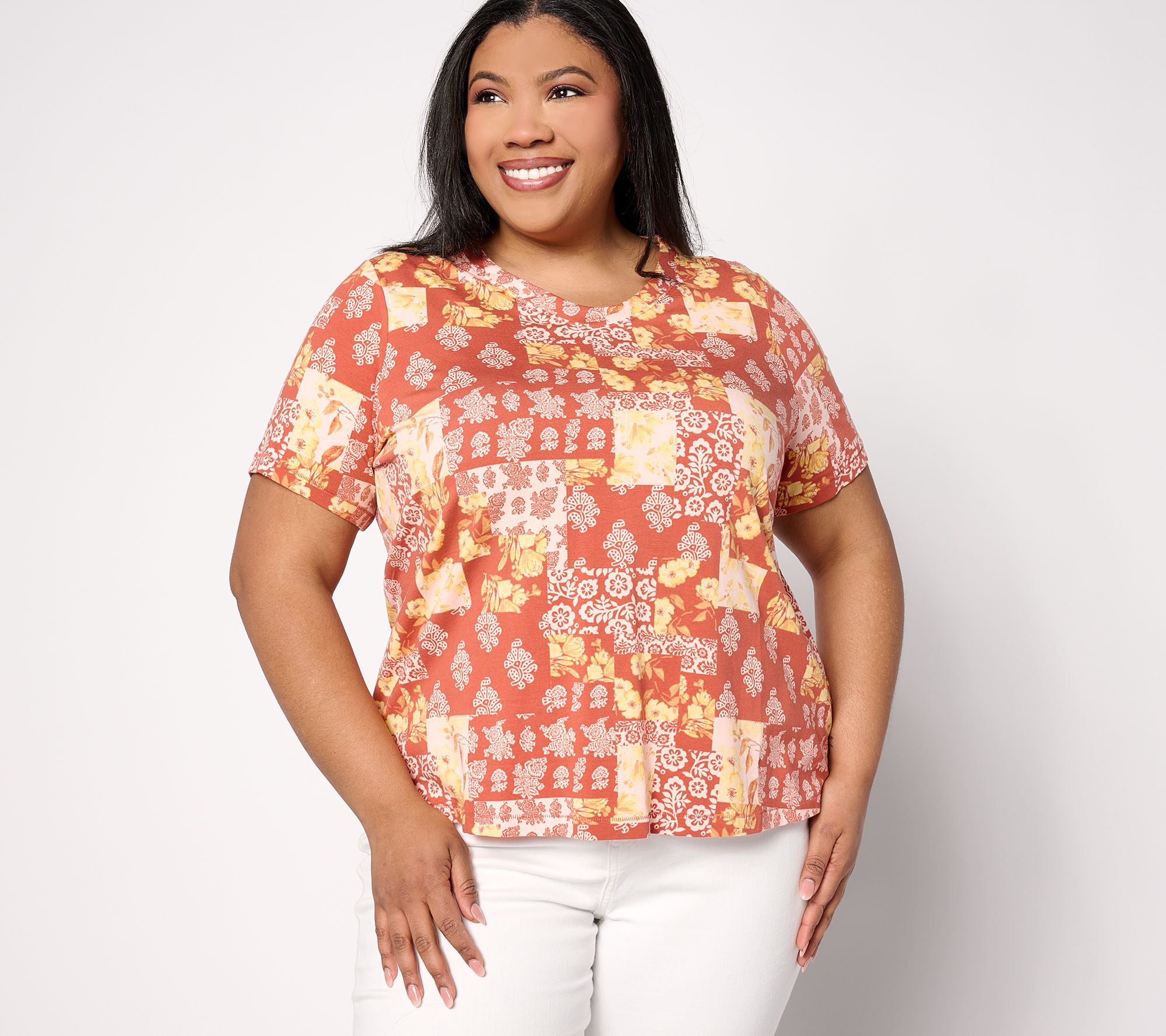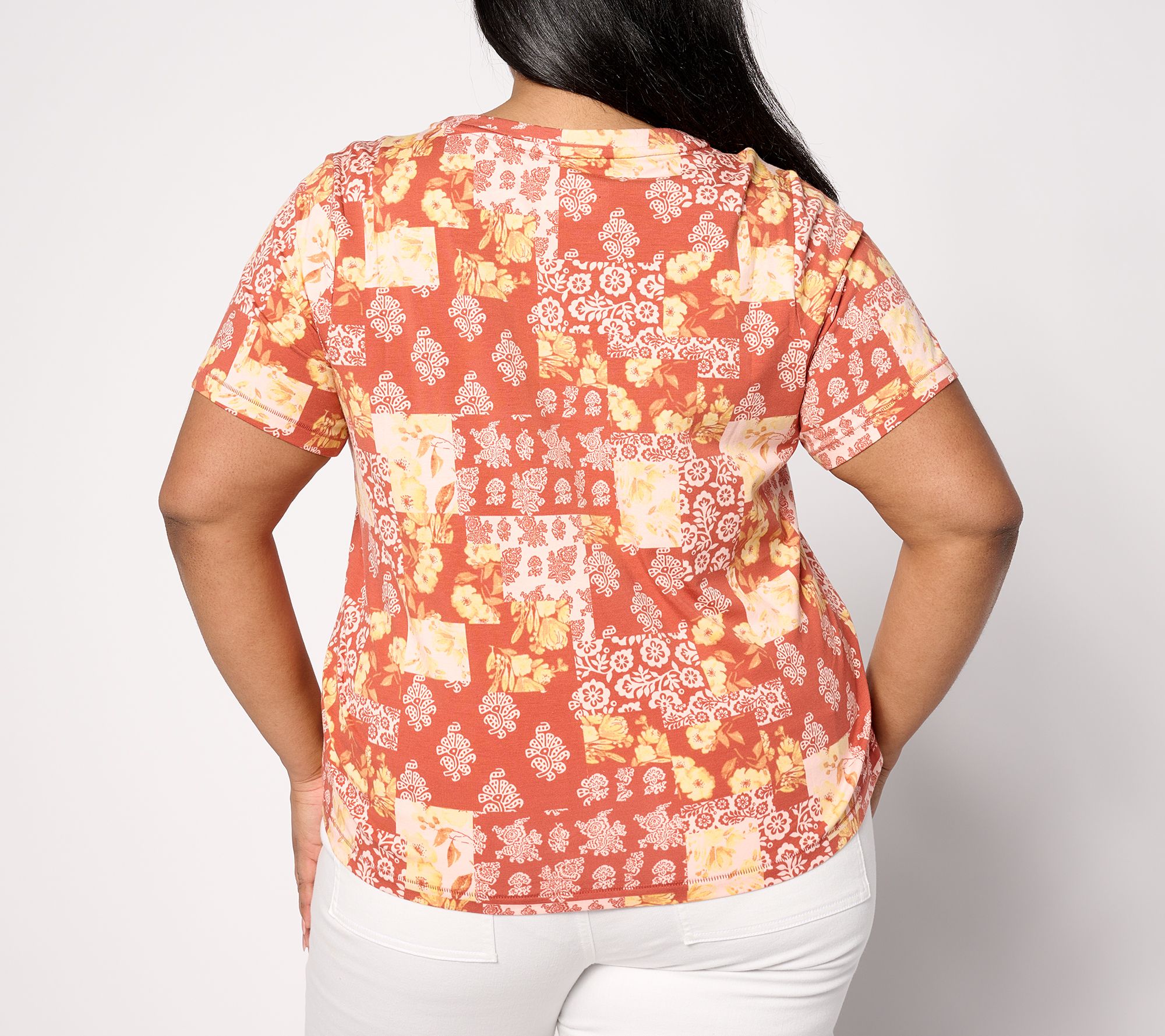 • Features: allover print, scoop neckline, V-neckline, short sleeves, bite stitch hems, straight bottom hem