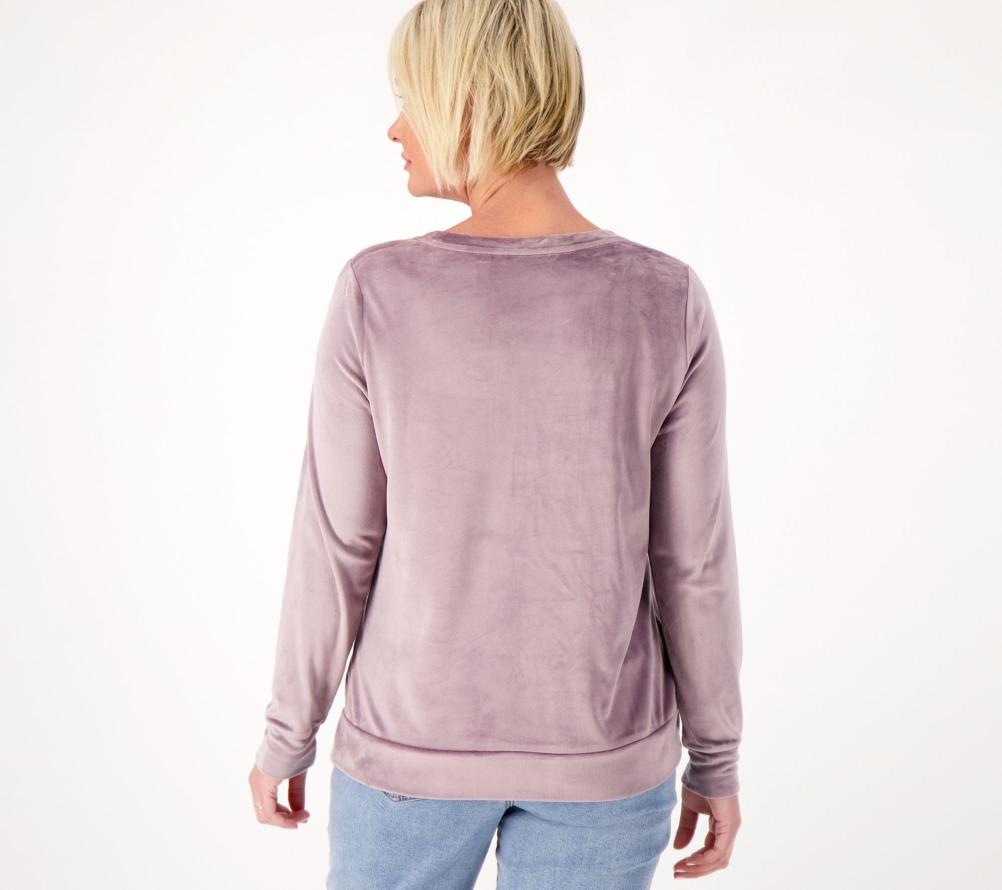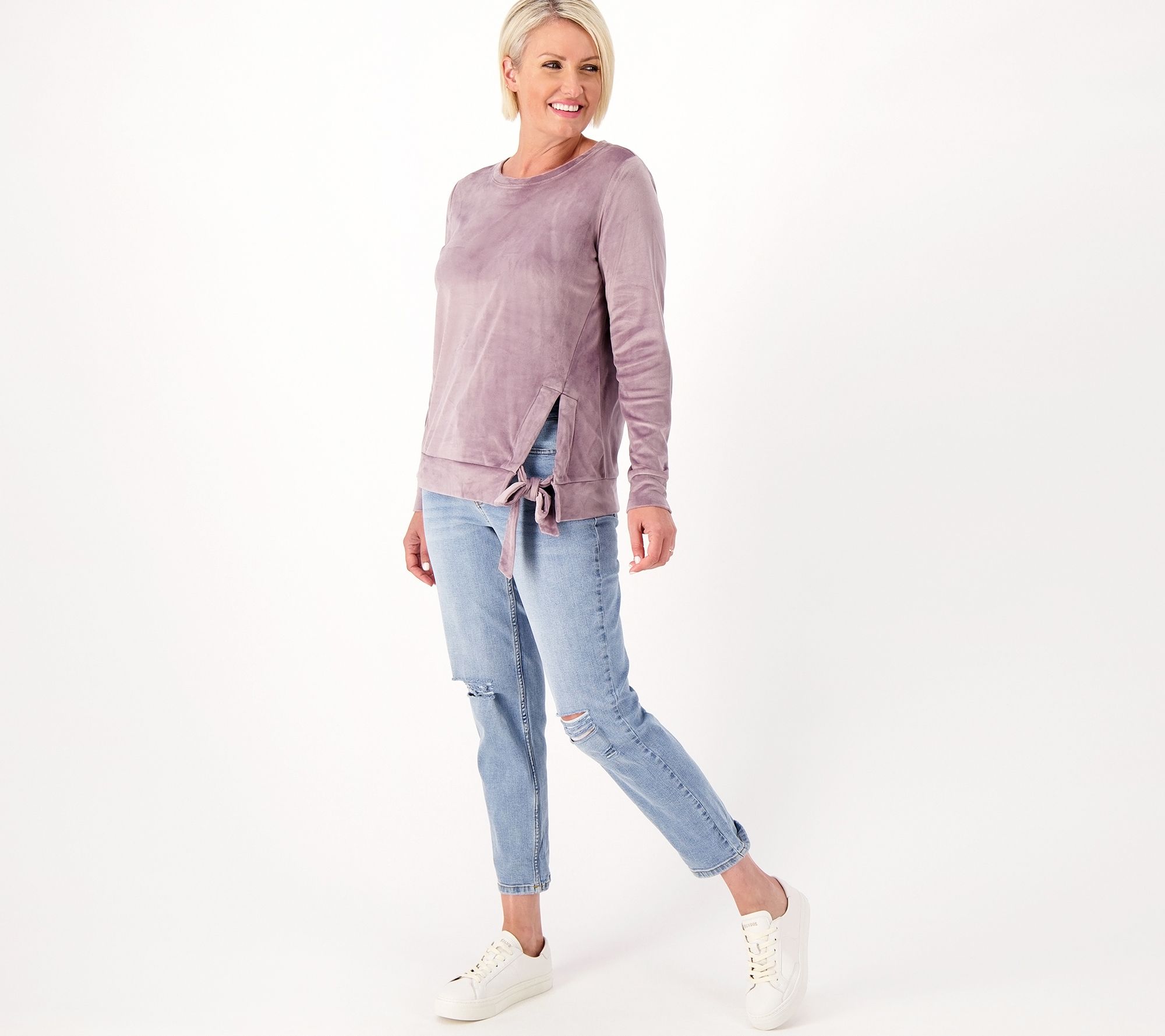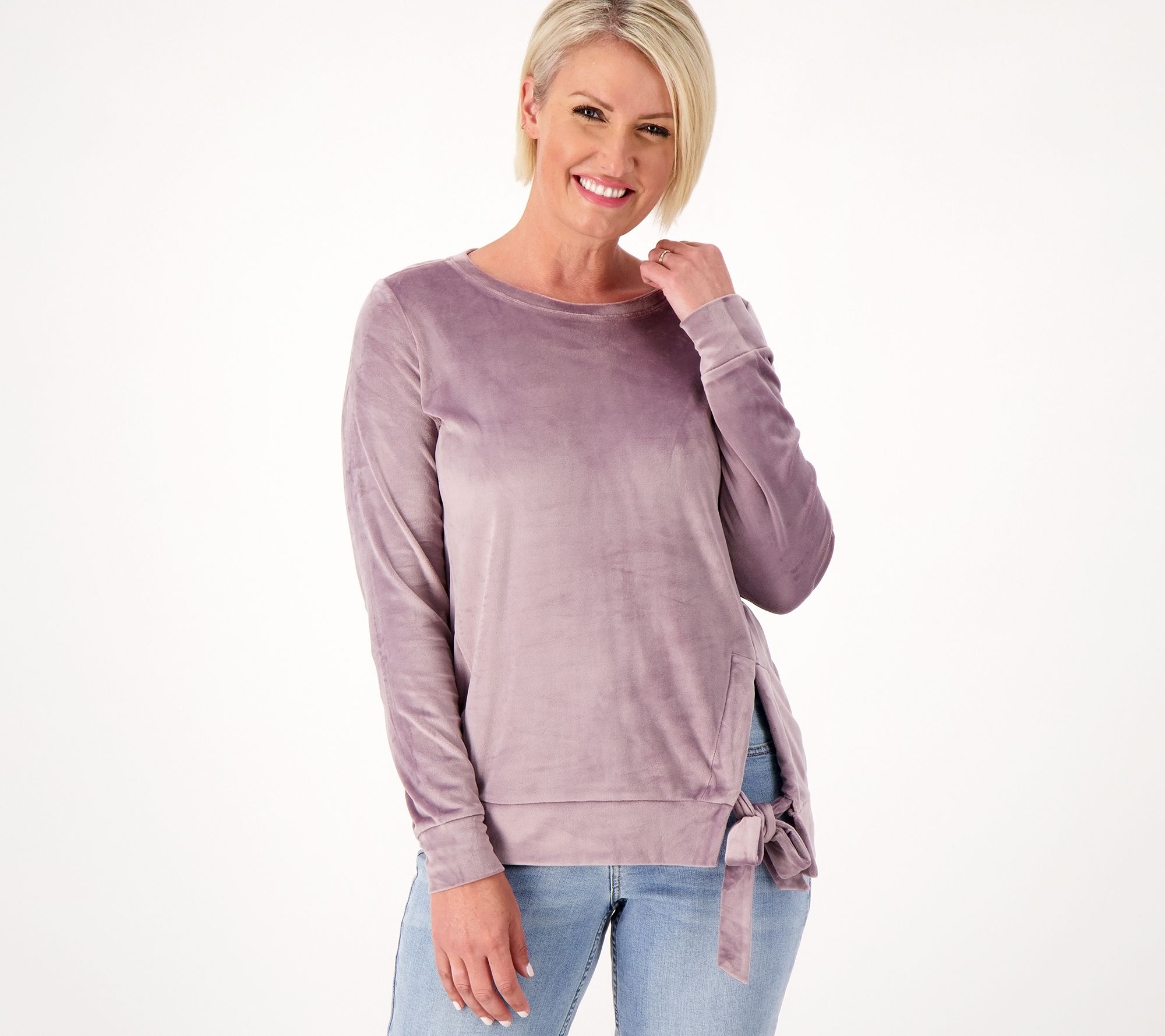 This velour top has it all. A cute ribbon detail you can tie at the side, a comfy bottom band, and a style that slays with chicness. From Anybody® Lounge and Sleepwear.