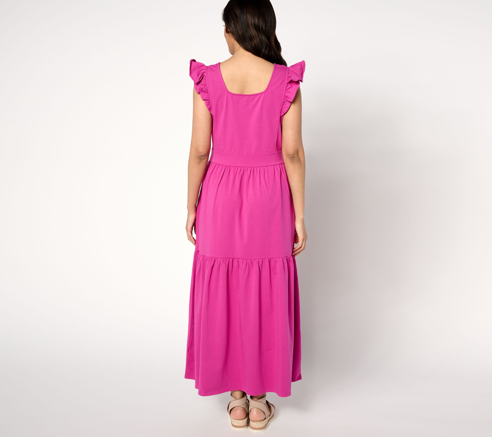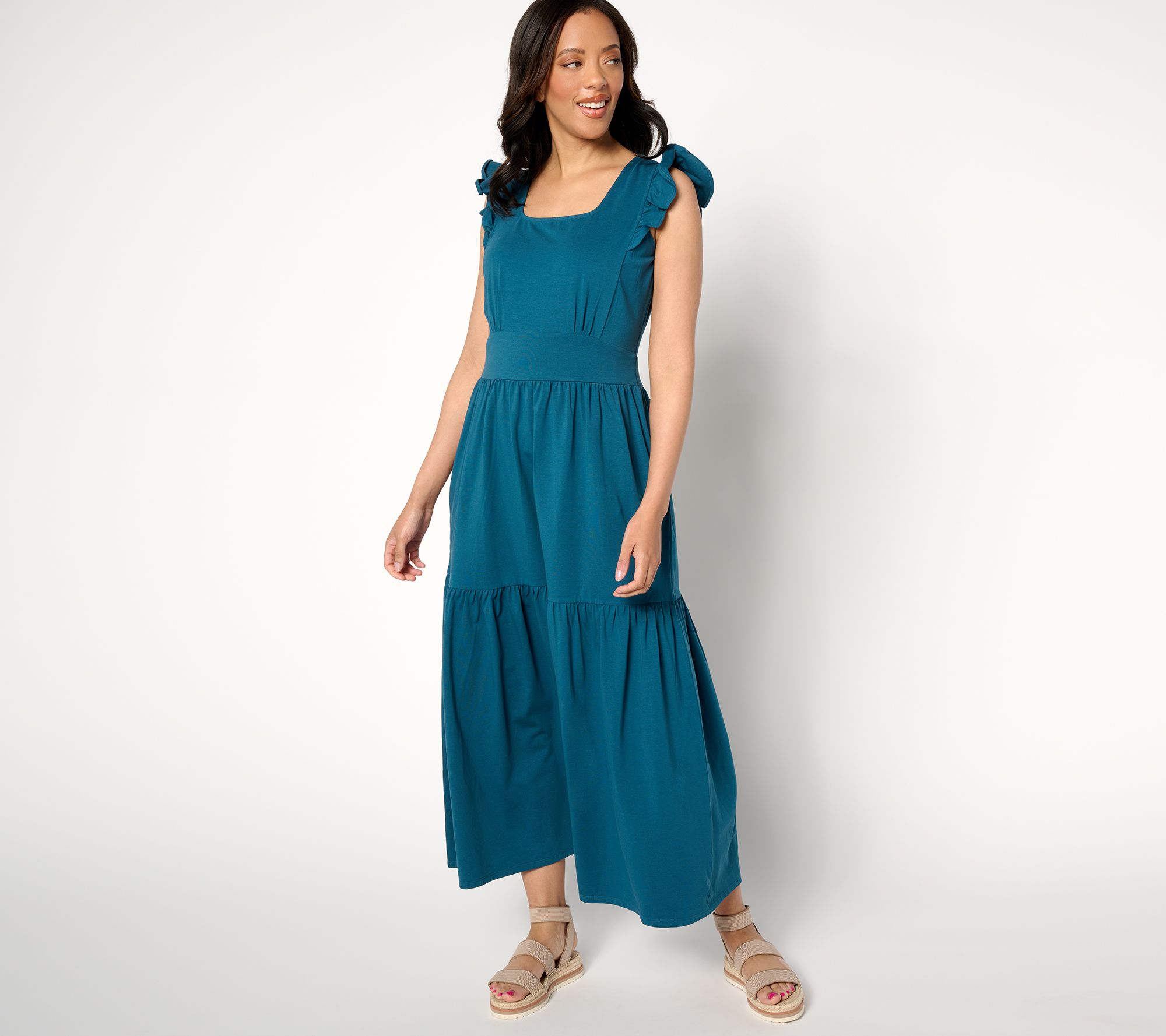 This maxi dress meets all your style goals for sunny season: cotton fabrication (with a bit of comfy stretch), elevated details (ruffles, shirring, and tiers -- oh my!), pockets, and dress up/dress down versatility. In it slides to your weekly rotation! From AnyBody®.