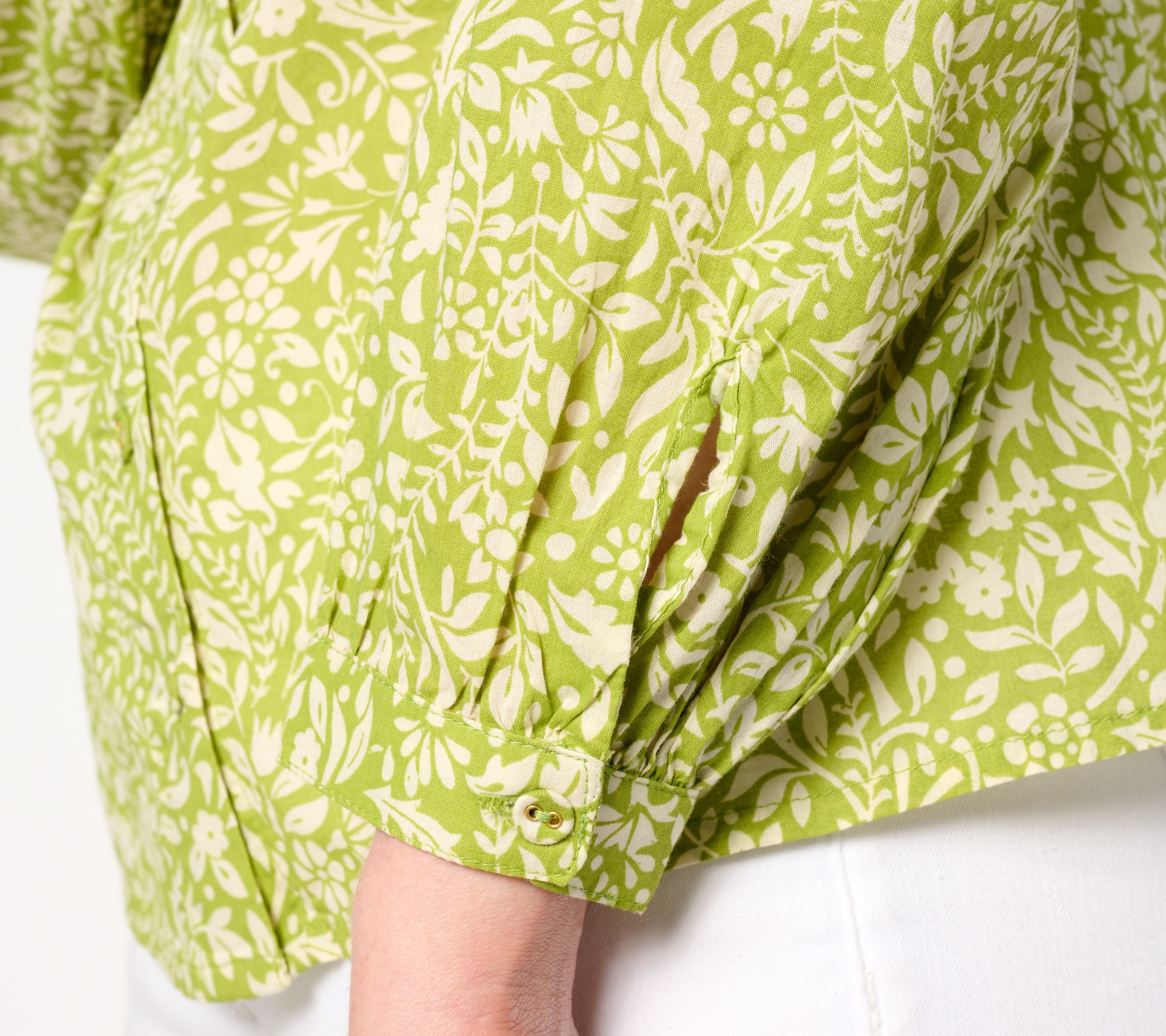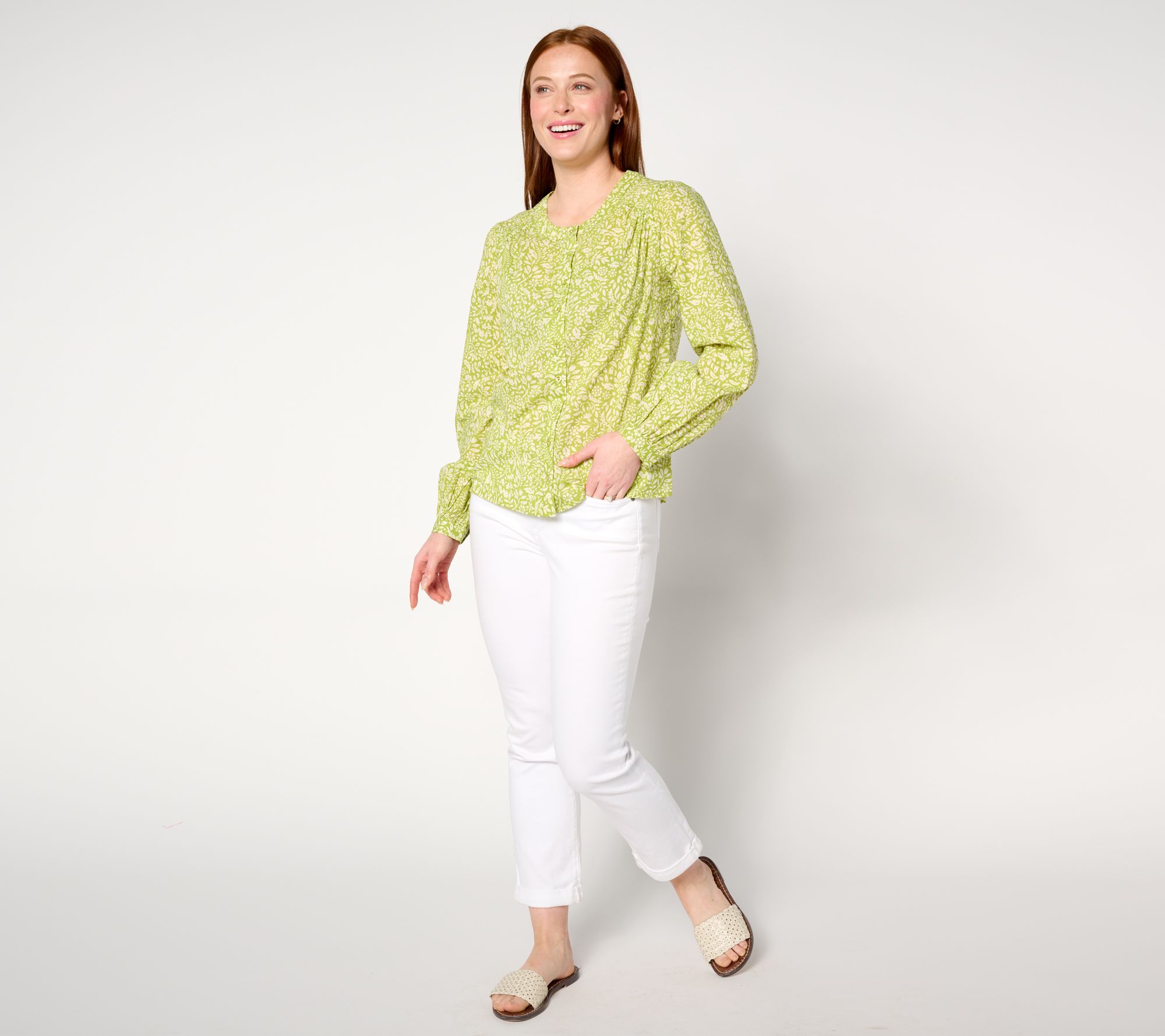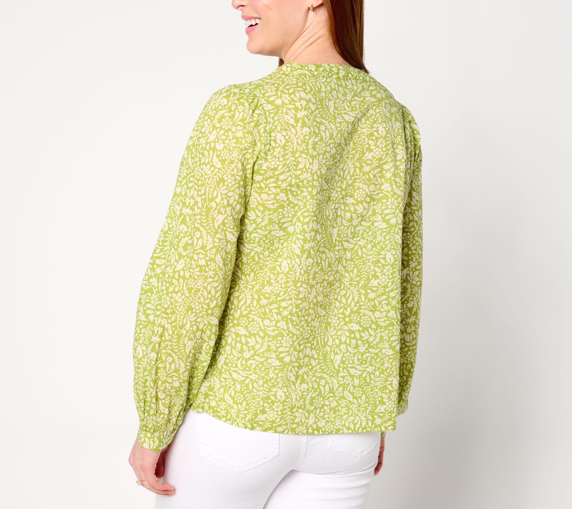 • Features: printed, button-front closure, round neckline, shirred shoulders, long sleeves, button cuffs, straight bottom hem