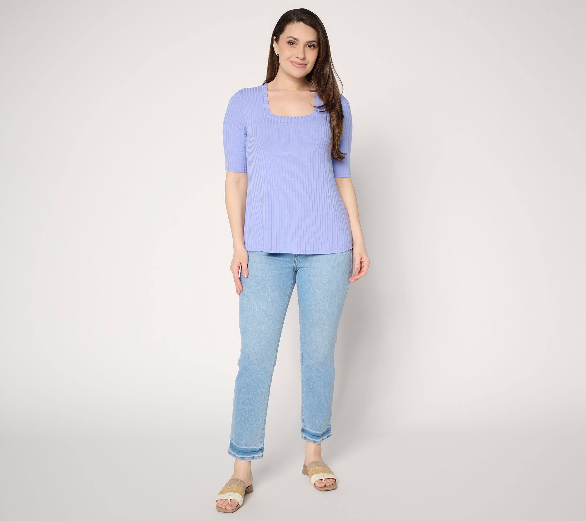 Meet the knit top that's ready for weekends, day trips, or just relaxing in style. Soft rib knit and a square neckline create a flattering silhouette, while built-in support means you can move comfortably from morning errands to evening downtime. Elbow-length sleeves offer versatility as the seasons change. From AnyBody®.