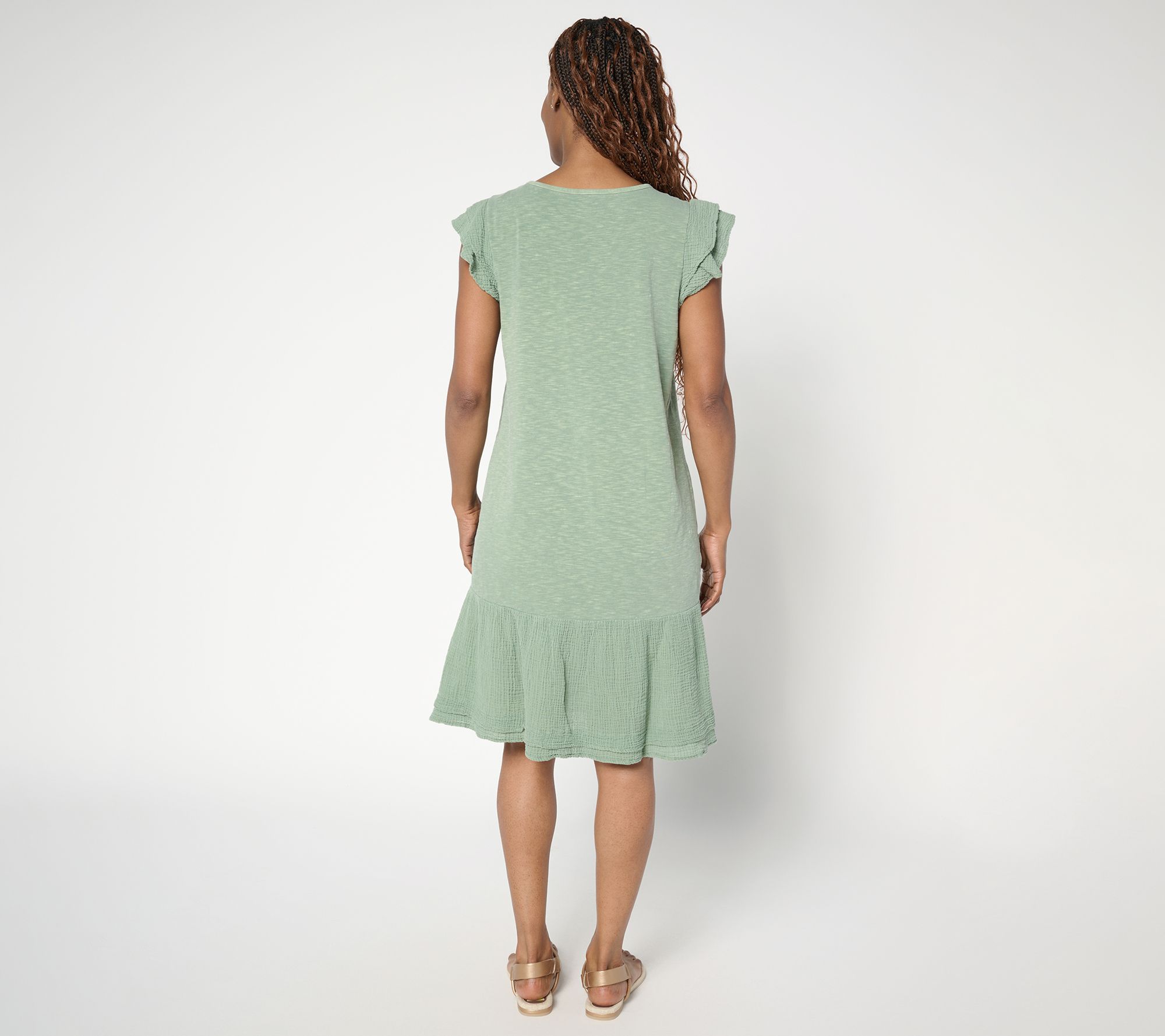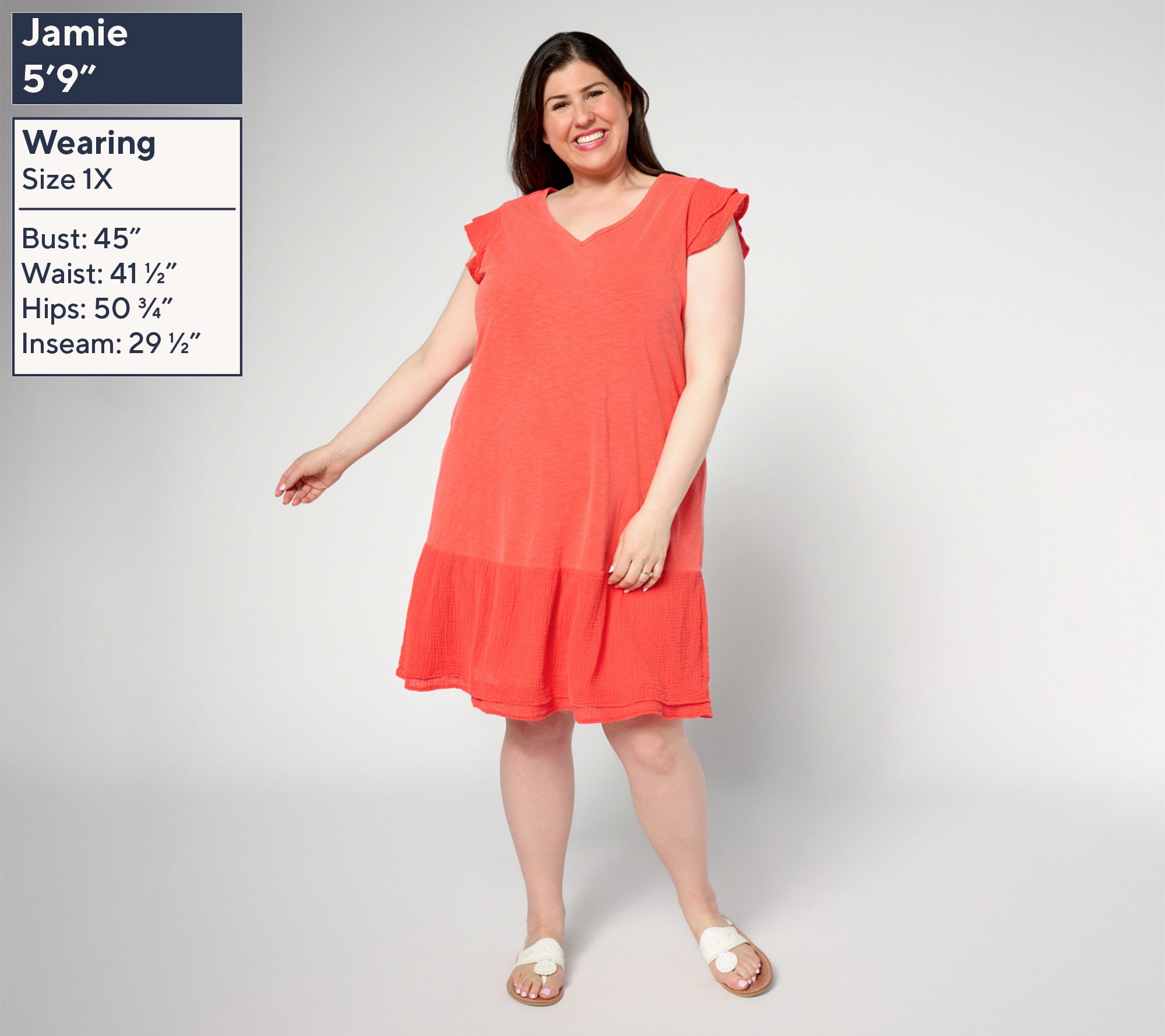 Fabrication: mixed media; slub jersey knit body, woven gauze tiered flutter sleeves and tiered hem