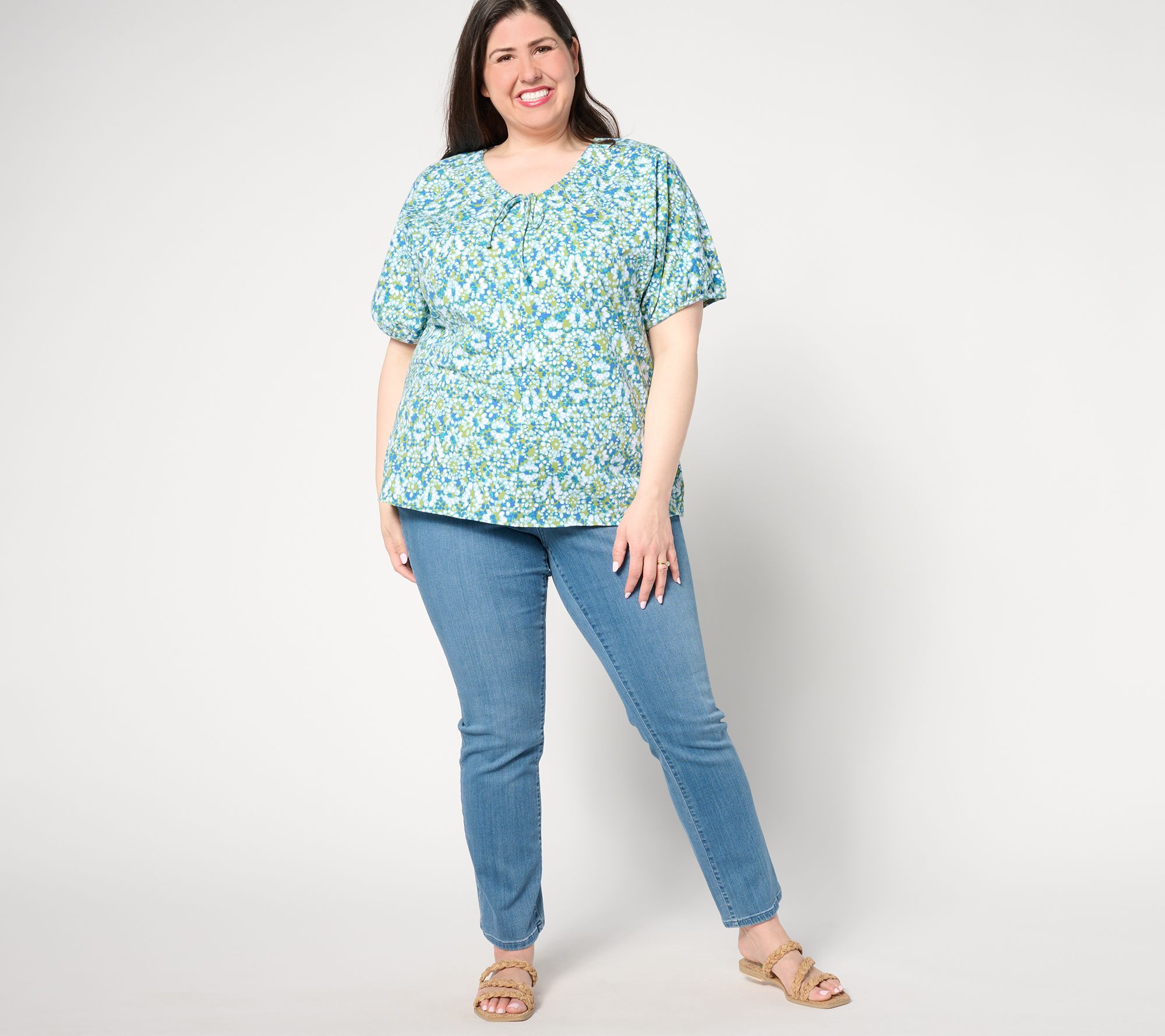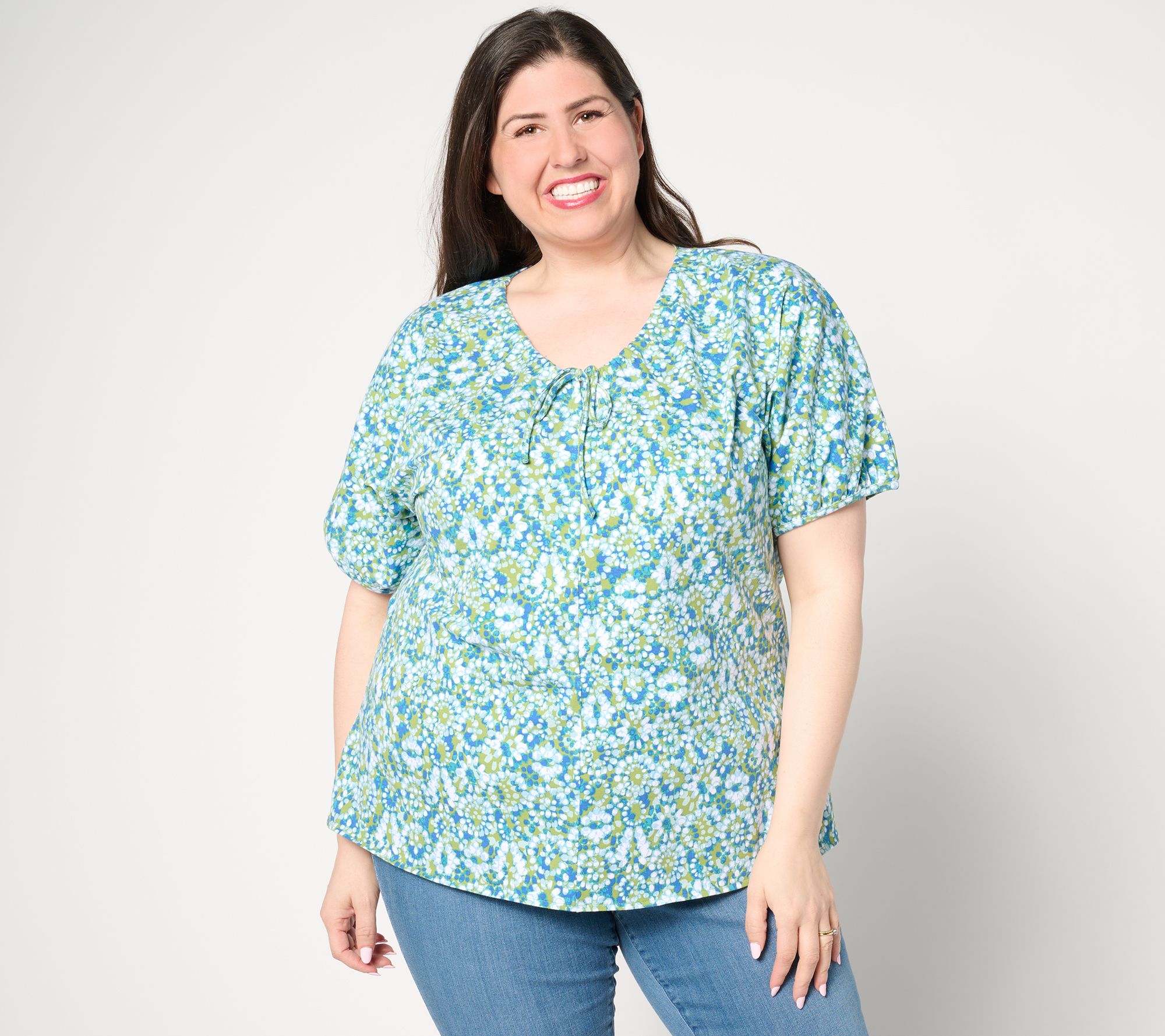 Boasting a ruched V neckline with drawcord detail, this printed knit top brings a cute and carefree vibe to your casual attire. From AnyBody®.
