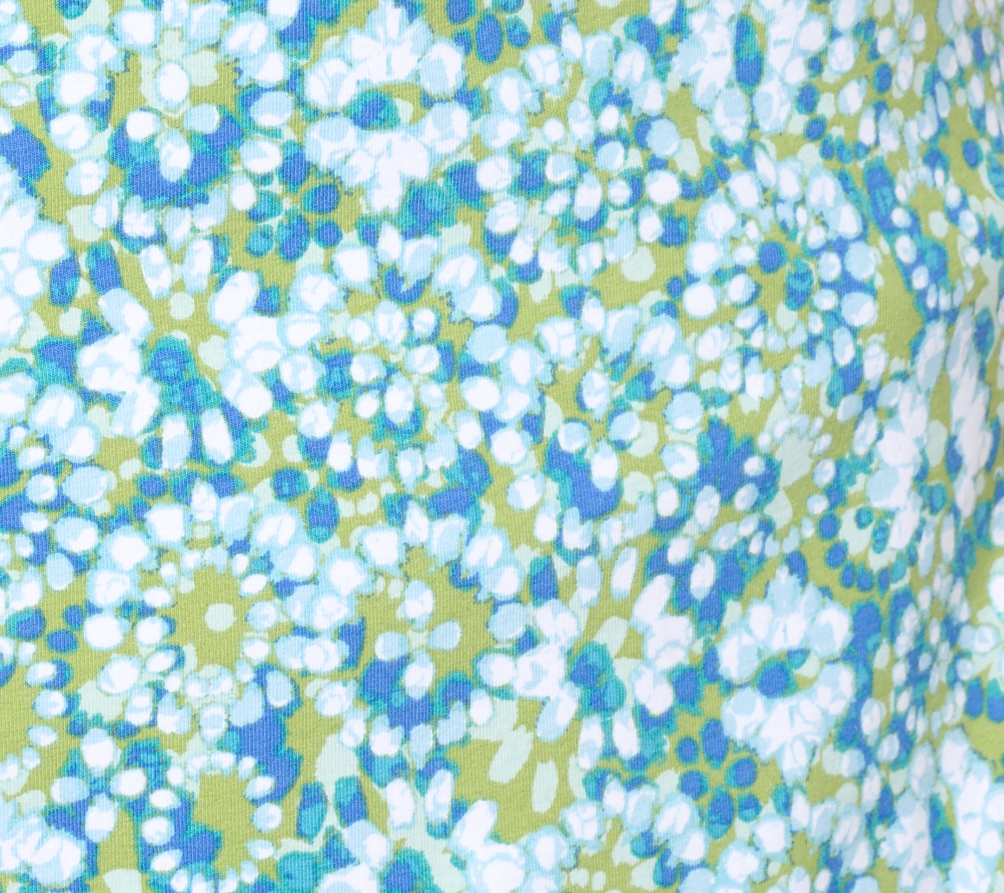 • Features: ruched V-neckline with drawcord, dolman short sleeves, seam at center back, allover print