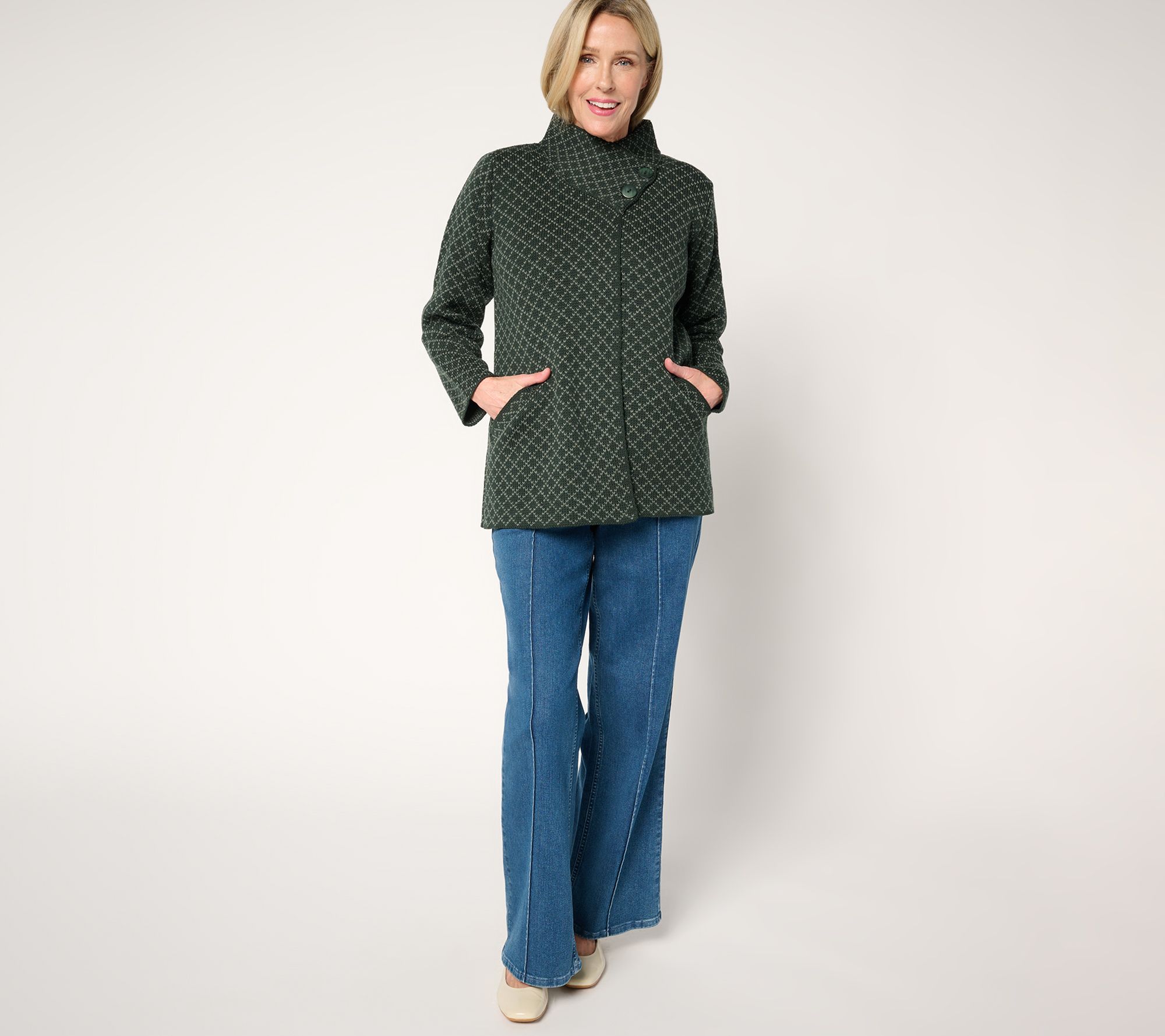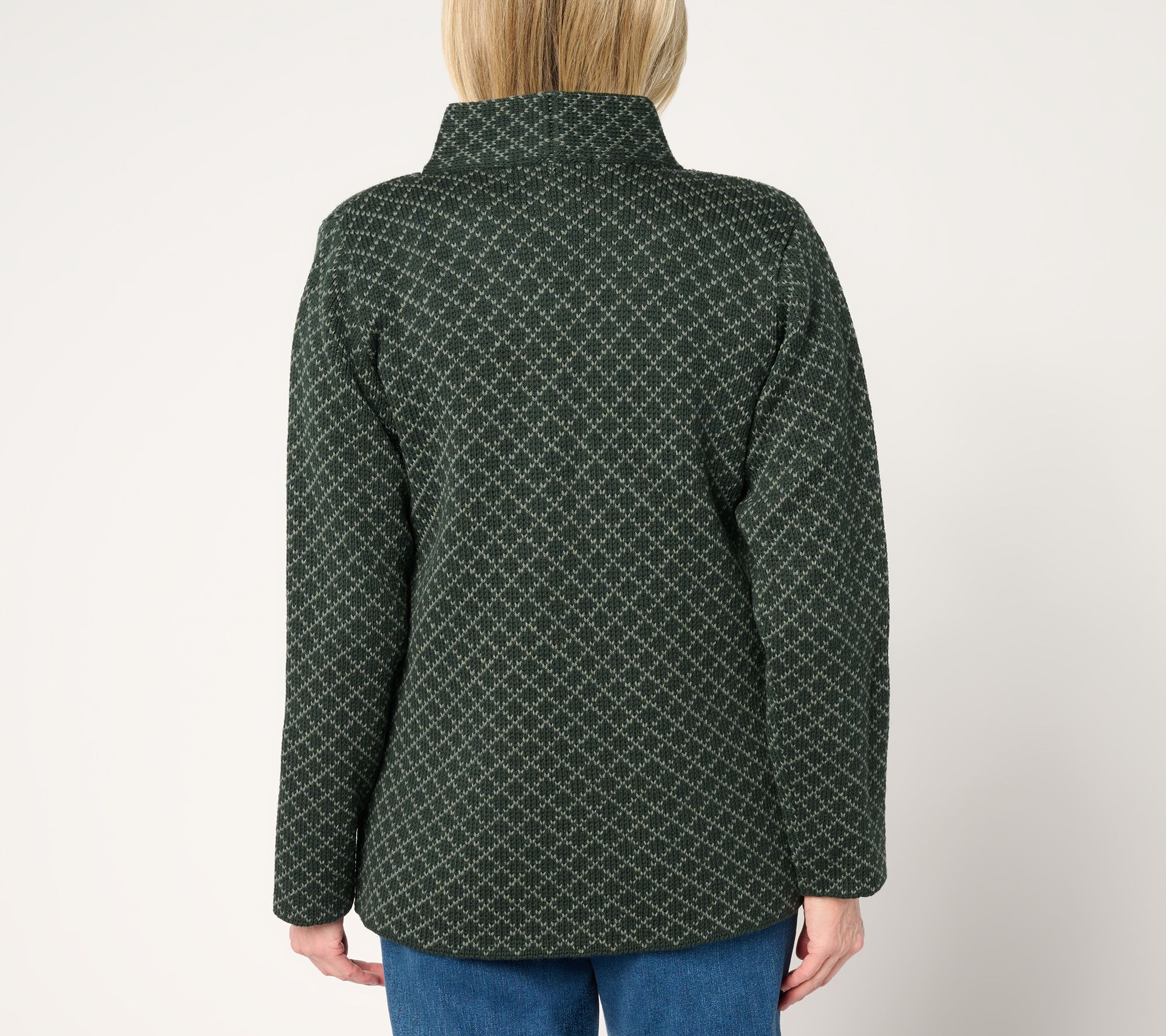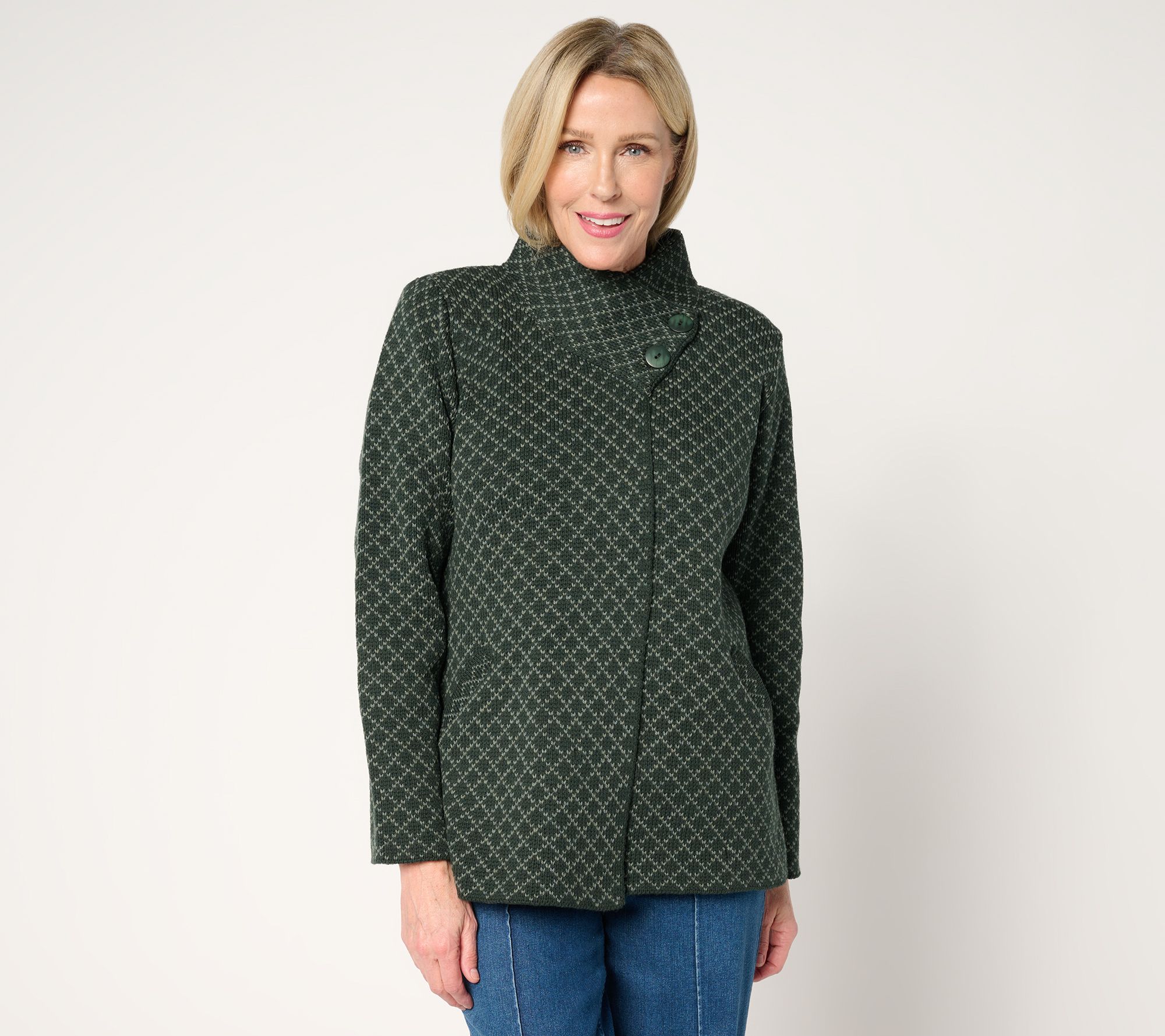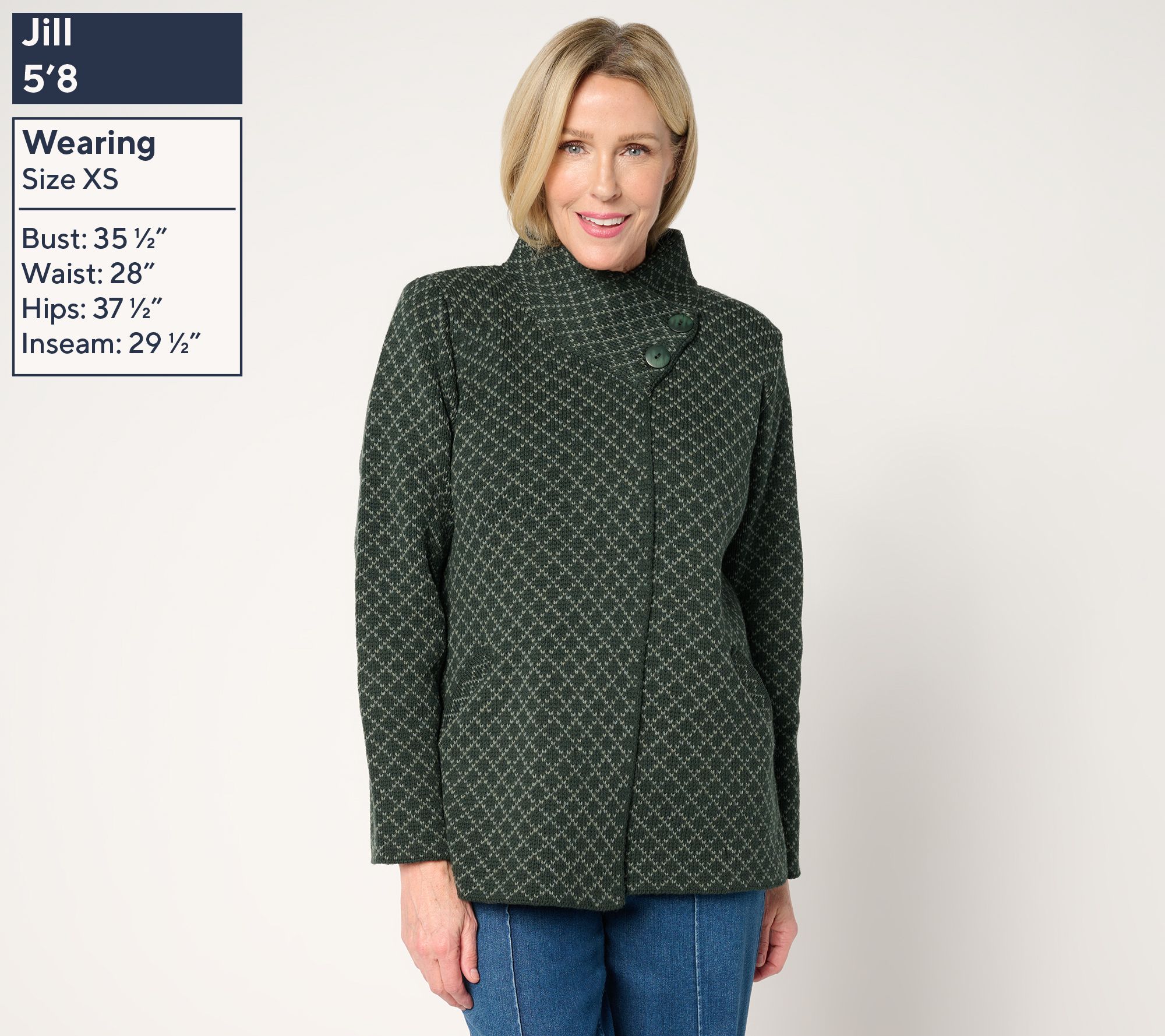 Zip in and zip out -- but you're likely to stay awhile in this gorgeously crafted jacquard cardigan. A structured design anchored by a high collar lets the stylish sweater sub in for a blazer or jacket at the office and beyond. From Aran Crafts.