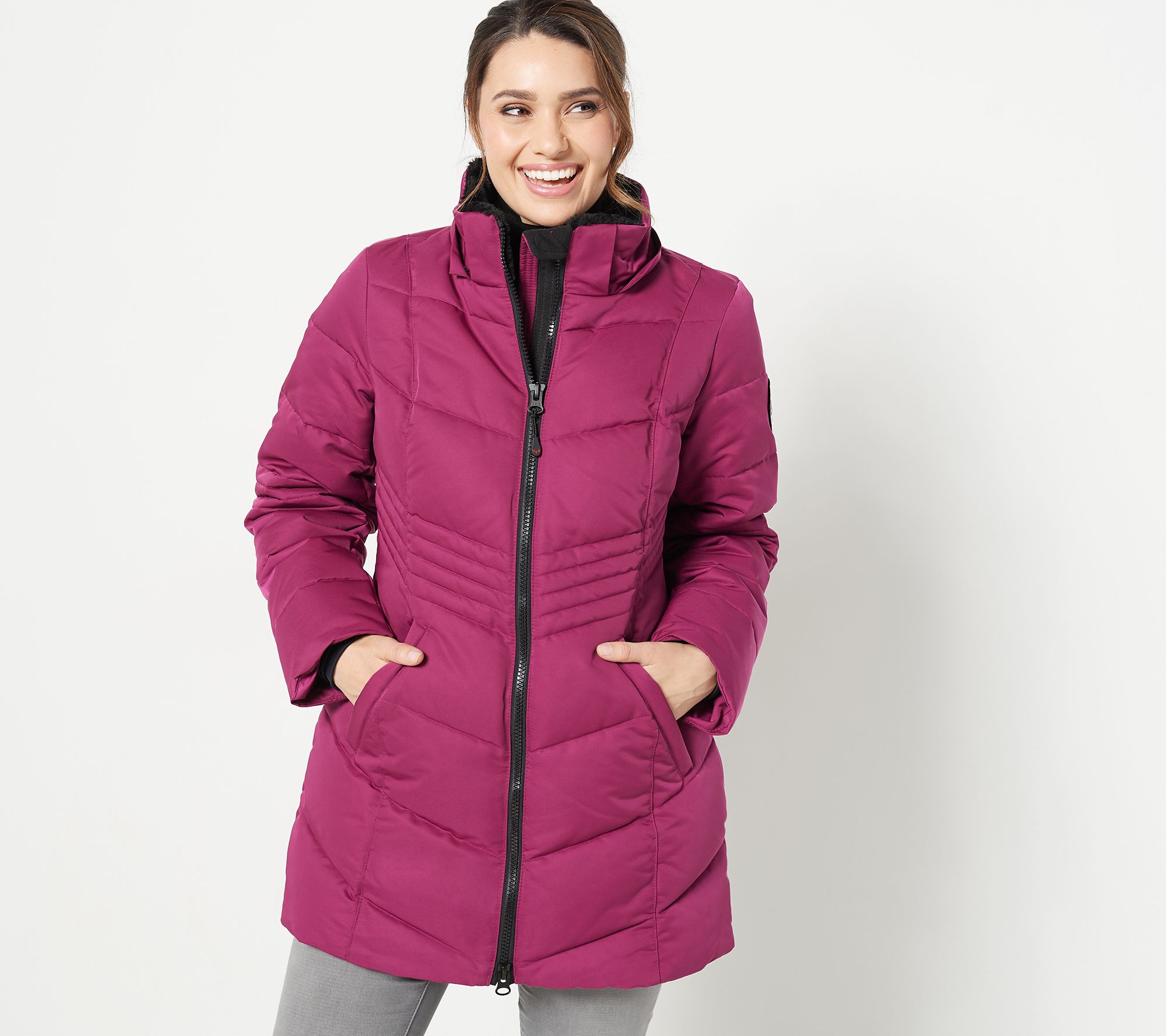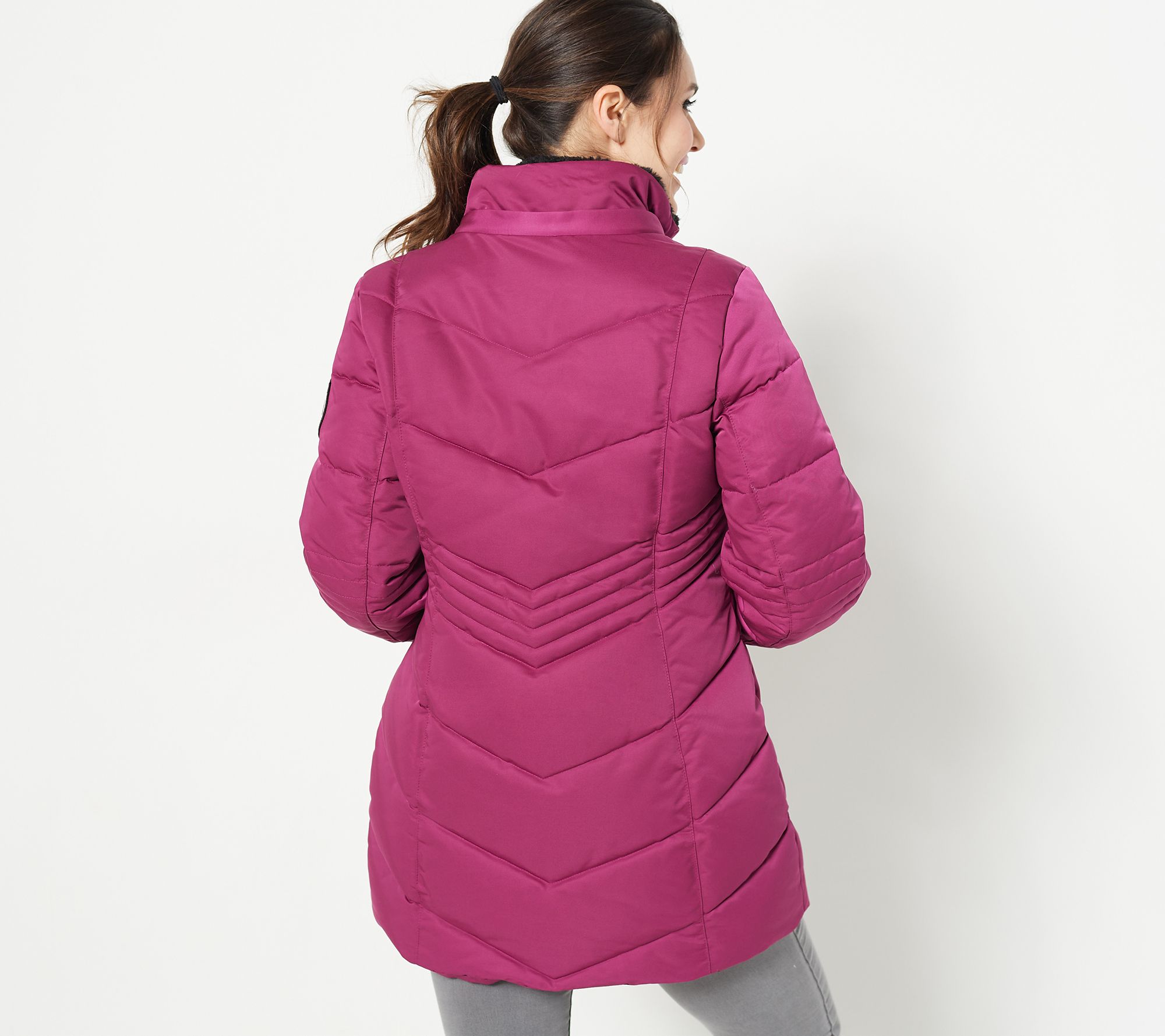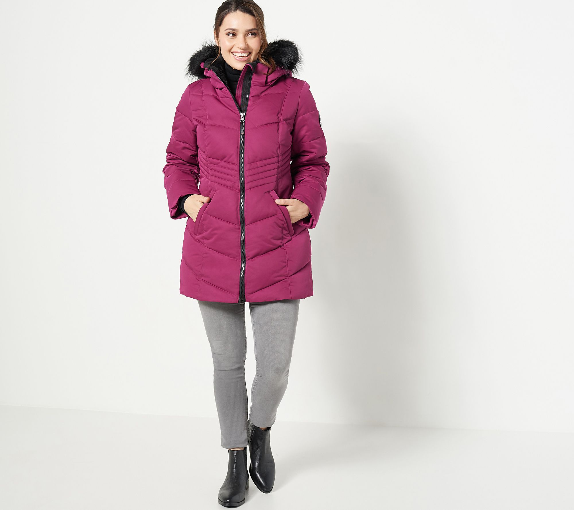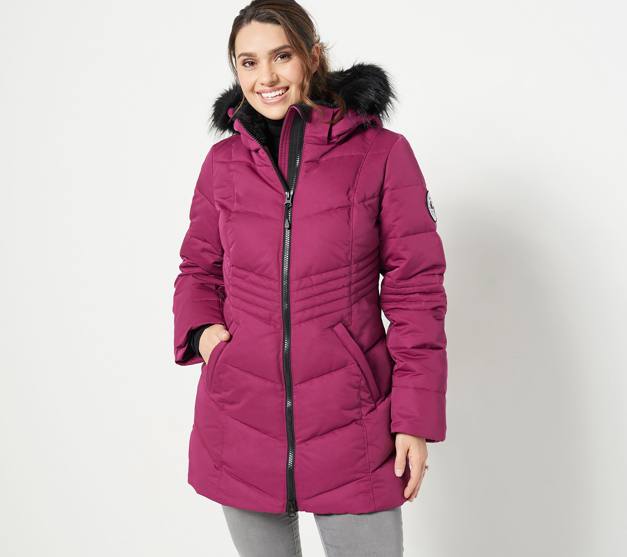 • Features: chevron quilting, removable faux fur hood, chin guard, faux fur collar lining, long sleeves, mid-length