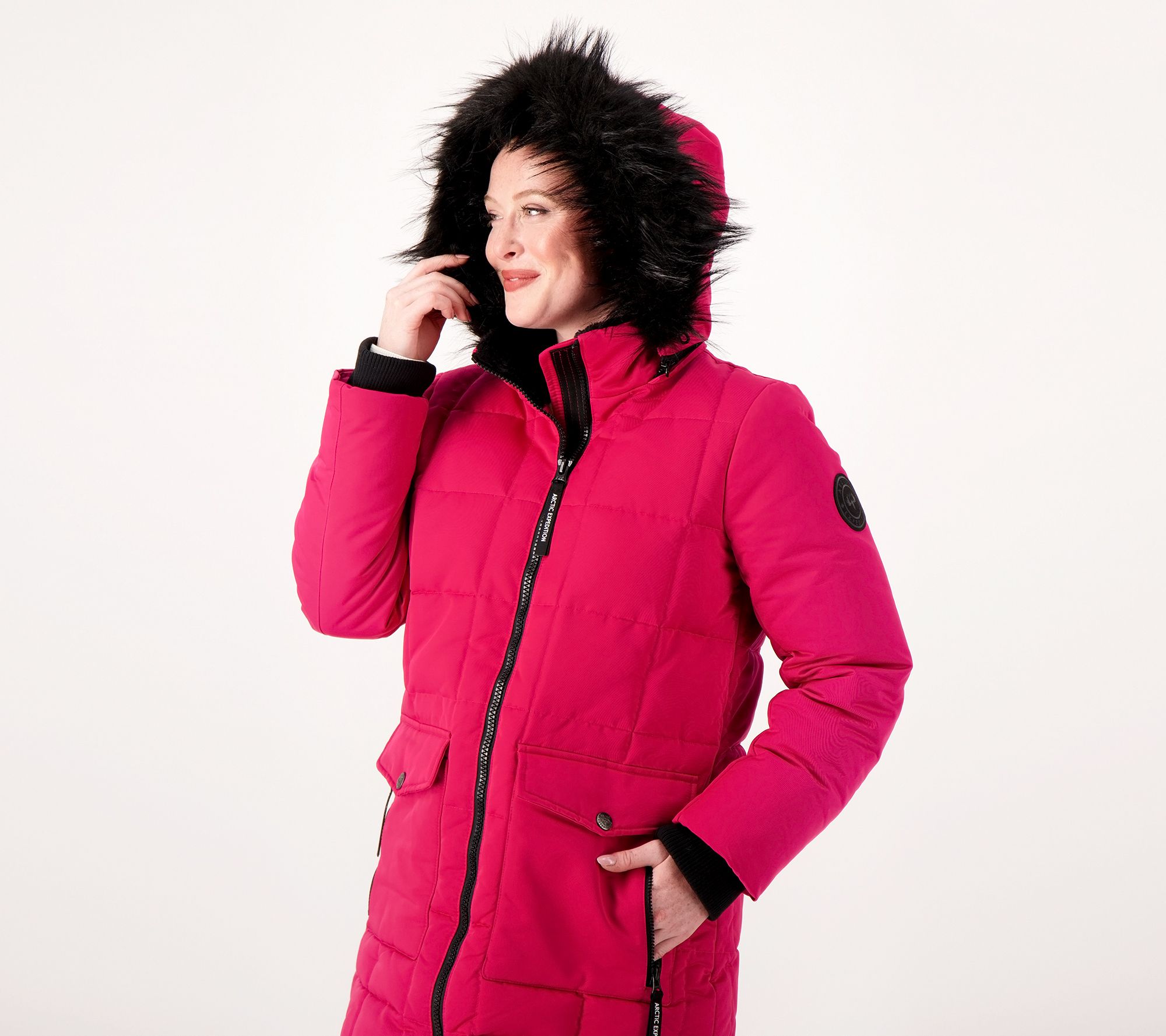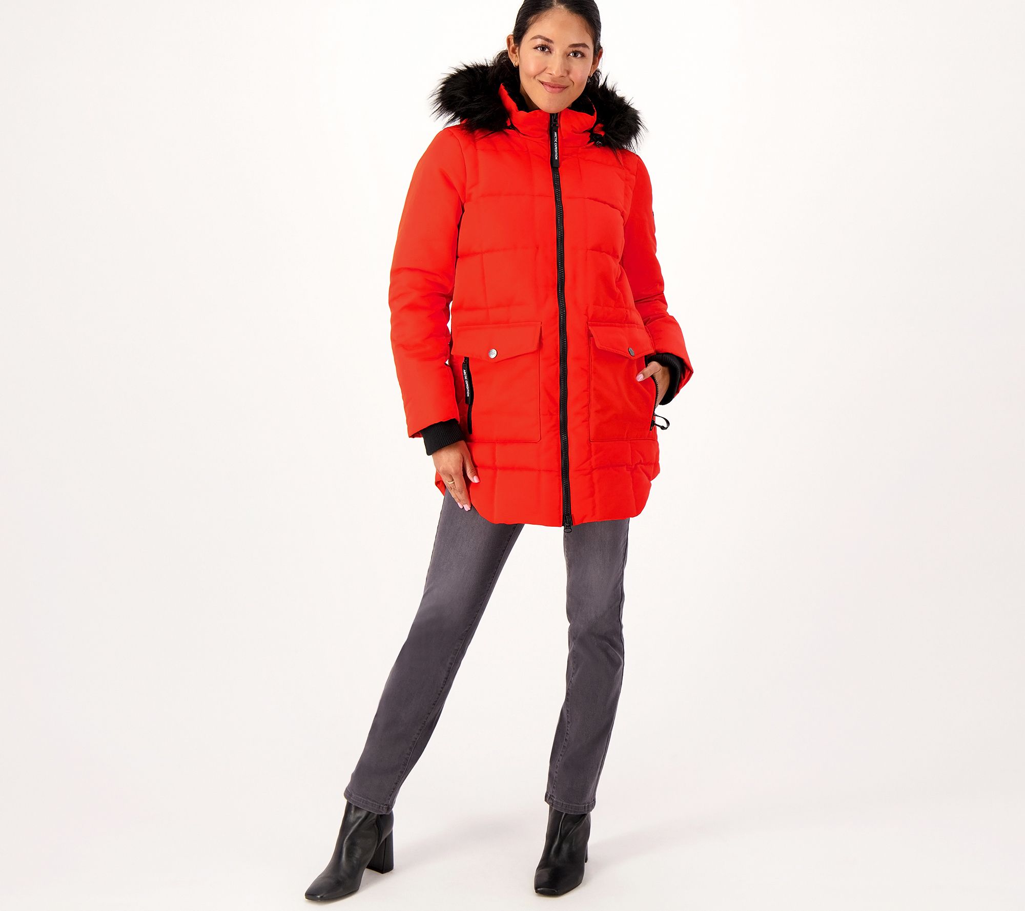 • Features: water-repellent, square quilting, detachable hood with faux-fur trim, storm cuffs, hi-low hem