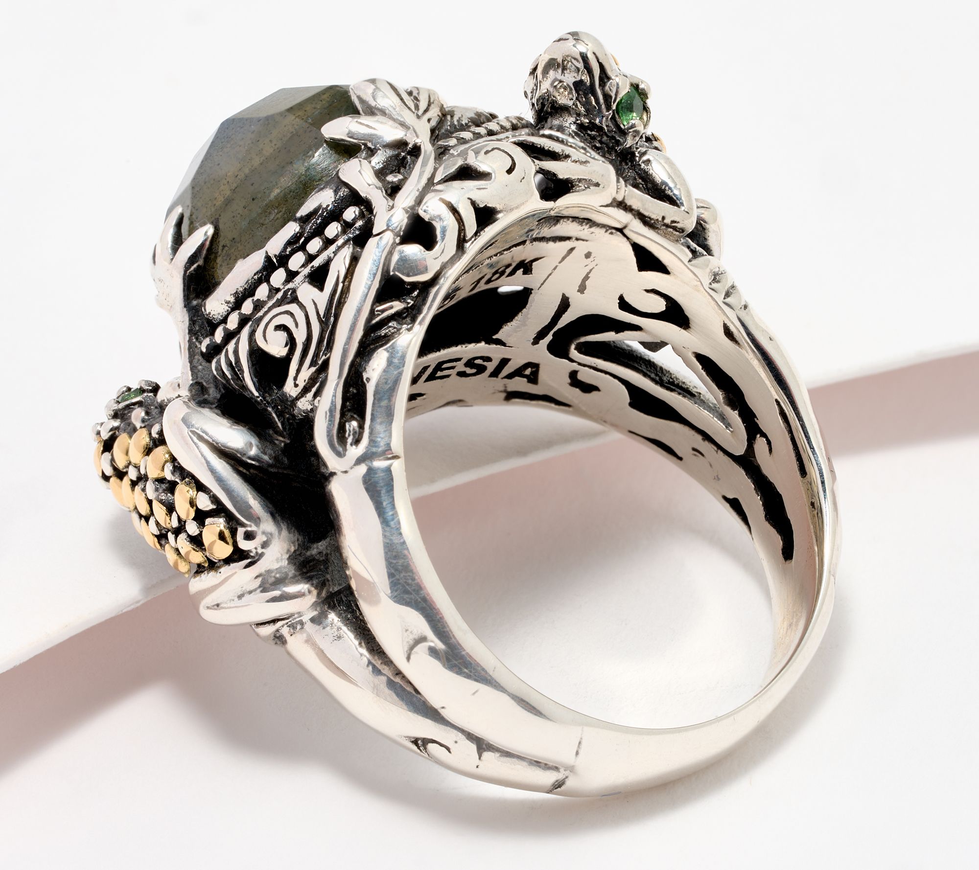 • 12mm, round, checkerboard dome labradorite in center surrounded by frog figures; round, faceted tsavorite gemstones for frog eyes; oxidized and polished finish