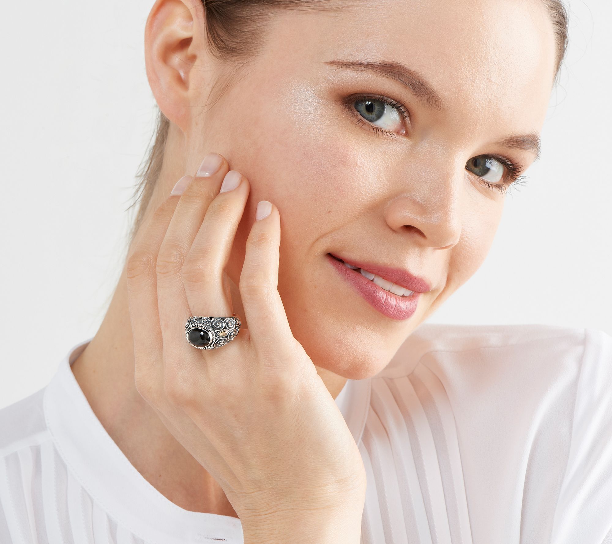 • Oval-cut black star diopside; oxidized and polished finish
