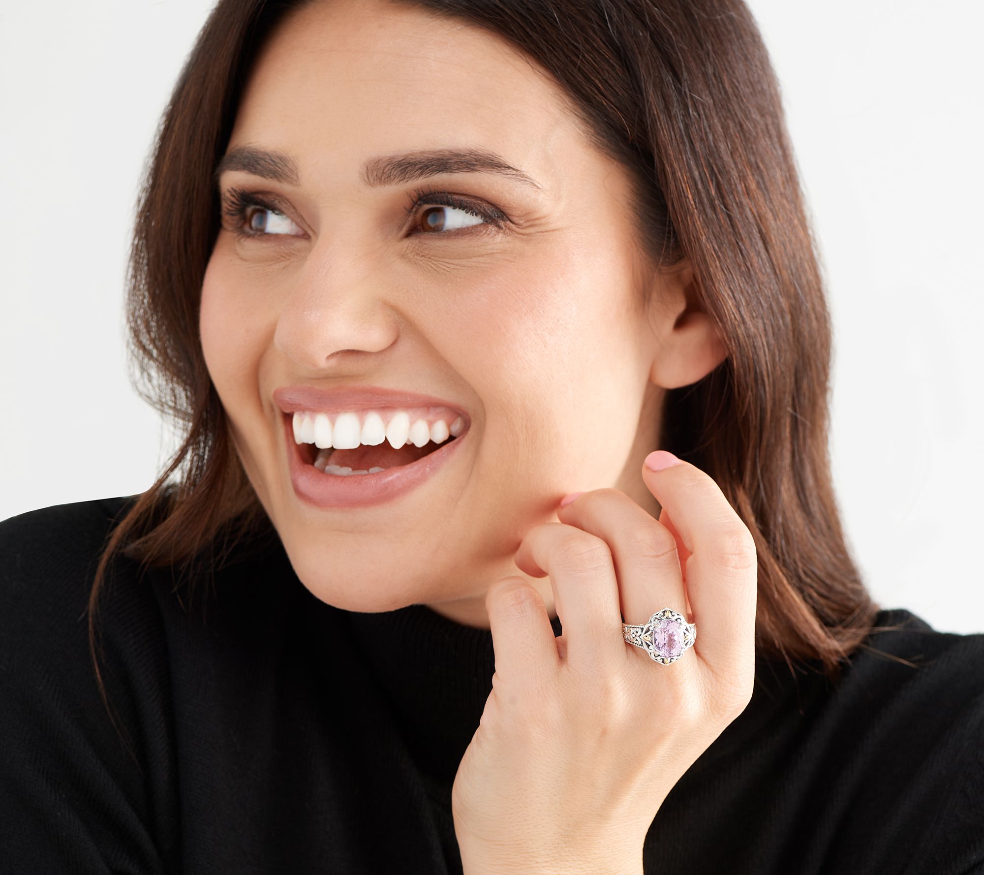 Talk about elegance! Exuding grace, this gorgeous ring is enhanced with unique scrollwork, 18K gold accents, and a jaw-dropping oval-cut Kunzite stone. From Artisan Crafted.