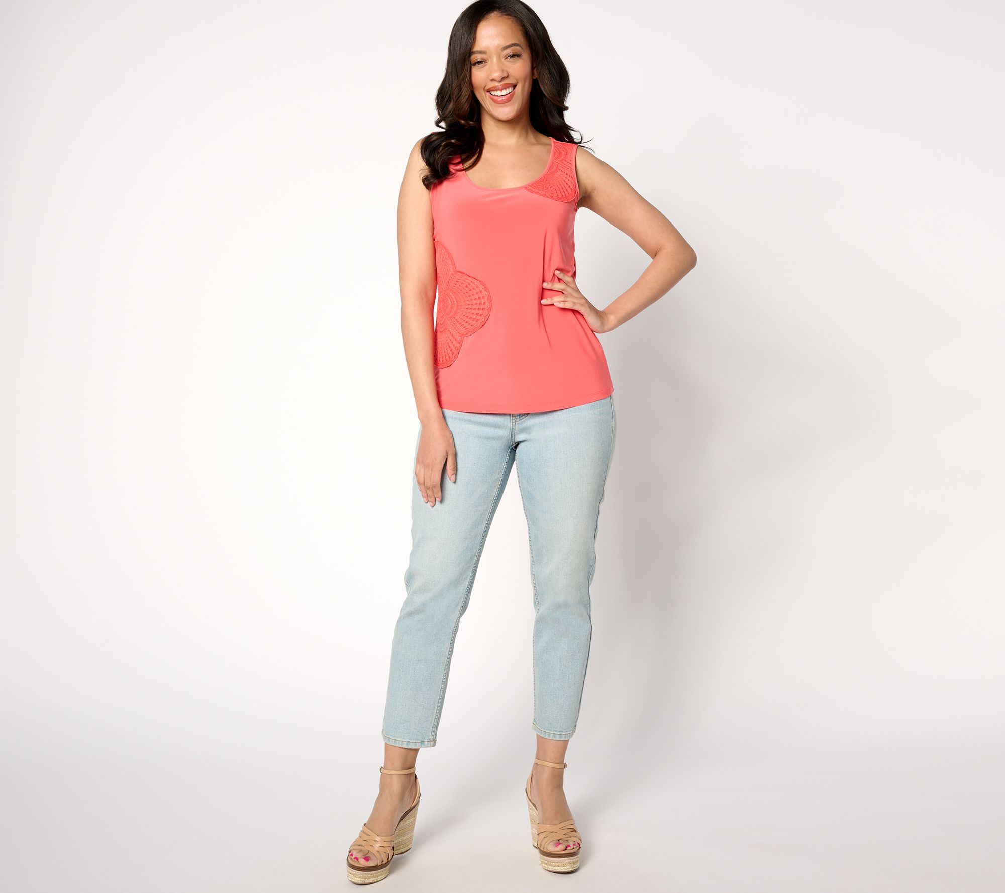 Hardly just another tank top, this lovely Como Jersey tank is fashioned with crochet medallion details for a little something special. From Women with Control®.