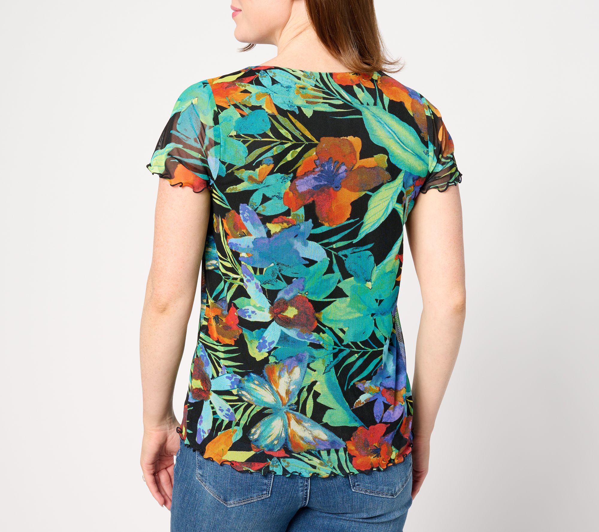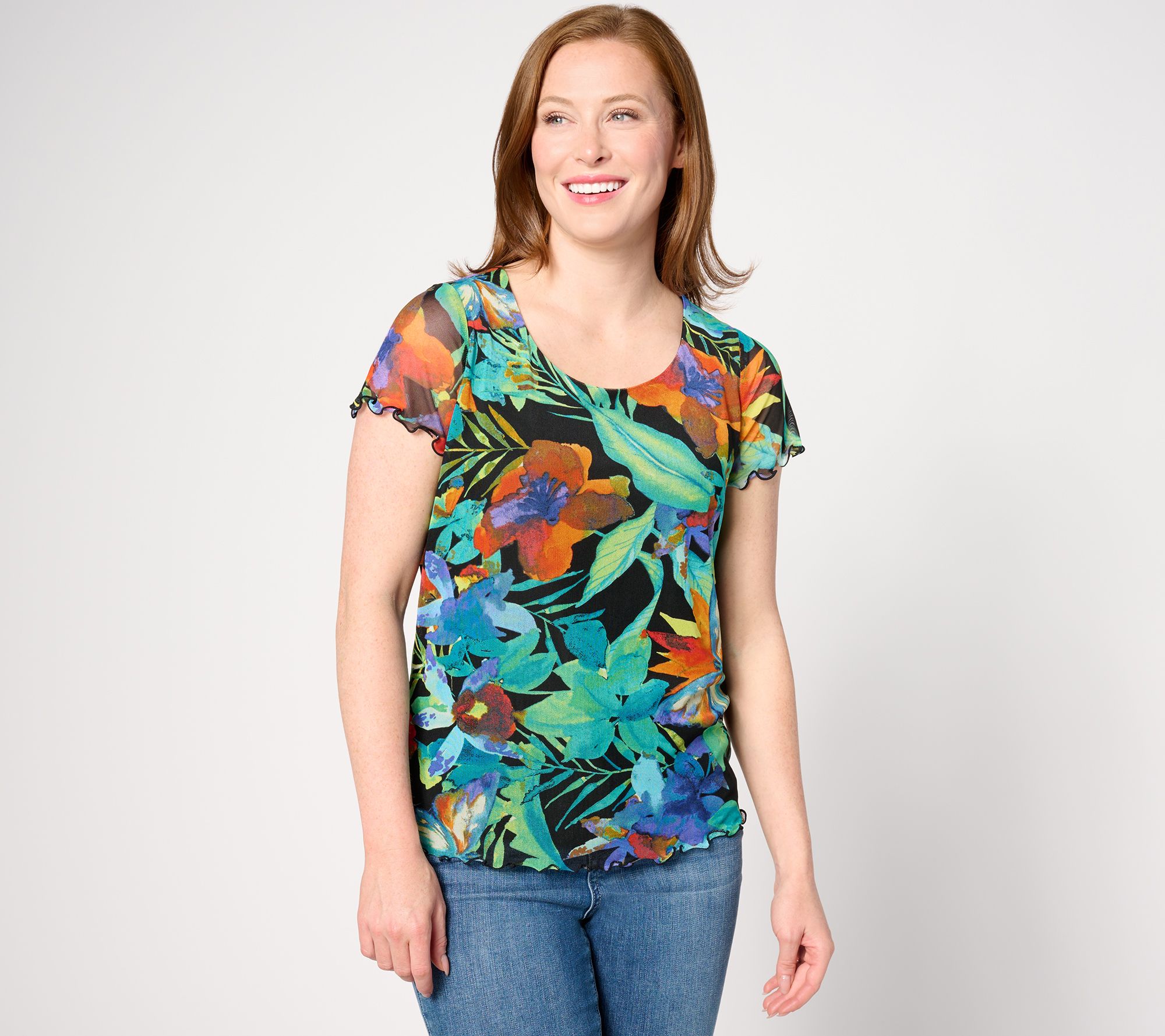 • Features: crew neckline, lettuce-edge short sleeves and straight bottom hem