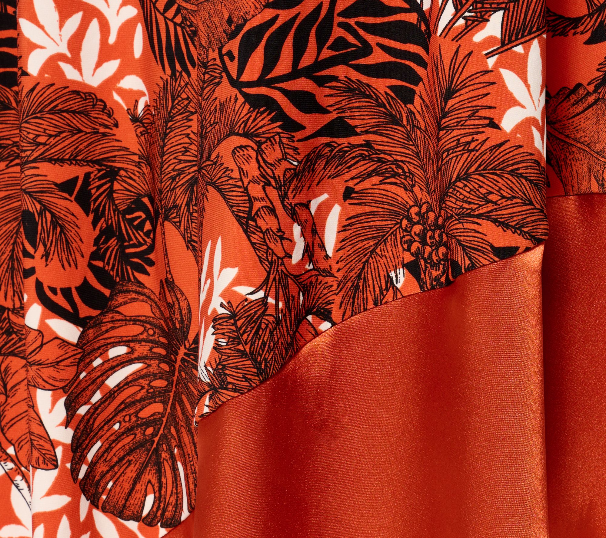 • Features: crossover neckline, short sleeves, asymmetric design, print/solid mix, small bar tack at front neck