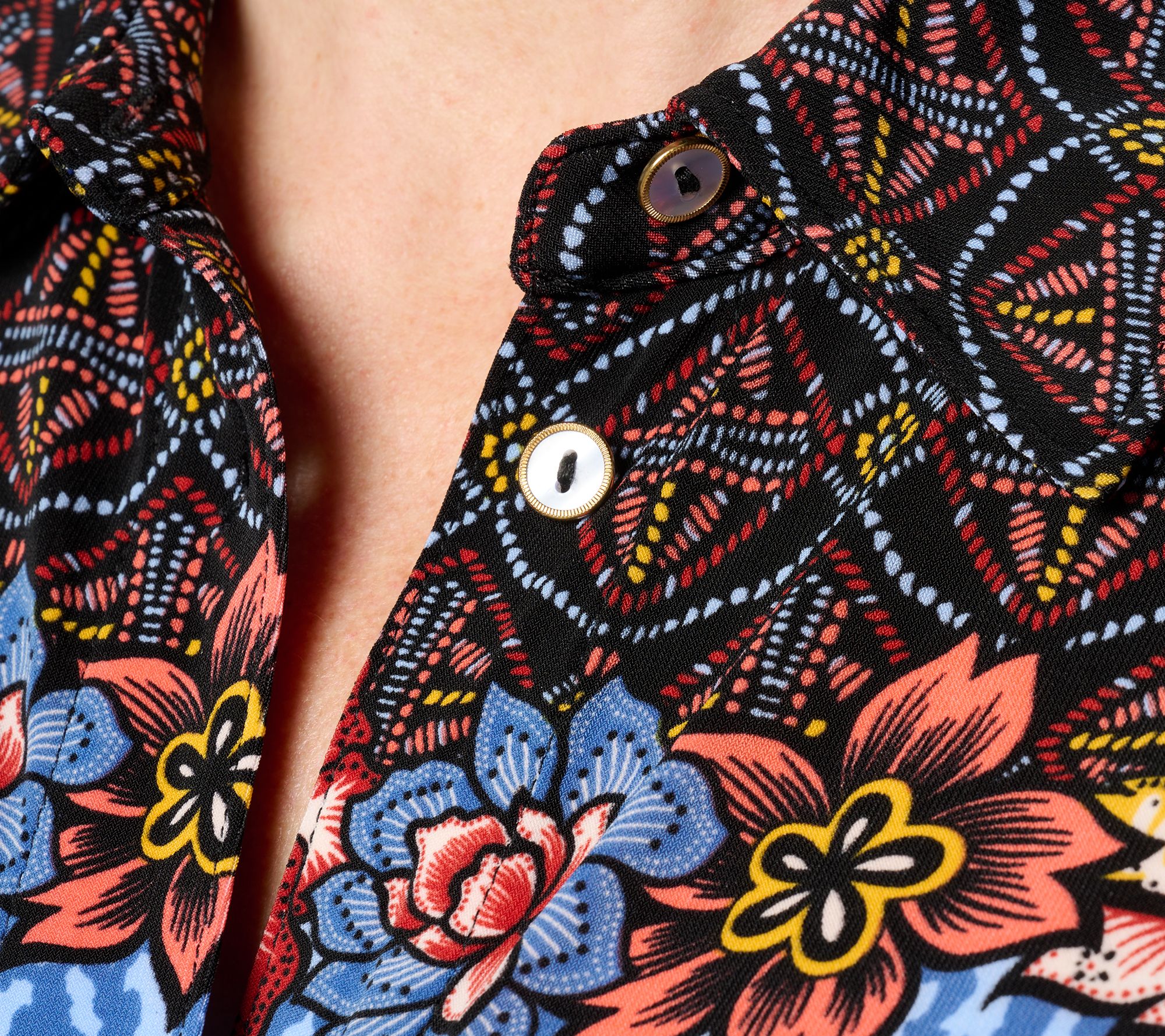 • Features: allover print, collar, button front closure, long sleeves, maxi length