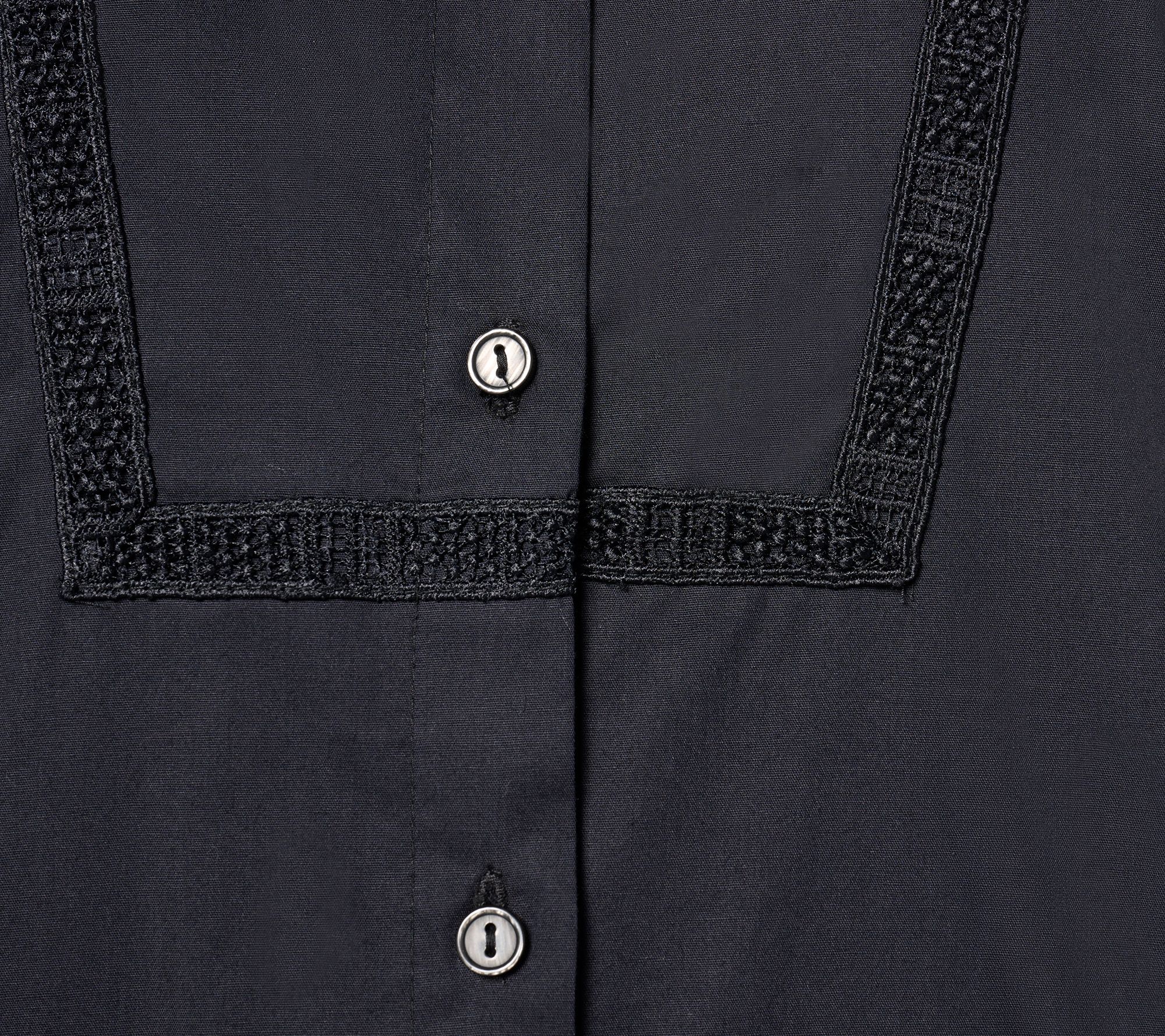 • Features: button-front closure, ladder lace trim, forward side seams, long vented sleeves, two-ply button cuffs, back yoke