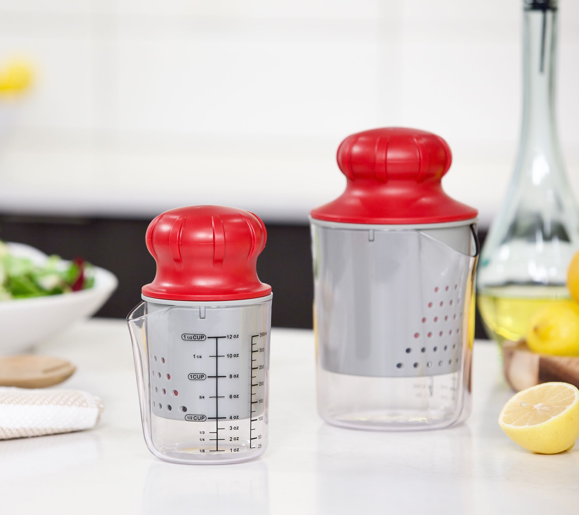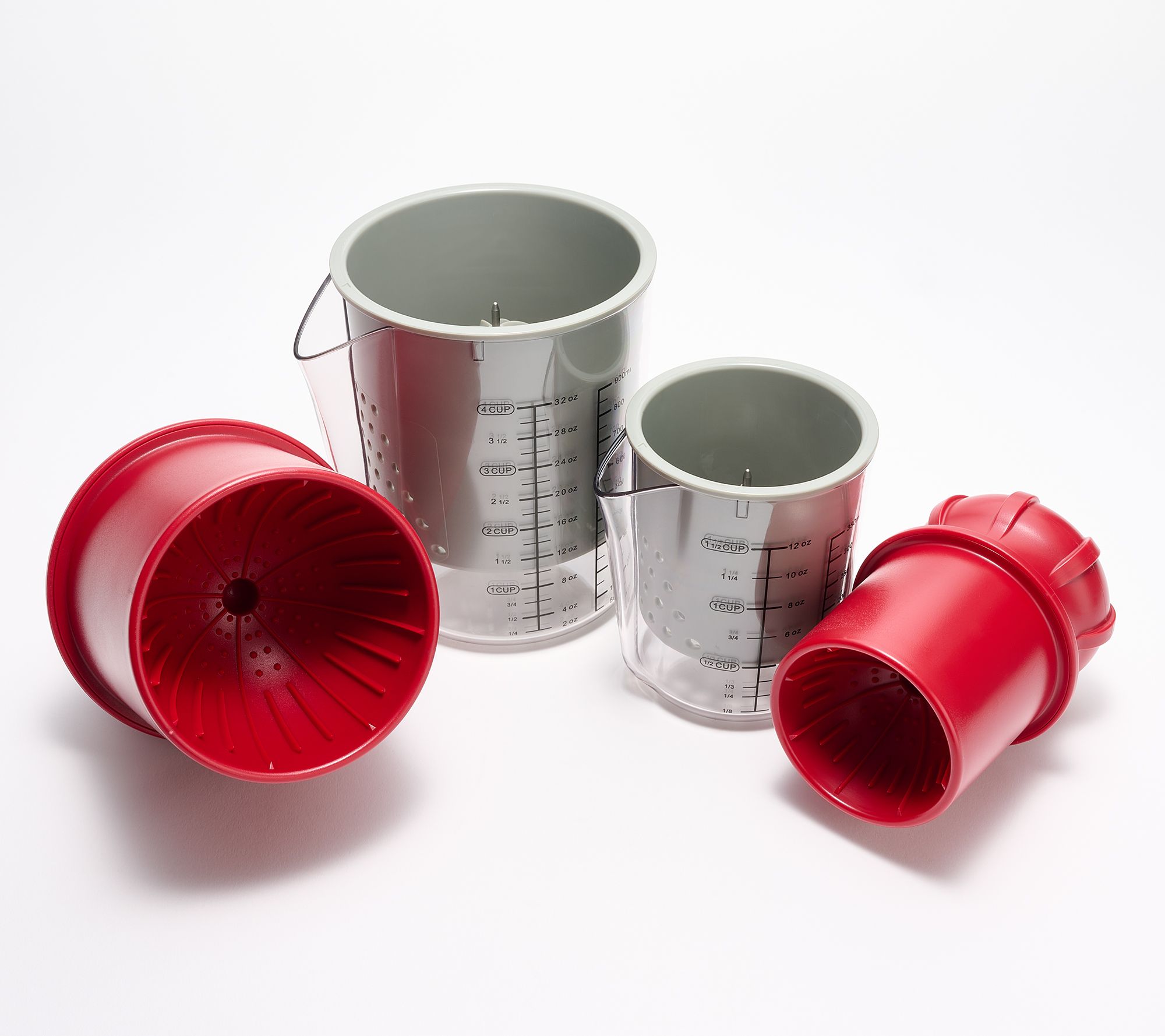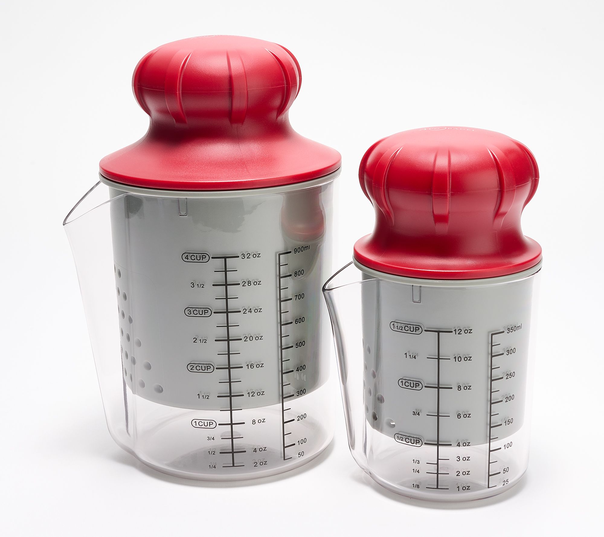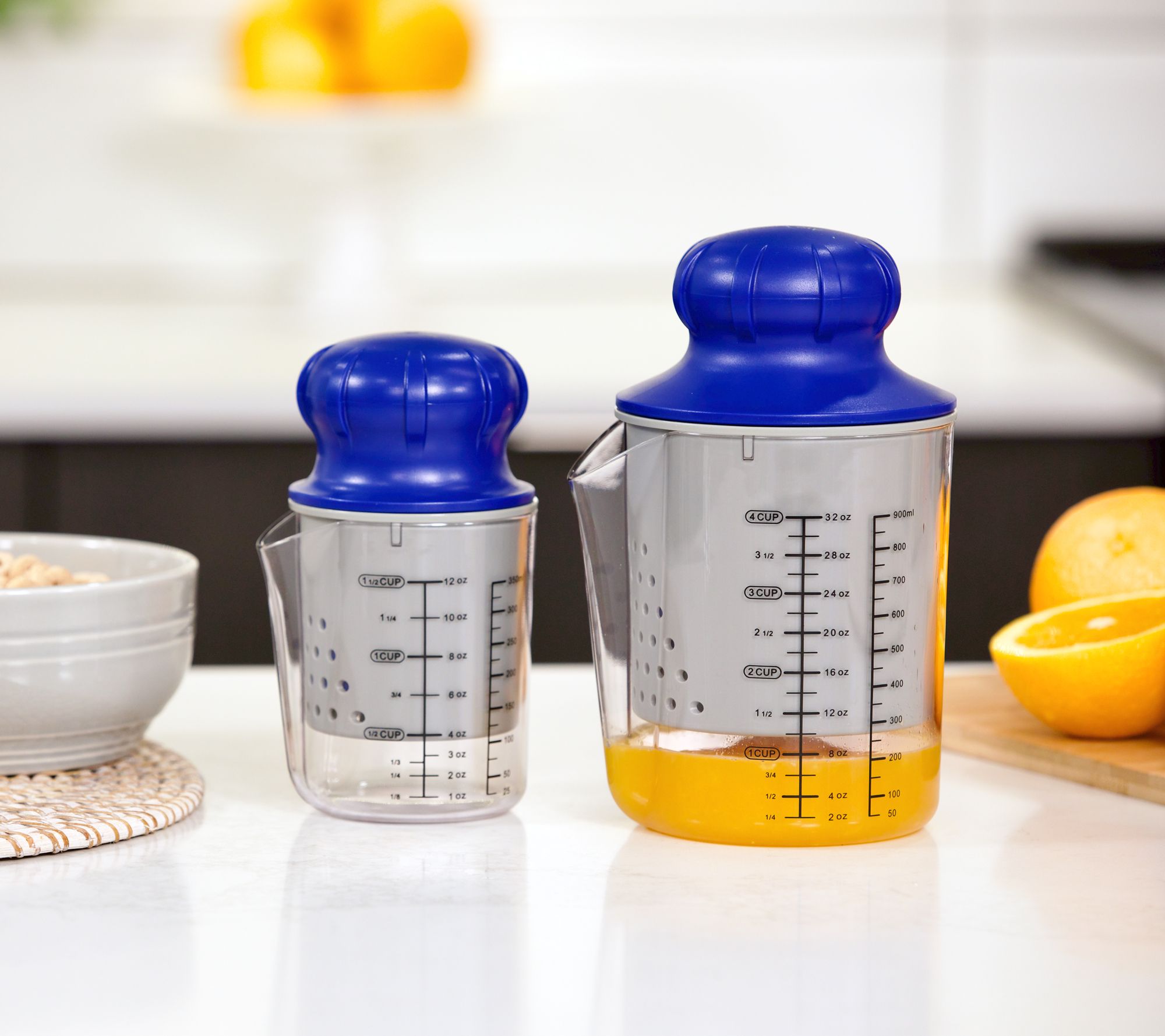 Enjoy fresh-squeezed juice from lemons, limes, oranges, and more with this set of citrus juicers. The plunger pushes the citrus fruit against the reamer, allowing maximum juice extraction. The clear base has measurement markings and a convenient pour spout, so you'll get the exact amount every time. From Avobagel.