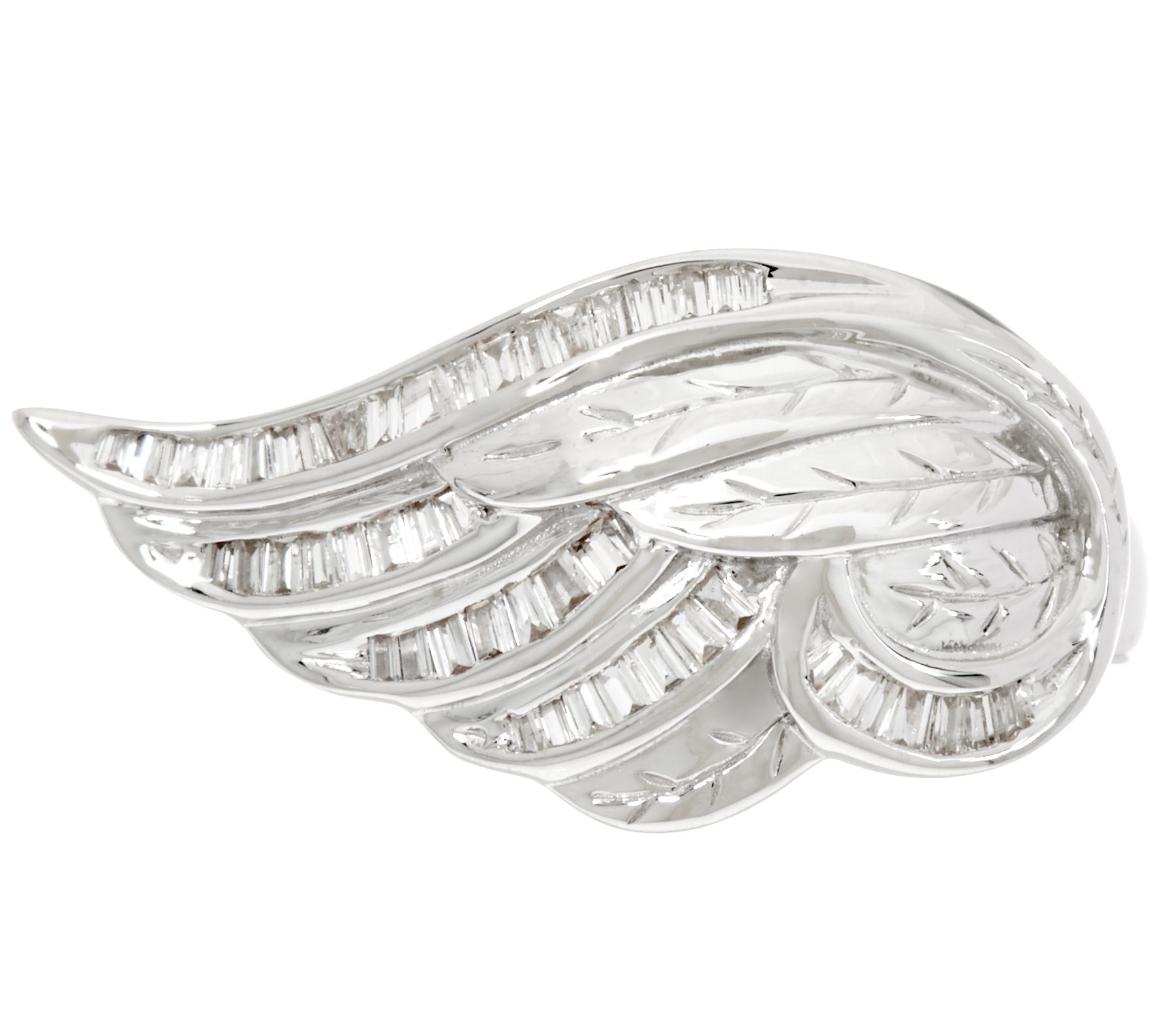 • Textured angel wing design; channel-set, baguette white diamonds; polished shank