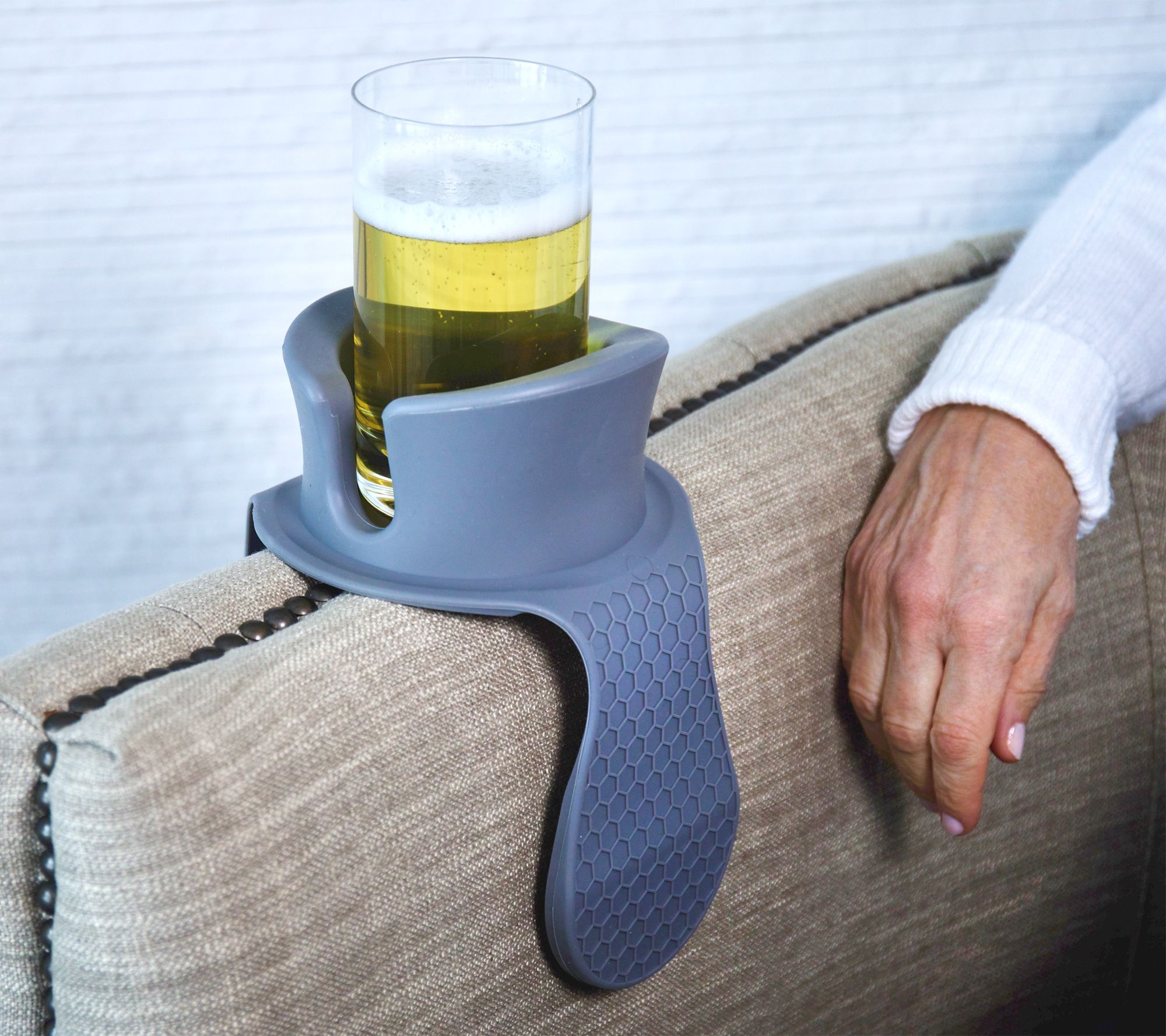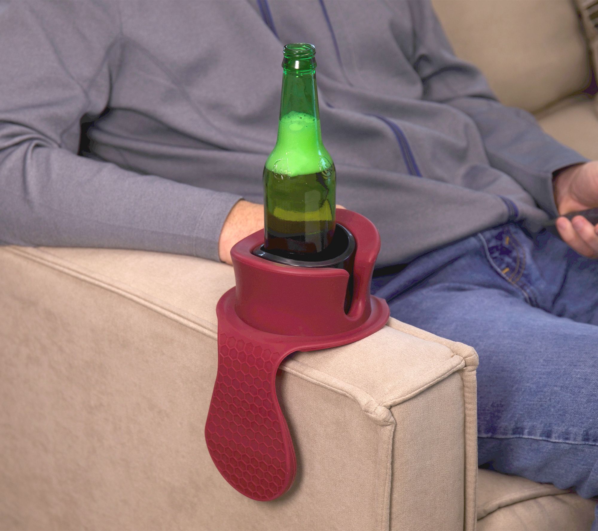 Need a place to put your drink? If a table is out of reach, create a space for your beverage with this balanced drink holder. A flexible, weighted silicone base with cup holder fits over a sofa or chair arm and stays put with a tacky base, so there's always a place to put your glass, can, bottle, mug -- even your TV remote.