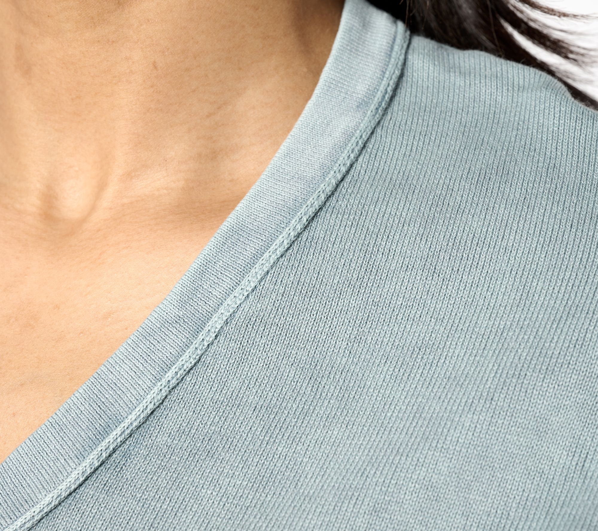 • Features: sunbleached effect, reverse seam detailing at V-neckline and short sleeves