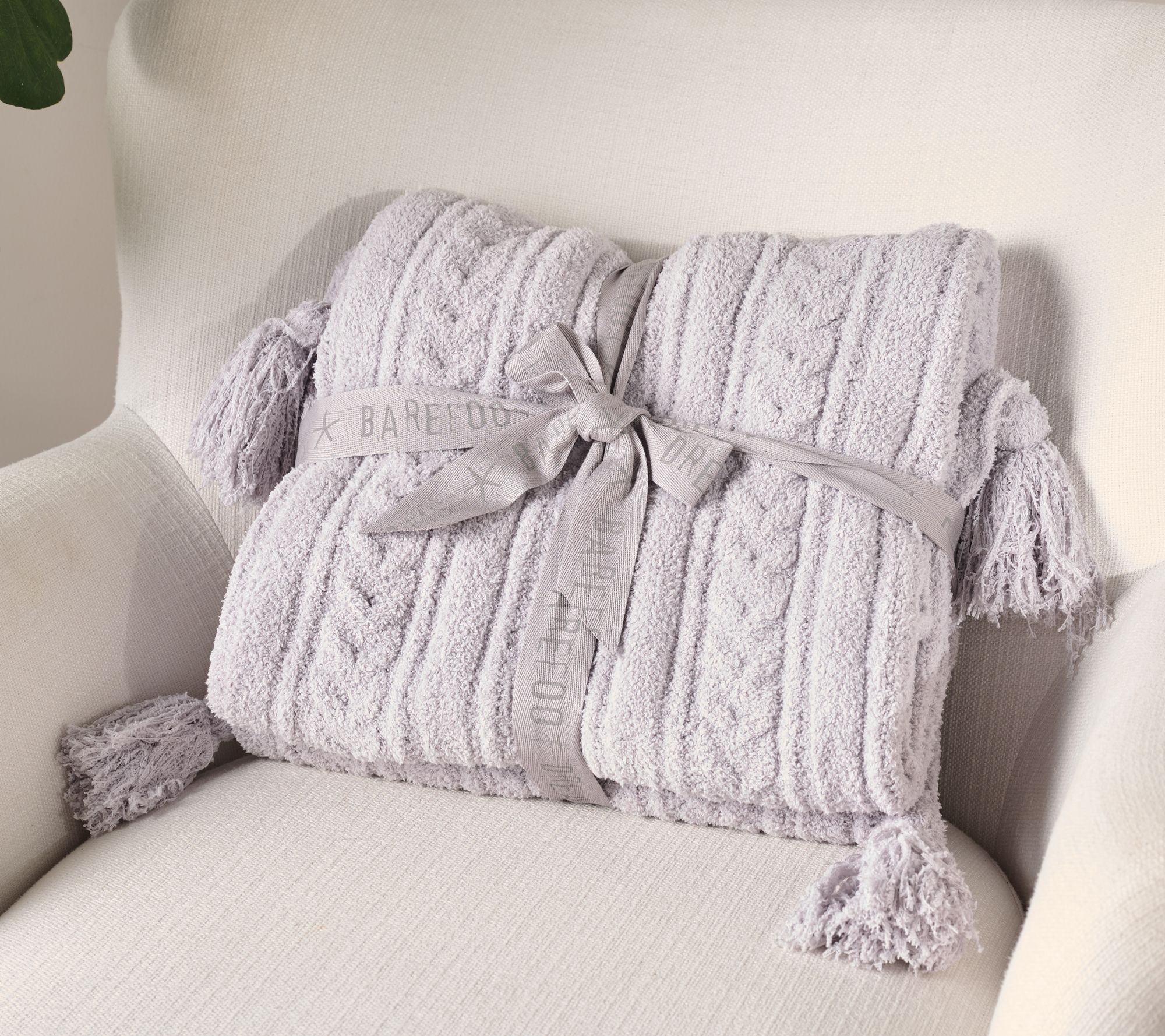When the urge to unwind calls, a plush Barefoot Dreams cable-knit blanket with playful tassels is never far behind. Whether tossed over an armchair or layered at the end of your bed, this inviting piece brings warmth and style with its intricate stitching and uber-soft touch. It's a thoughtful way to treat yourself or someone special. From Barefoot Dreams.