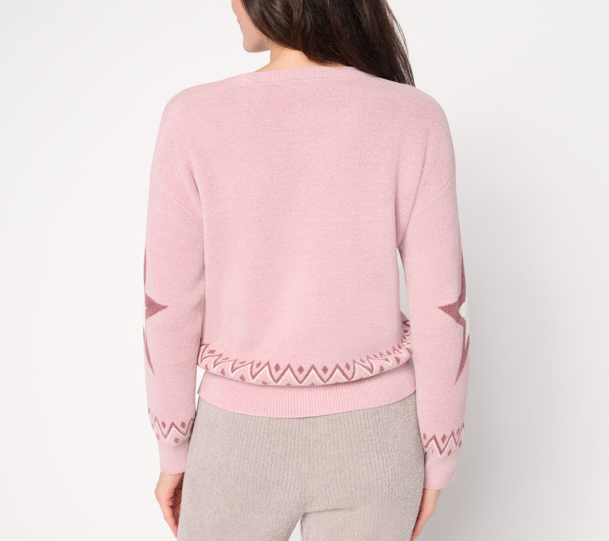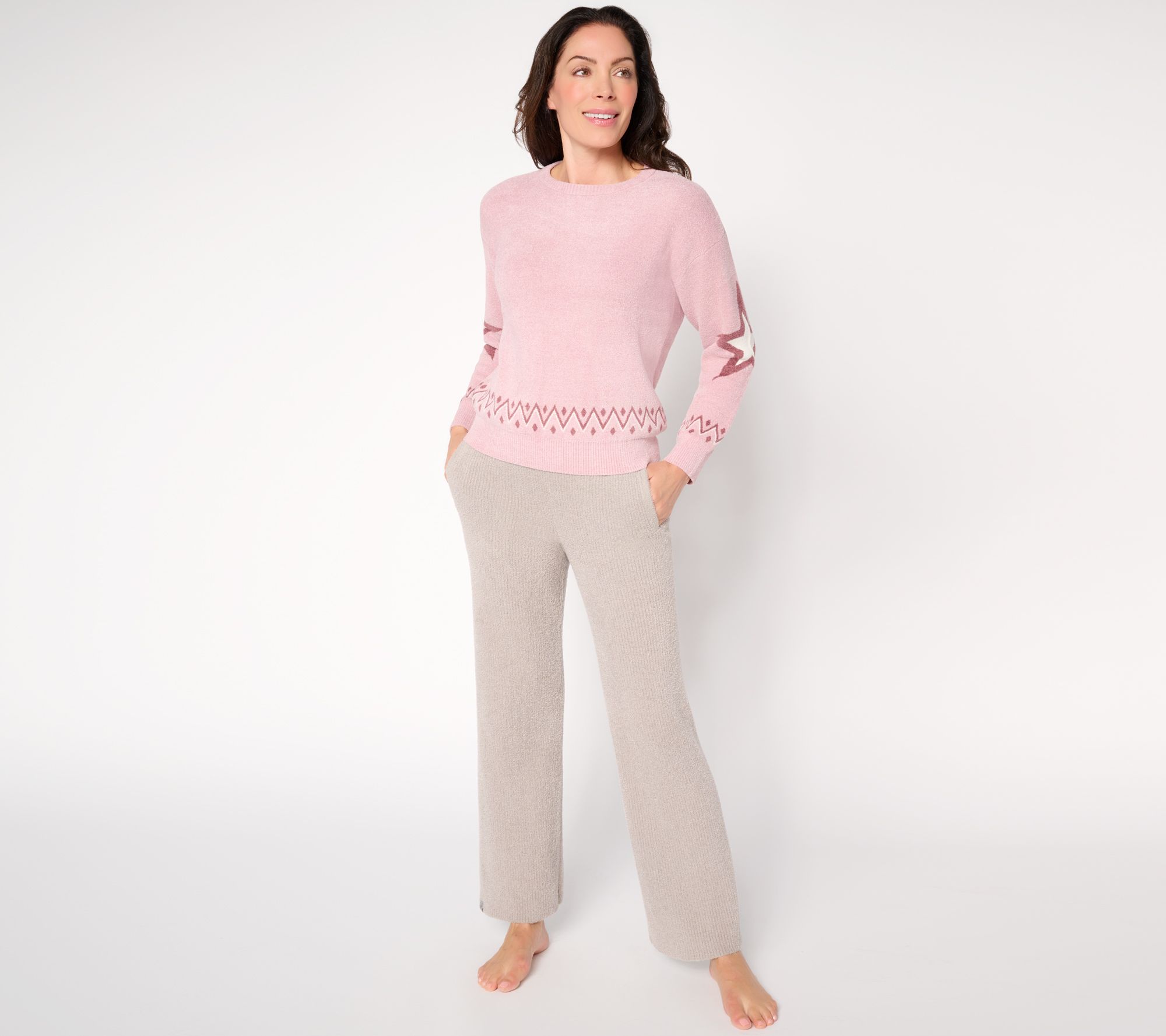 Early mornings or evening strolls are effortless with this soft crew-neck pullover, featuring a playful star detail and classic fair isle-inspired patterning on the sleeves and hem. The relaxed fit offers easy layering over your favorite tees or tanks, ready for lounging at home or stepping out in style. From Barefoot Dreams.