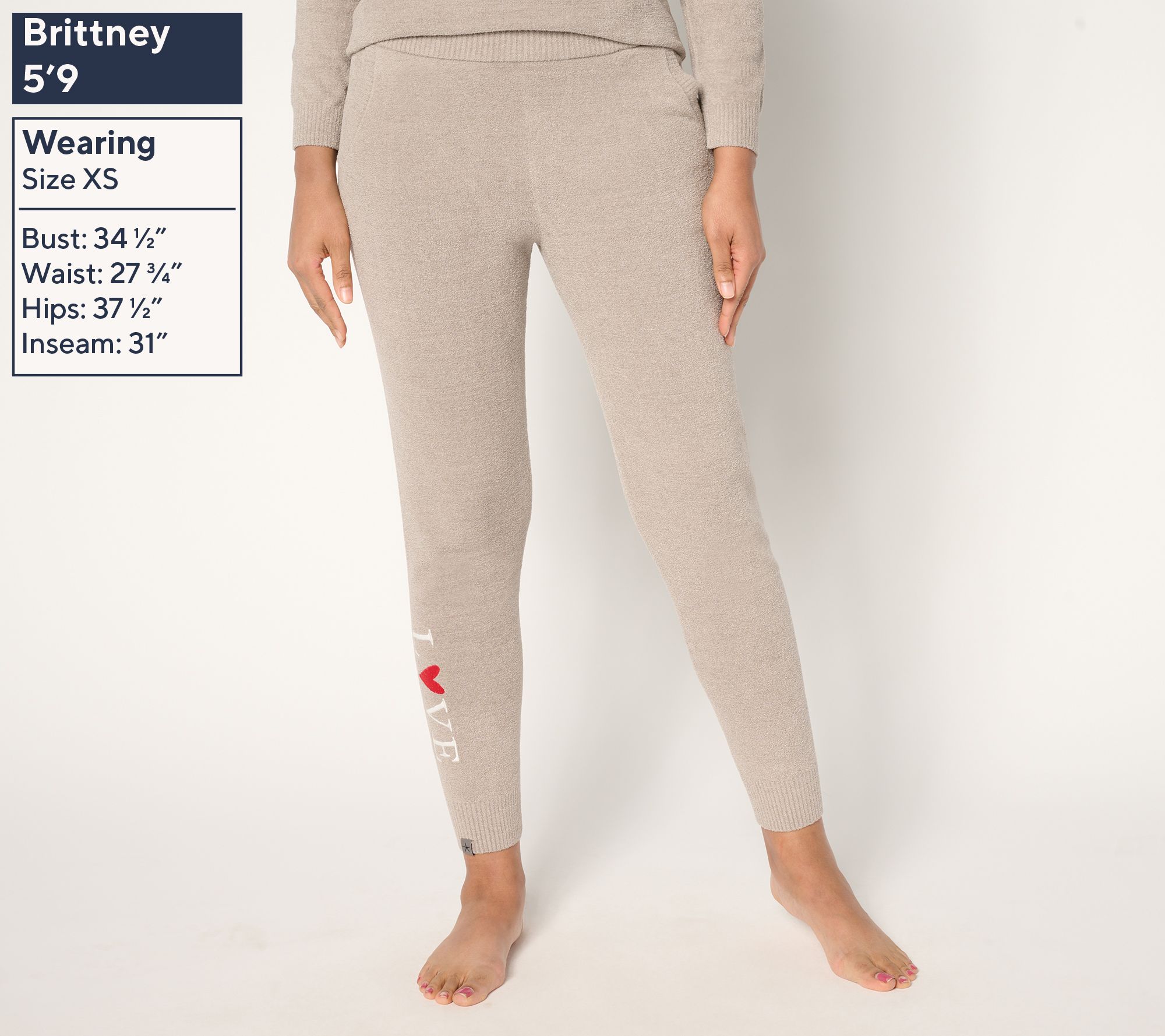 • Features: ribbed encased elastic waistband, side pockets, "Love" detail on leg