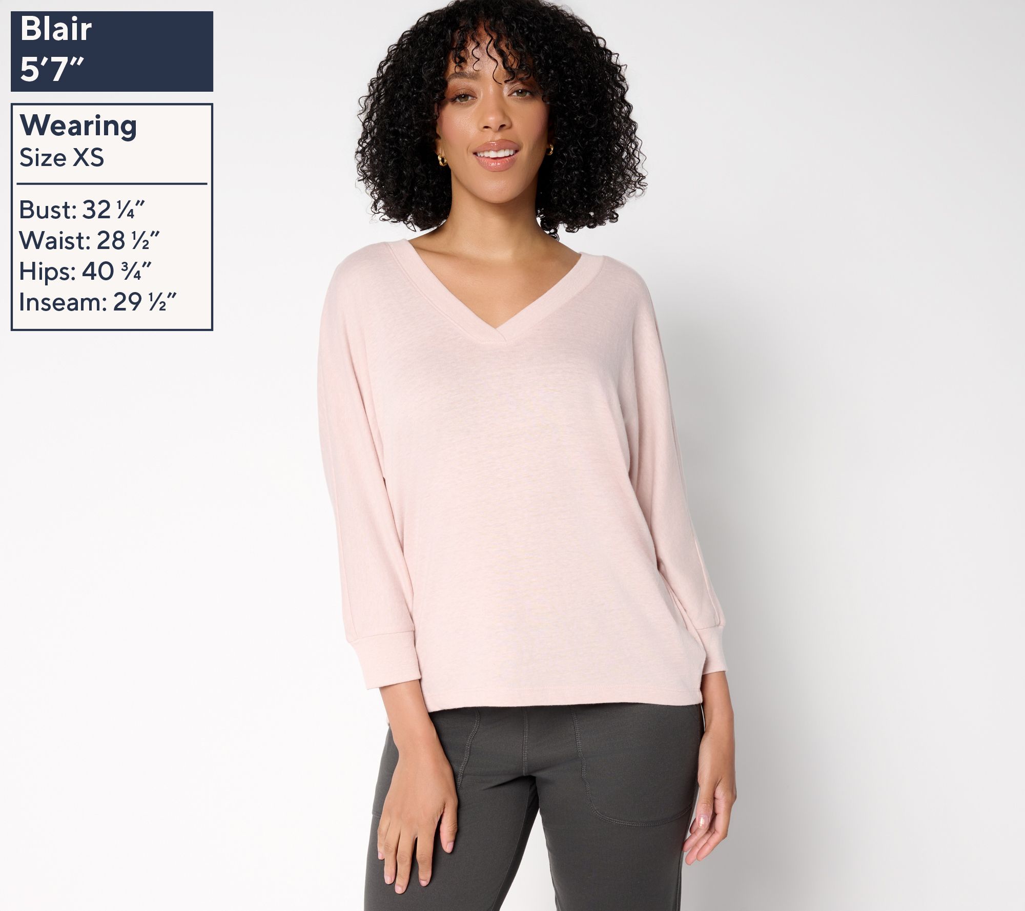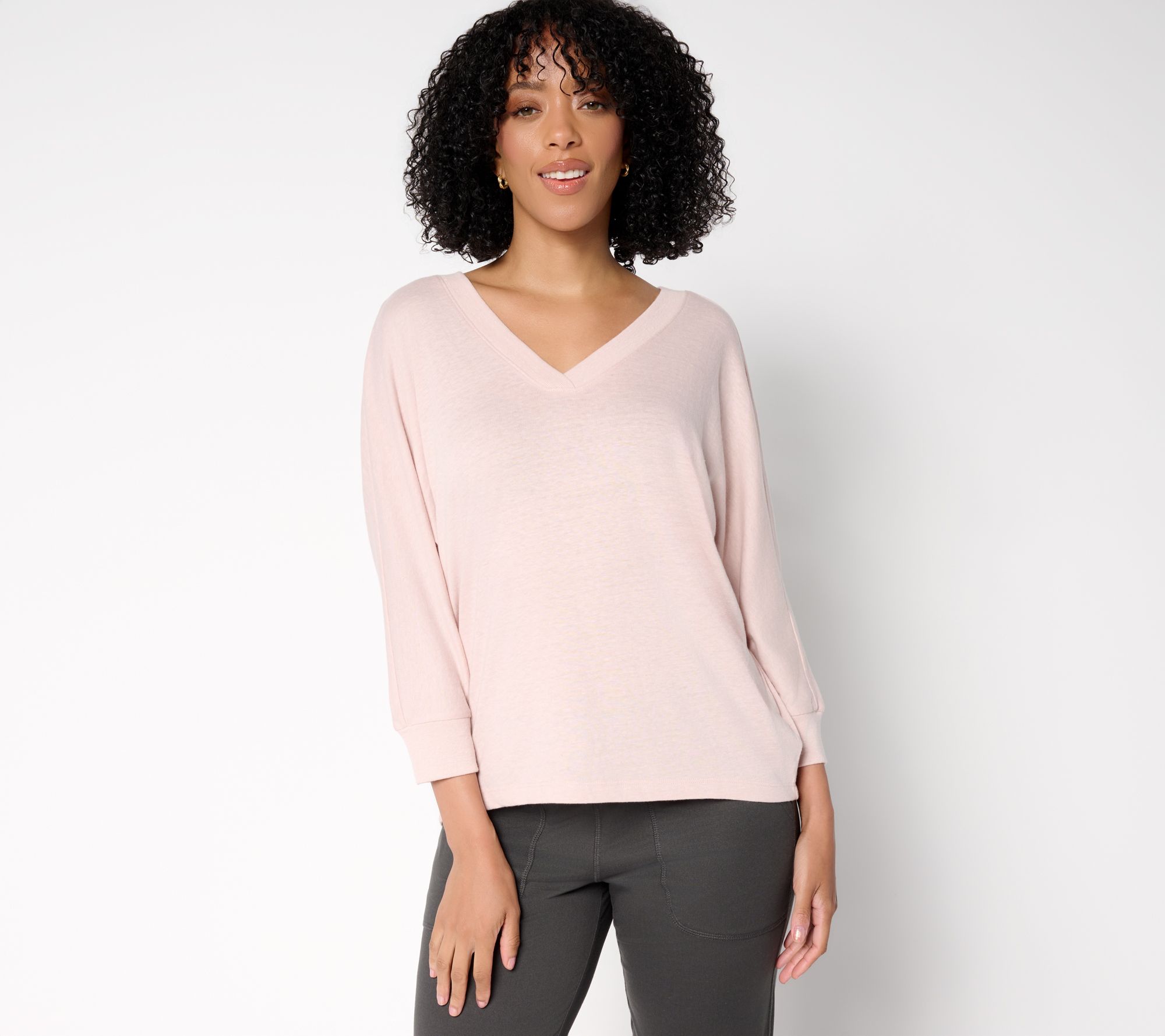 • Features: V-neckline with ribbing, ribbed cuffs, 3/4-length sleeves, hi/low hem