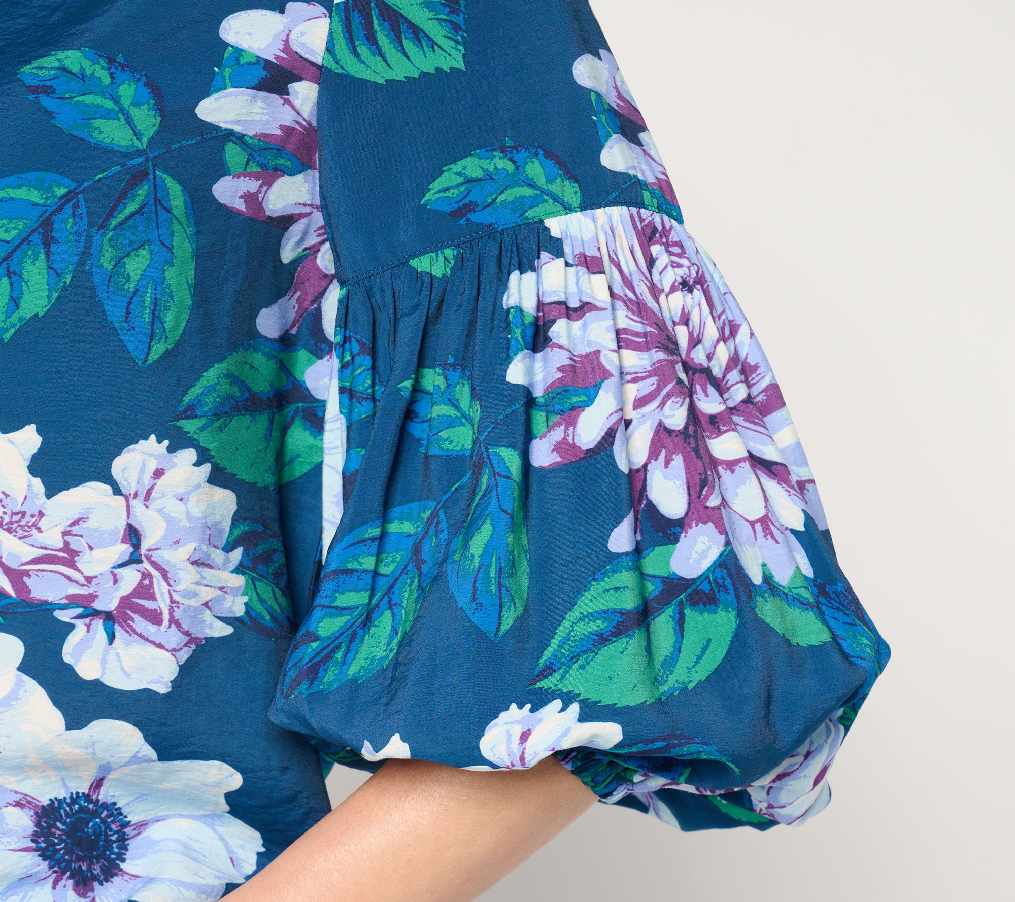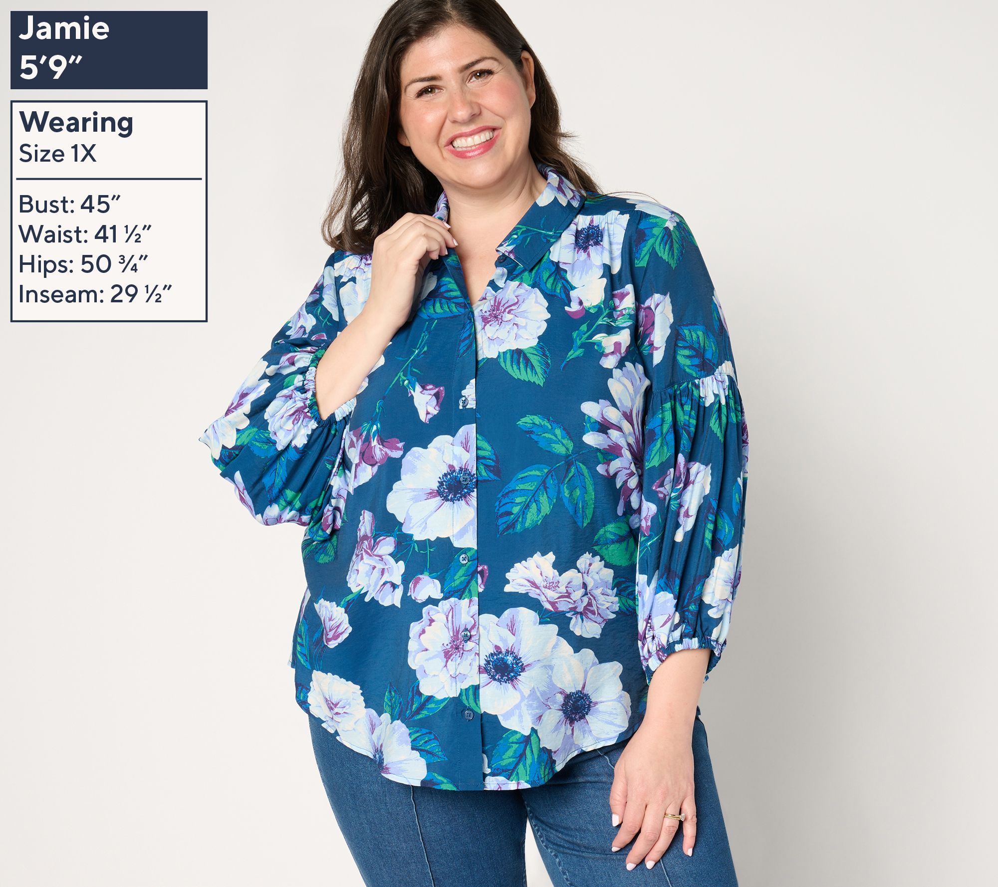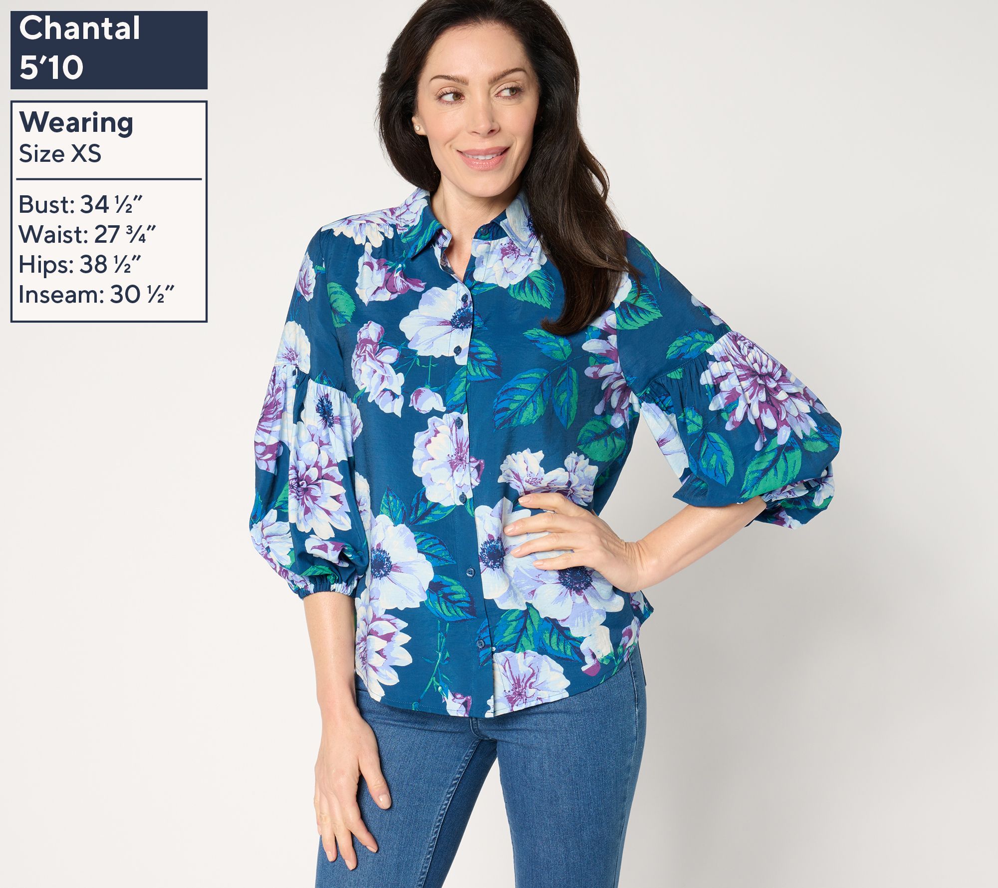 • Features: allover floral print, button-front closure, two-ply collar, forward shoulder seam with shirring, 3/4-length blouson sleeves with shirring at seam and encased elastic cuff