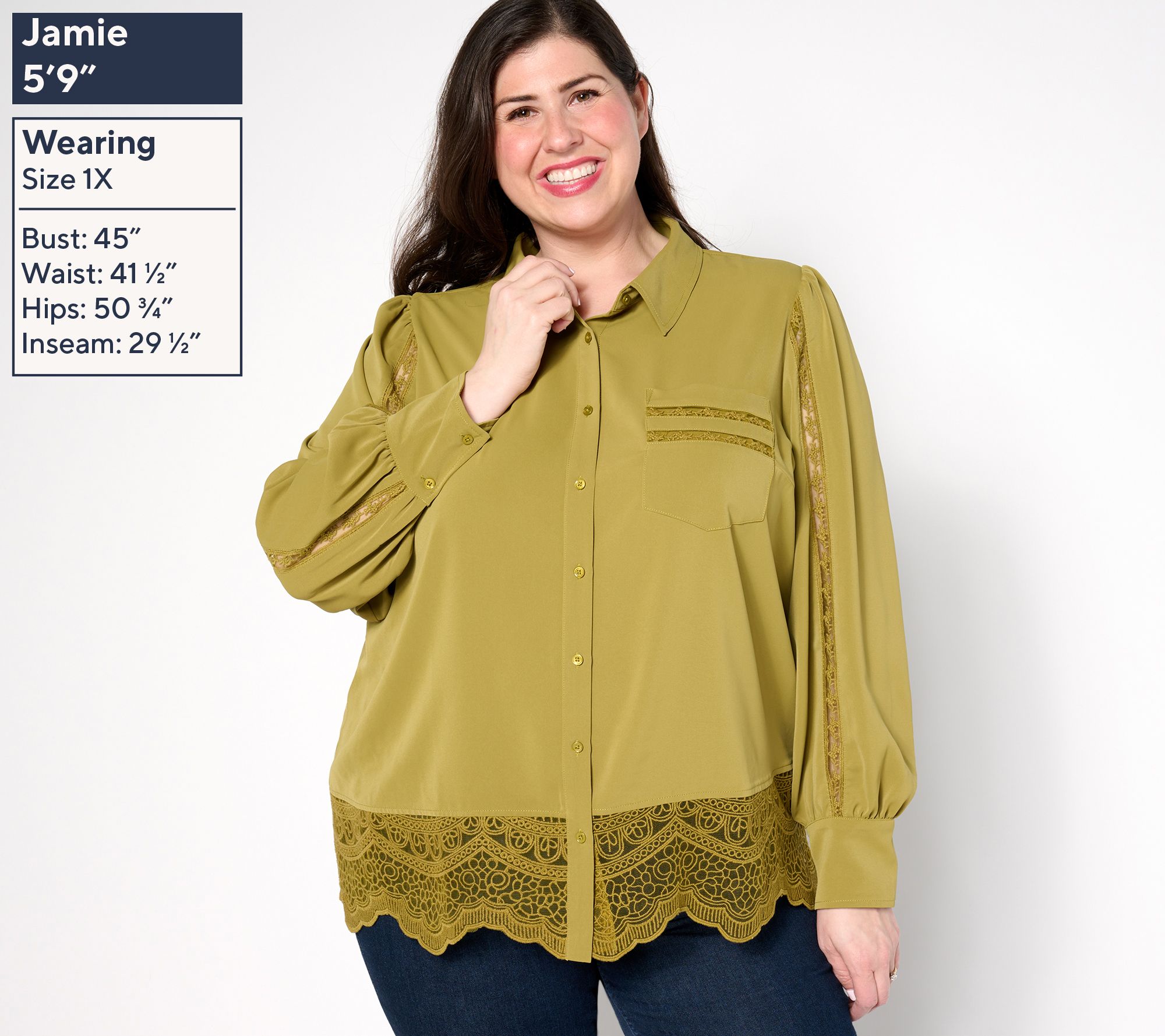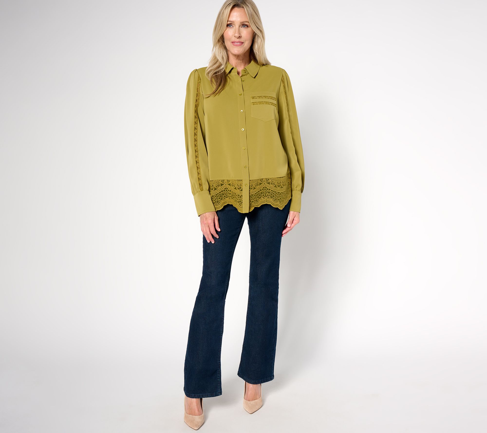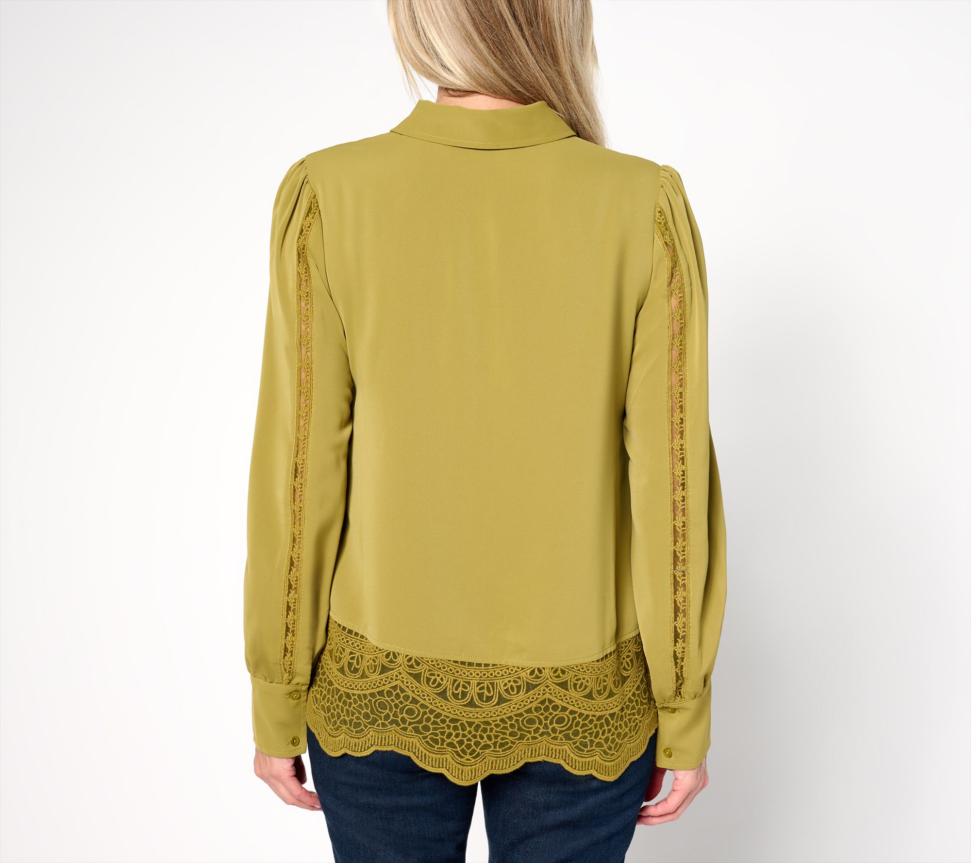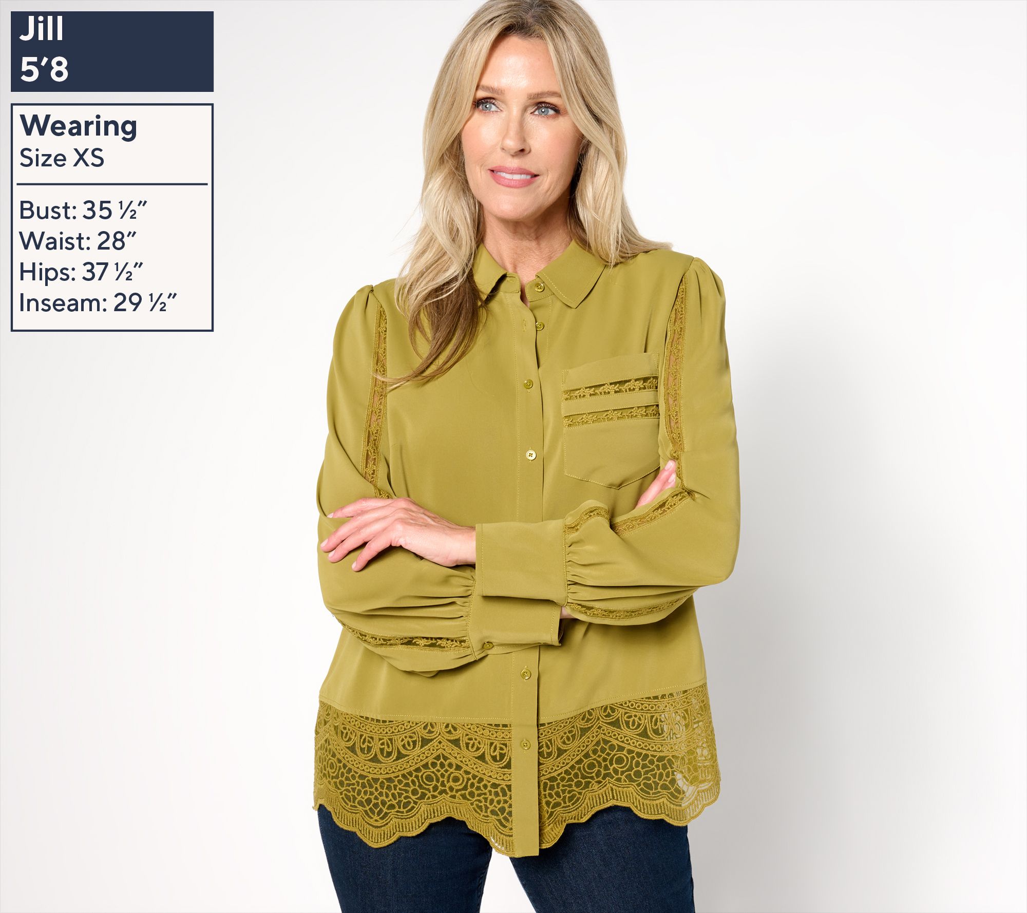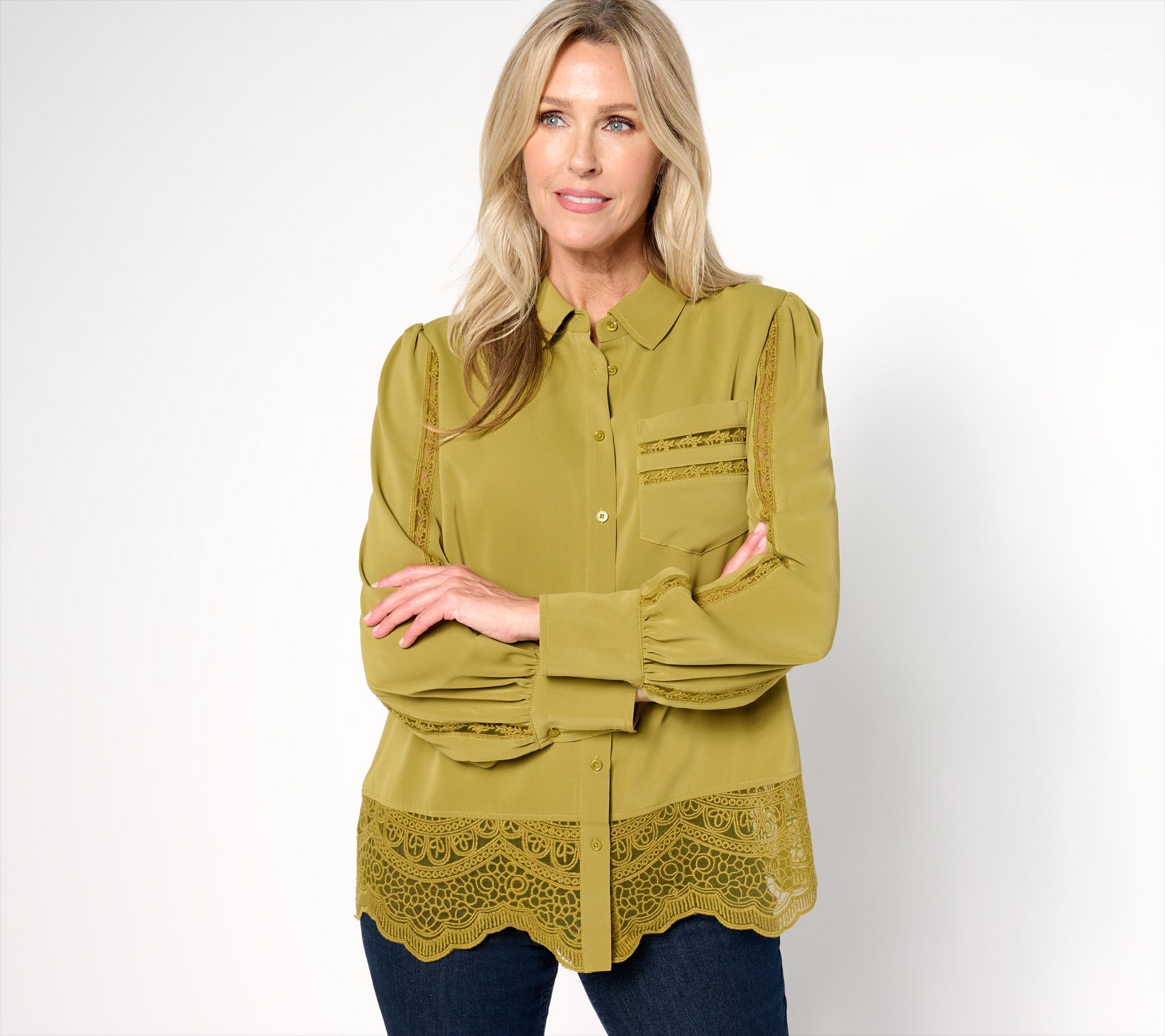 Kick start your next style chapter in this lace-trimmed shirt. Whether you're meeting up with a prospective client, lifelong friends, or an intriguing dinner date (yes!), the updated button-front gives off cool, confident, and collected vibes. From BEAUTIFUL by Lawrence Zarian.