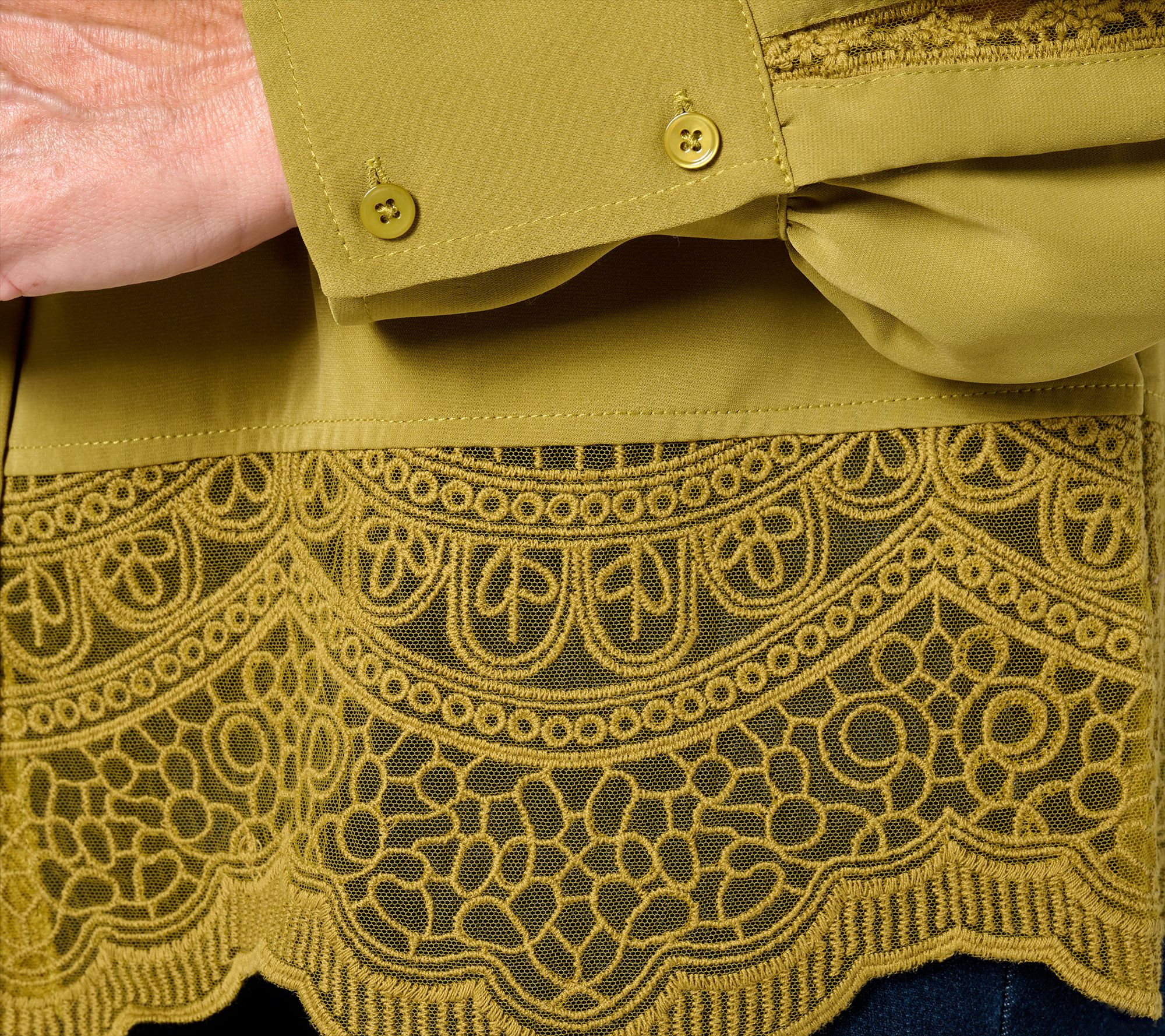 • Features: two-ply collar, long blouson sleeves with shirring and lace details, button cuffs, lace inset under curved body hem