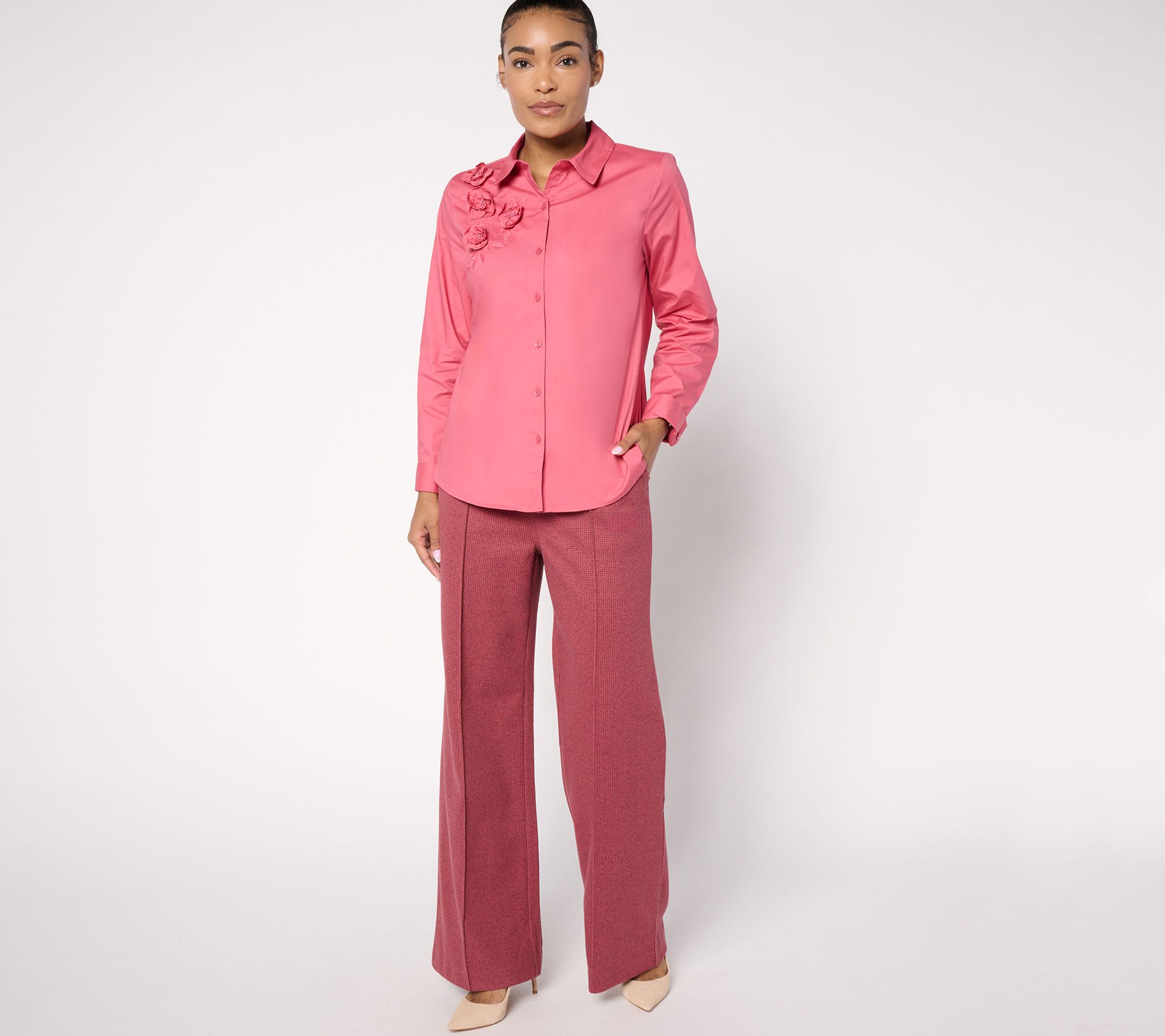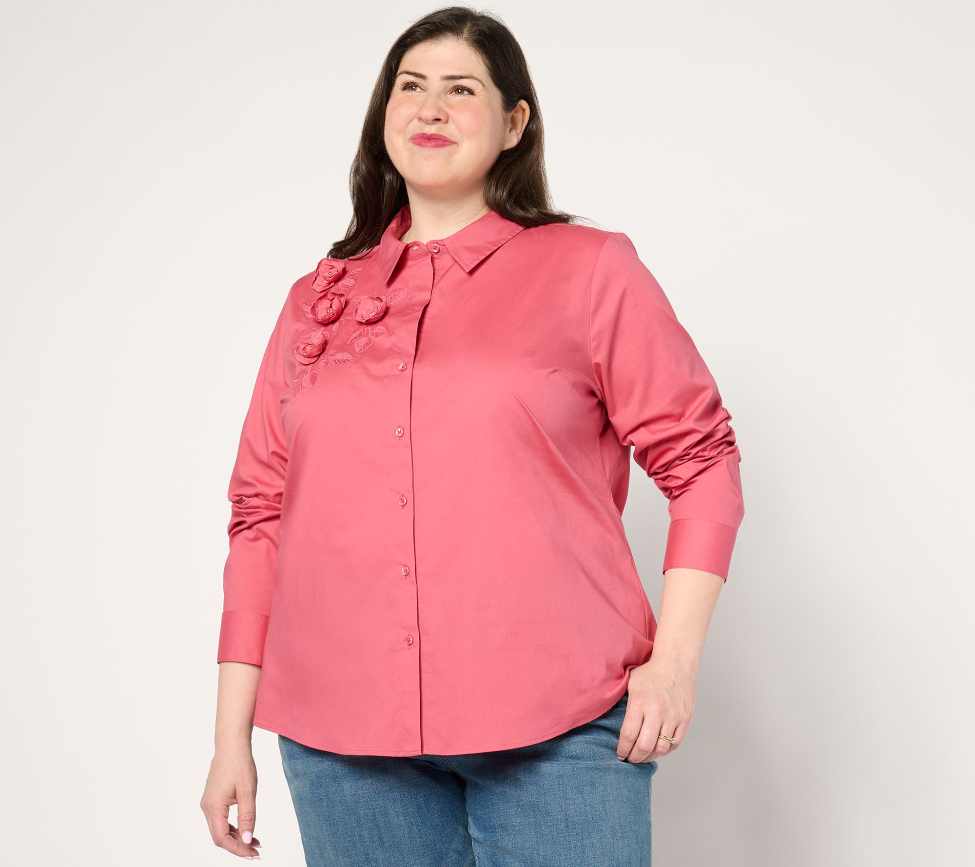 Looking for something new under the button-front sun? This elegant shirt in smooth stretch poplin showcases a boutonniere-like spray of floral embellishments -- to refresh your polished-professional looks just like that. BEAUTIFUL by Lawrence Zarian