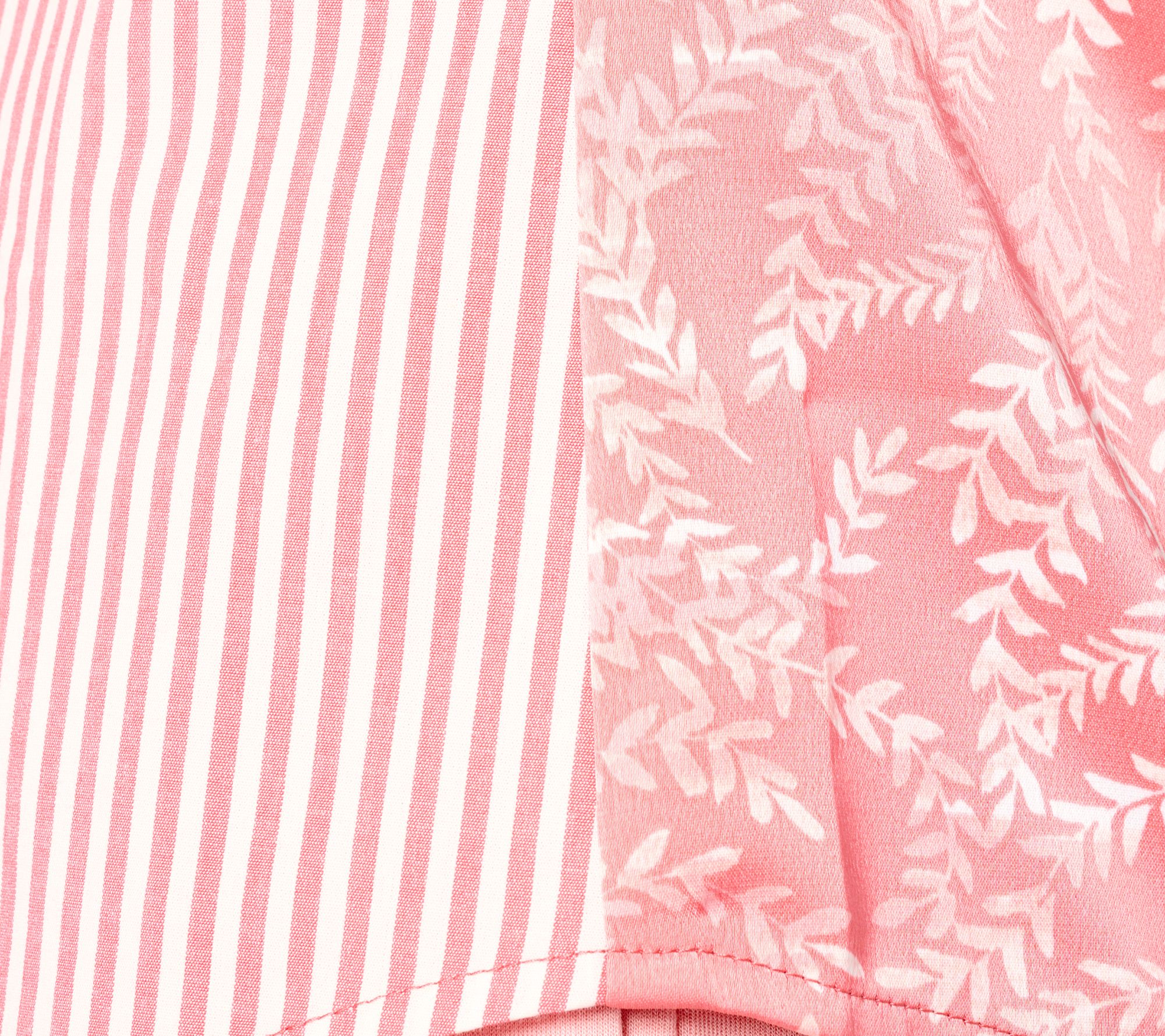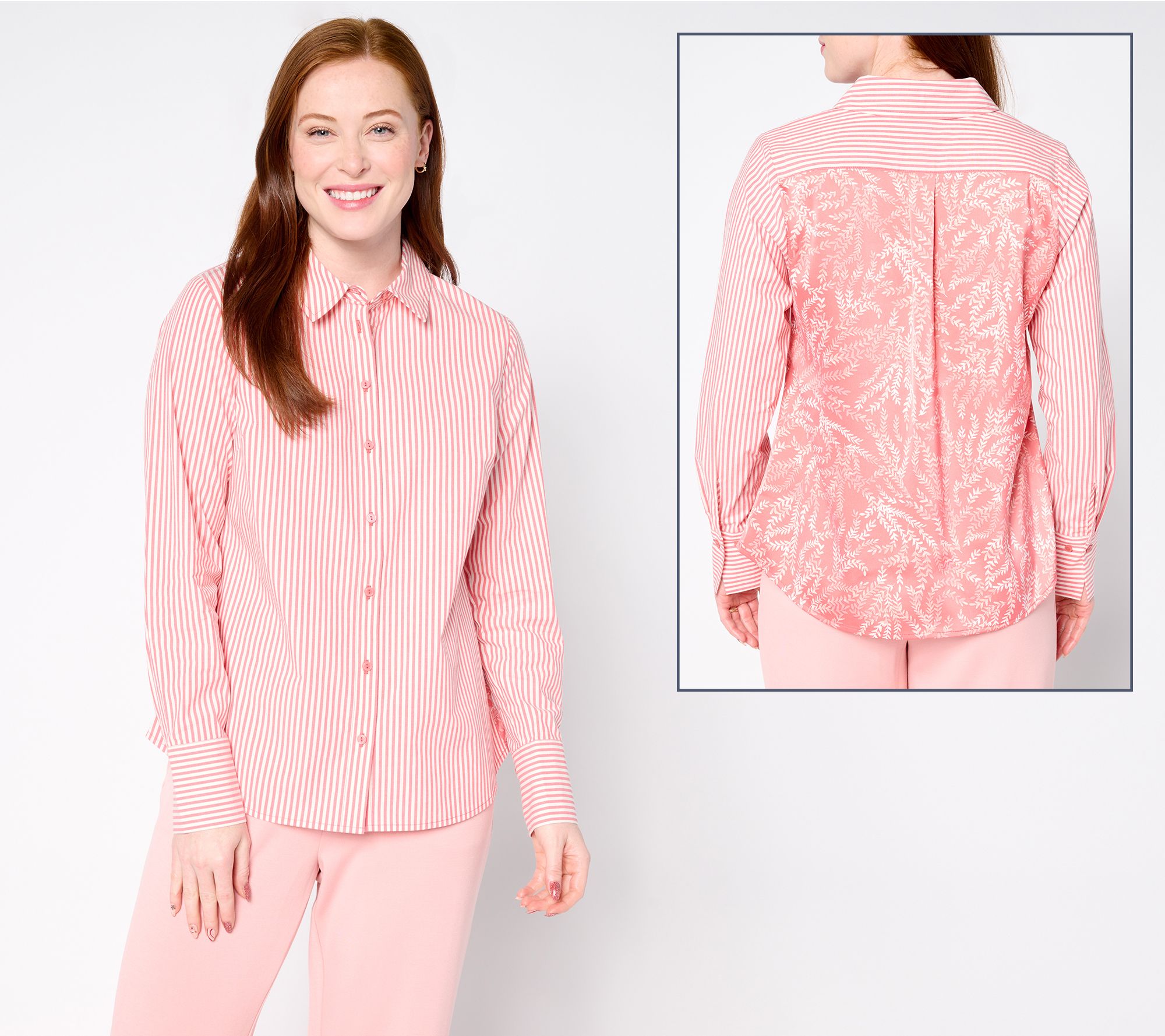 A beauty from every angle, this button-front shirt features sleek stripes on the front and a coordinating print on the back. The double turnback button-front placket and joy cuff complete the playful yet polished look. From BEAUTIFUL by Lawrence Zarian.