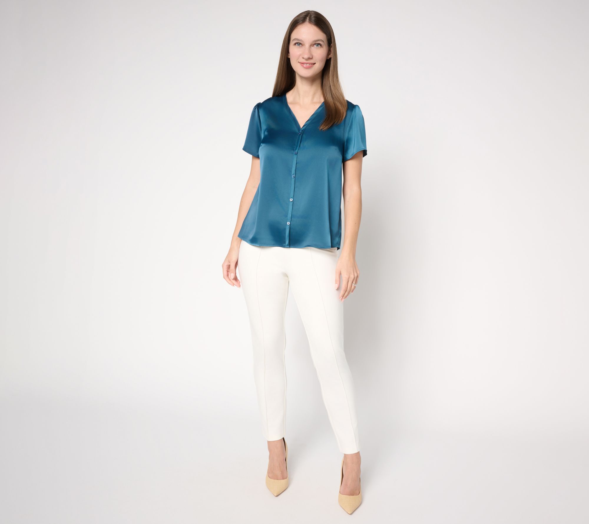 Classic, not cumbersome. No more fumbling with buttons to create your next fashion statement. This silky smooth top looks like a classic button down, but there's a secret to the sophisticated look -- those buttons are just for decoration! Whether you're heading to the office or to a lovely lunch with friends, put this top in the mix to make a polished impression every time. From BEAUTIFUL by Lawrence Zarian.
