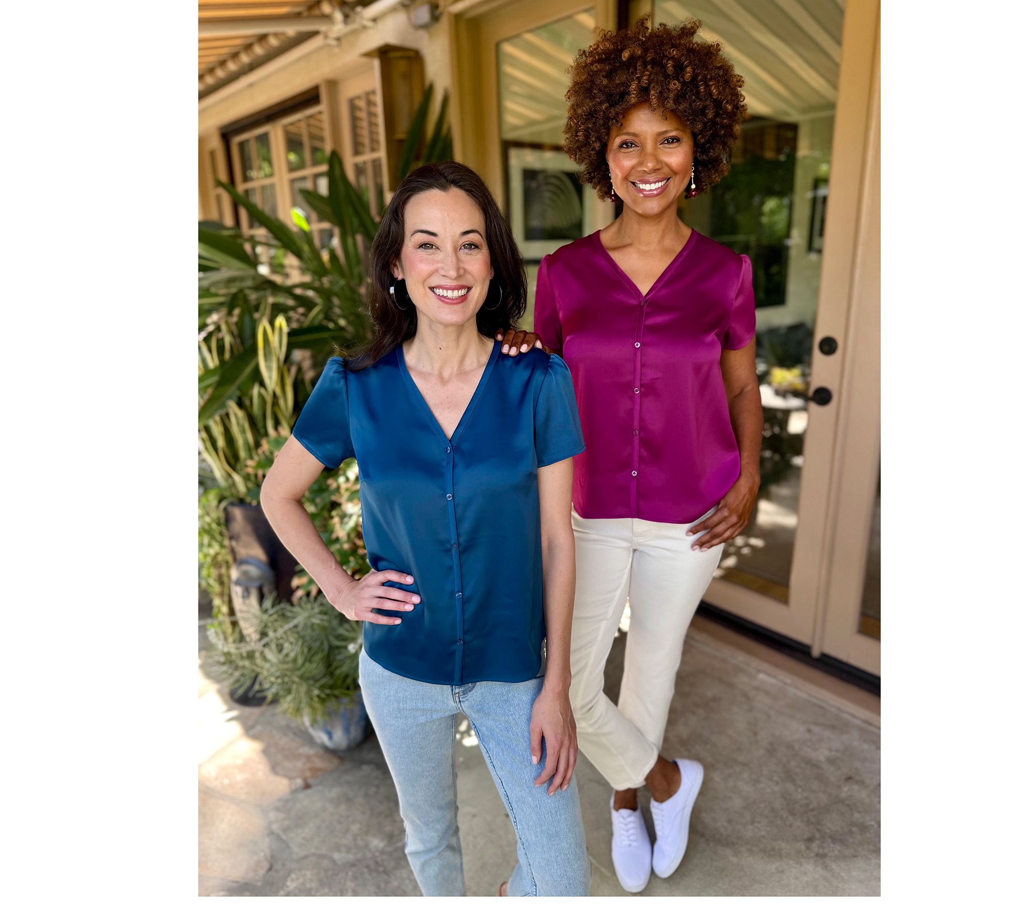 • Features: clean finished neckline with self binding, non-functional center front placket, bust darts, double turnback hem, shirring at sleeve cap