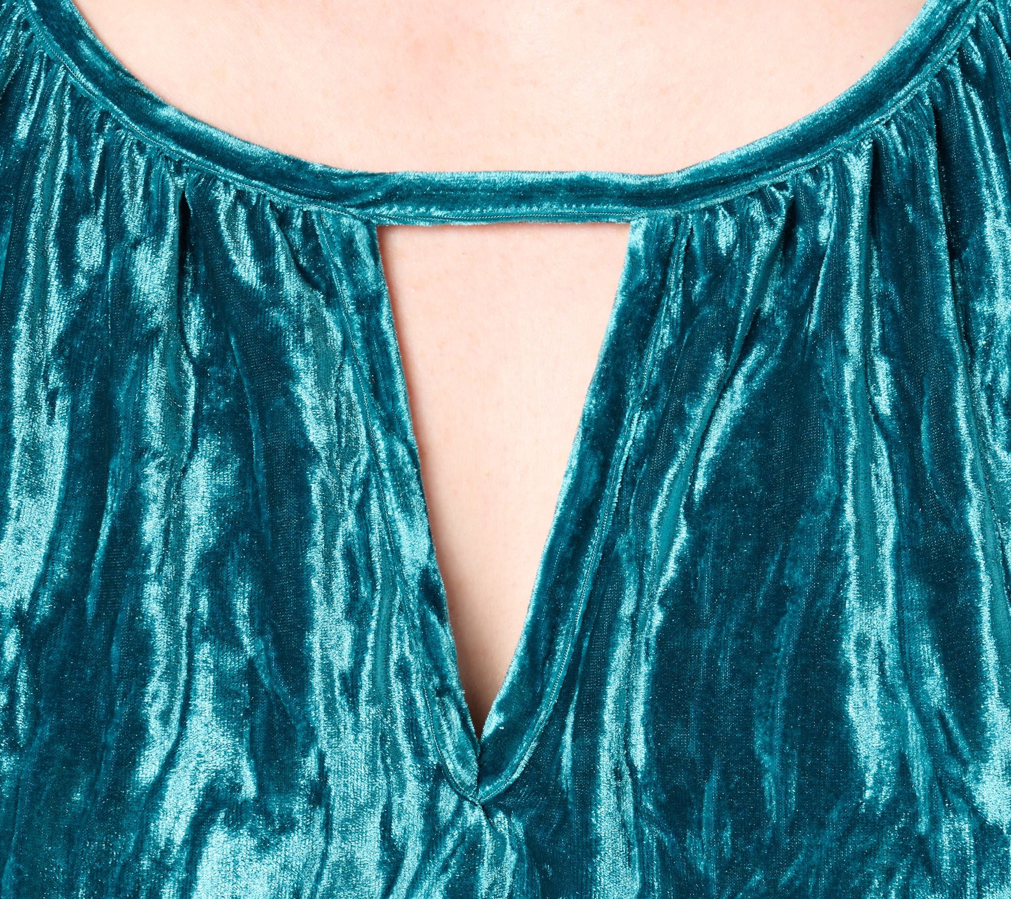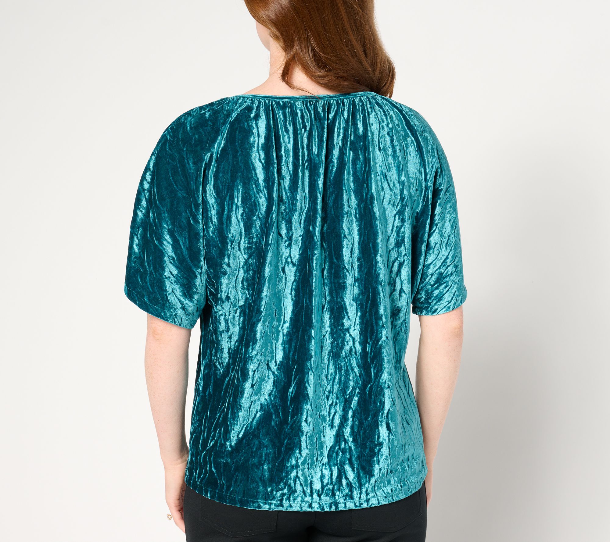 Drape yourself in the luxurious feel of the Beautiful Crinkle Velvet Top by Lawrence Zarian®. With its sophisticated V-neckline cutout and elegant elbow-length dolman sleeves, this top is perfect for adding a touch of modern glamour to your wardrobe. From BEAUTIFUL by Lawrence Zarian.